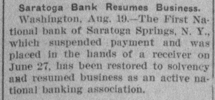 Saratoga Bank Resumes Business. Washington, Aug. 19.-The First National bank of Saratoga Springs, N. Y., which suspended payment and was placed in the hands of a receiver on June 27, has been restored to solvency and resumed business as an active national banking association.