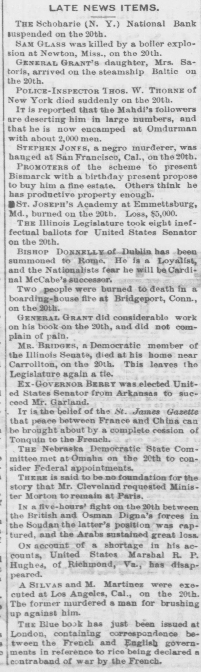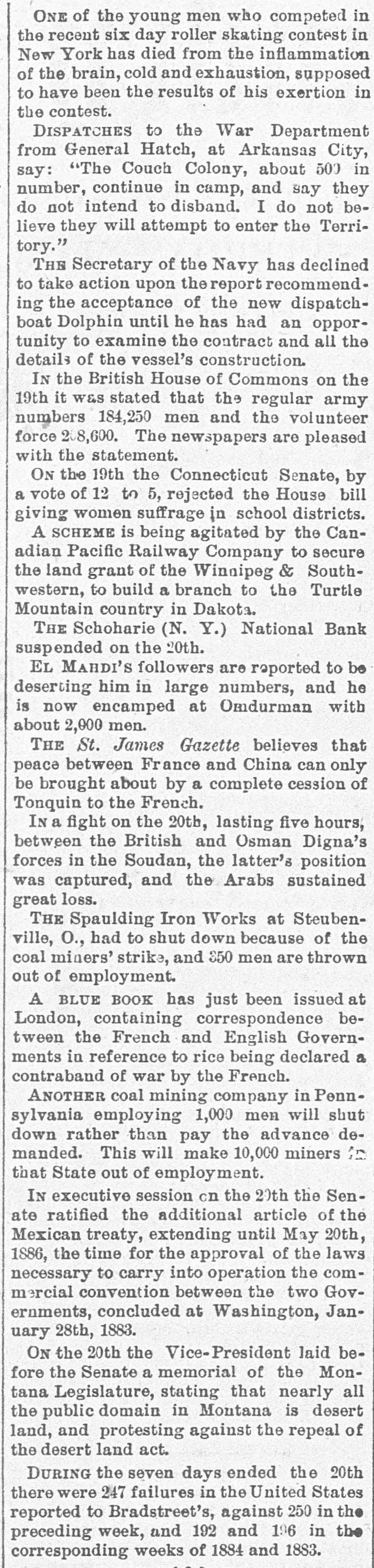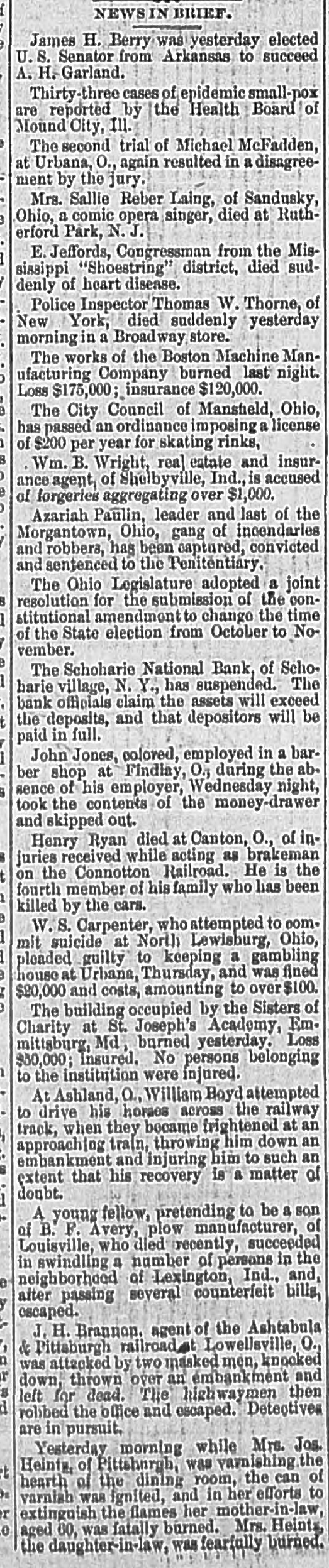 NEWS BRIEF. James H. Berry was yesterday elected U.S. Senator from Arkansas to succeed A. H. Garland. Thirty three cases of epidemic small-pox are reported by the Health Board of Mound City, Ill. The second trial of Michael McFadden, at Urbana, O., again resulted in a disagreement by the jury. Mrs. Sallie Reber Laing, of Sandusky, Ohio, a comic opera singer, died at Rutherford Park, N. J. E. Jeffords, Congressman from the Mississippi "Shoestring" district, died suddenly of heart disease. Police Inspector Thomas W. Thorne, of New York, died suddenly yesterday morning in a Broad way store. The works of the Boston Machine Manufacturing Company burned last night. Loss $175,000; insurance $120,000. The City Council of Mansheld, Ohio, has passed an ordinance imposing a license of $200 per year for skating rinks, Wm. B. Wright, real eatate and insurance agent of Shelbyville, Ind., is accused of lorgeries aggregating over $1,000. Azariah Paulin, leader and last of the Morgantown, Ohio, gang of incendarles and robbers, has been captured, convicted and sentenced to the Penitentiary, The Ohio Legislature adopted a joint resolution for the submission of the constitutional amendment to change the time of the State election from October to November. The Schoharie National Bank, of Scho harie village, N. Y., has suspended. The bank officials claim the assets will exceed the deposits, and that depositors will be paid in full. John Jones, colored, employed in a barber shop at Findlay, On during the ab sence of his employer, Wednesday night, took the contents of the money-drawer and skipped out. Henry Ryan died at Canton, O., of in juries received while acting as brakeman on the Connotton Railroad. He is the fourth member of his family who has been killed by the cars. W.S Carpenter, who attempted to oommit suicide at North Lewisburg, Ohio, pleaded guilty to keeping a gambling house at Urbana, Thursday, and was fined $20,000 and costs, amounting to over $100. The building occupied by the Sisters of Charity at St. Joseph's Academy, Em. mittsburg, Md, barned yesterday. Loss $50,000; insured. No persons belonging to the institution were injured. At Ashland, O., William Boyd attempted to drive his horaes across the railway track, when they became frightened at an approaching train, throwing him down an embankment and injuring him to such an extent that his recovery is a matter of doubt. A young fellow, pretending to be a son of B. F. Avery, plow manufacturer, of Louisville, who died recently, succeeded in swindling a number of persons in the neighborhood of Lexington, Ind., and, after passing several counterfeit bills, oscaped. H. Brannon. agent of the Ashtabula Pittsburgh railroad at Lowellsville, Q., was attacked by two masked men, knocked down, thrown over an embankment and left for dead. The highwaymen then robbed the office and escaped. Detectives are in pursuit, Yesterday morning while Mrs. Jos. Heinty, of Pittshurgh, was varnishing the hearth of the dining room, the can of varniah was Ignited, and in her efforts to extinguish the flames her mother-in-law, 0 aged 60, was fatally burned. Mrs. Heints, the daughter-in-law, was fearfully burned.
