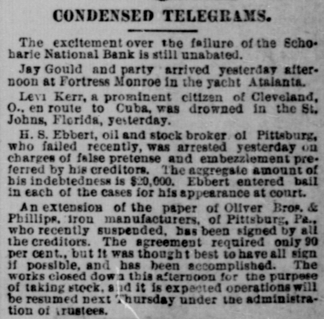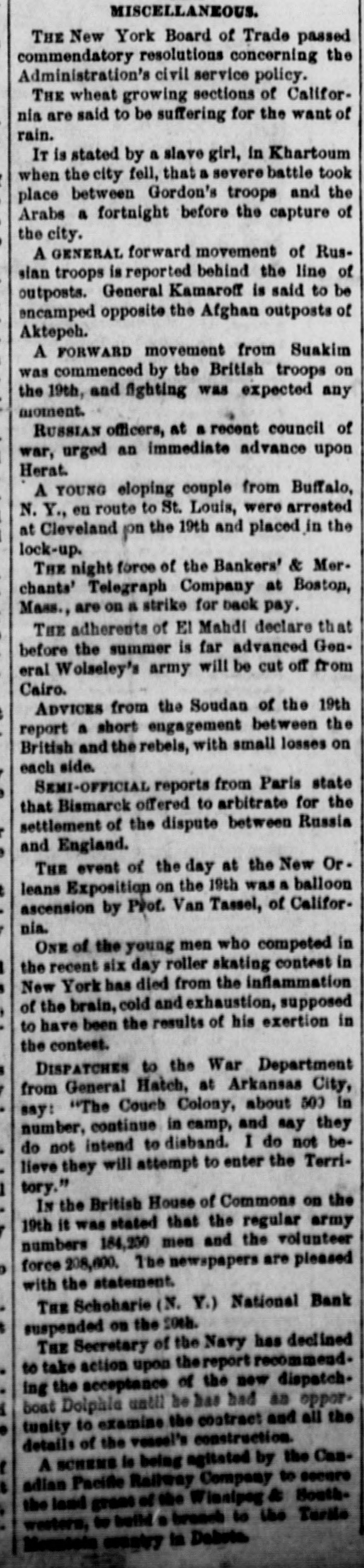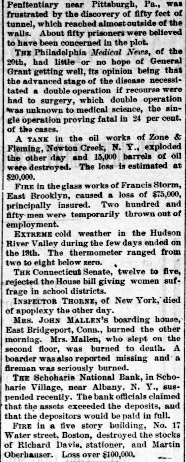 NEWS BRIEF. James H. Berry was yesterday elected U.S. Senator from Arkansas to succeed A. H. Garland. Thirty three cases of epidemic small-pox are reported by the Health Board of Mound City, Ill. The second trial of Michael McFadden, at Urbana, O., again resulted in a disagreement by the jury. Mrs. Sallie Reber Laing, of Sandusky, Ohio, a comic opera singer, died at Rutherford Park, N. J. E. Jeffords, Congressman from the Mississippi "Shoestring" district, died suddenly of heart disease. Police Inspector Thomas W. Thorne, of New York, died suddenly yesterday morning in a Broad way store. The works of the Boston Machine Manufacturing Company burned last night. Loss $175,000; insurance $120,000. The City Council of Mansheld, Ohio, has passed an ordinance imposing a license of $200 per year for skating rinks, Wm. B. Wright, real eatate and insurance agent of Shelbyville, Ind., is accused of lorgeries aggregating over $1,000. Azariah Paulin, leader and last of the Morgantown, Ohio, gang of incendarles and robbers, has been captured, convicted and sentenced to the Penitentiary, The Ohio Legislature adopted a joint resolution for the submission of the constitutional amendment to change the time of the State election from October to November. The Schoharie National Bank, of Scho harie village, N. Y., has suspended. The bank officials claim the assets will exceed the deposits, and that depositors will be paid in full. John Jones, colored, employed in a barber shop at Findlay, On during the ab sence of his employer, Wednesday night, took the contents of the money-drawer and skipped out. Henry Ryan died at Canton, O., of in juries received while acting as brakeman on the Connotton Railroad. He is the fourth member of his family who has been killed by the cars. W.S Carpenter, who attempted to oommit suicide at North Lewisburg, Ohio, pleaded guilty to keeping a gambling house at Urbana, Thursday, and was fined $20,000 and costs, amounting to over $100. The building occupied by the Sisters of Charity at St. Joseph's Academy, Em. mittsburg, Md, barned yesterday. Loss $50,000; insured. No persons belonging to the institution were injured. At Ashland, O., William Boyd attempted to drive his horaes across the railway track, when they became frightened at an approaching train, throwing him down an embankment and injuring him to such an extent that his recovery is a matter of doubt. A young fellow, pretending to be a son of B. F. Avery, plow manufacturer, of Louisville, who died recently, succeeded in swindling a number of persons in the neighborhood of Lexington, Ind., and, after passing several counterfeit bills, oscaped. H. Brannon. agent of the Ashtabula Pittsburgh railroad at Lowellsville, Q., was attacked by two masked men, knocked down, thrown over an embankment and left for dead. The highwaymen then robbed the office and escaped. Detectives are in pursuit, Yesterday morning while Mrs. Jos. Heinty, of Pittshurgh, was varnishing the hearth of the dining room, the can of varniah was Ignited, and in her efforts to extinguish the flames her mother-in-law, 0 aged 60, was fatally burned. Mrs. Heints, the daughter-in-law, was fearfully burned.