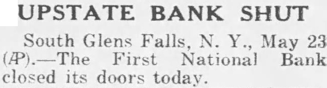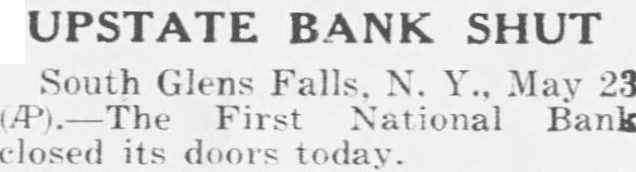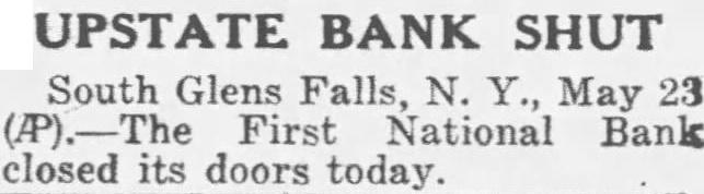 UPSTATE BANK SHUT South Glens Falls, N. Y., May 23 (P).-The First National Bank closed its doors today.