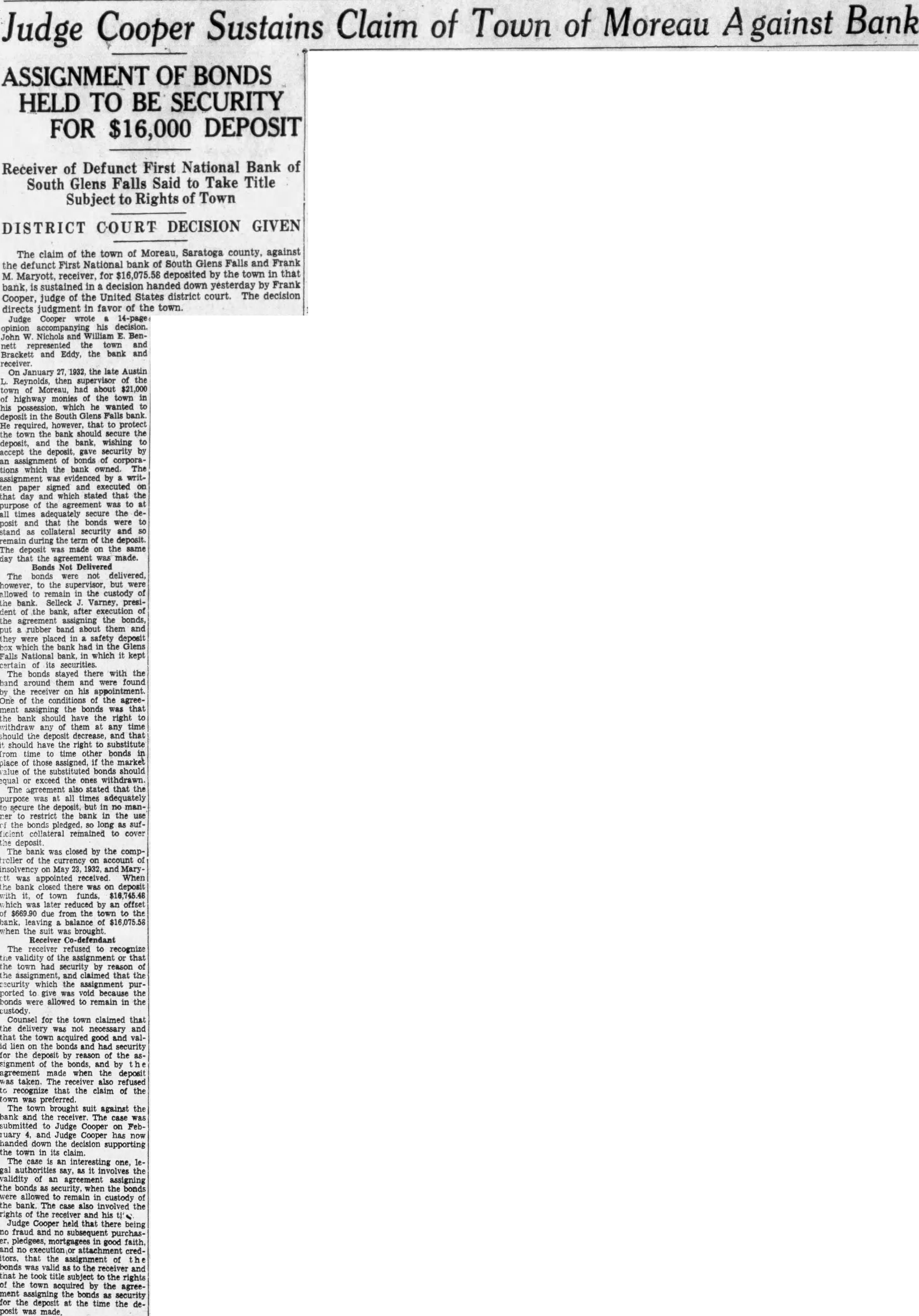 Judge Cooper Sustains Claim of Town of Moreau gainst Bank ASSIGNMENT OF BONDS HELD TO BE SECURITY FOR $16,000 DEPOSIT Receiver of Defunct First National Bank of South Glens Falls Said to Take Title Subject to Rights of Town DISTRICT COURT DECISION GIVEN The claim of the town of Moreau, Saratoga county, against the defunct First National bank of South Glens Falls and Frank M. Maryott, receiver, for $16,075.58 deposited by the town in that bank, is sustained in a decision handed down yesterday by Frank Cooper, judge of the United States district court. The decision directs judgment in favor of the town. Judge Cooper wrote 14-page opinion accompanying his decision. John W. Nichols and William E. Bennett represented the town and Brackett and Eddy, the bank and receiver On January 27, 1932, the late Austin L. Reynolds, then supervisor of the town of Moreau, had about $21,000 of highway monies of the town in his possession, which he wanted to deposit in the South Glens Falls bank He required, however, that to protect the town the bank should secure the deposit, and the bank, wishing to accept the deposit, gave security by an assignment of bonds of corporations which the bank owned. The assignment was evidenced by writ. ten paper signed and executed on that day and which stated that the purpose of the was to at all times adequately secure the deposit and that the bonds were to stand as collateral security and so remain during the term of the deposit. The deposit was made on the same day that the agreement was made. Bonds Not Delivered The bonds were not delivered, however, to the supervisor, but were allowed to remain in the custody of the bank. Selleck J. Varney, president of the bank, after execution of the agreement assigning the bonds, put rubber band about them and they were placed in safety deposit box which the bank had in the Glens Falls National bank, in which it kept certain of its securities. The bonds stayed there with the band around them and were found by the receiver on his appointment. One of the conditions of the agreement assigning the bonds was that the bank should have the right to withdraw any of them at any time should the deposit decrease, and that it should have the right to substitute from time to time other bonds in place of those assigned, if the market value of the substituted bonds should equal or exceed the ones withdrawn. The agreement also stated that the purpose was at all times adequately to secure the deposit, but in no manner to restrict the bank in the use of the bonds pledged. so long as sufficient collateral remained to cover the deposit. The bank was closed by the comptroller of the currency on account of insolvency on May 23, 1932, and Maryctt was appointed received When the bank closed there was on deposit with it, of town funds, $16,745.48 which was later reduced by an offset of $669.90 due from the town to the bank, leaving balance of $16,075.58 when the suit was brought. Receiver Co-defendant The receiver refused to recognize the validity of the assignment or that the town had security by reason of the assignment, and claimed that the security which the assignment purported to give was void because the bonds were allowed to remain in the custody Counsel for the town claimed that the delivery was not necessary and that the town acquired good and valid lien on the bonds and had security for the deposit by reason of the assignment of the bonds, and by the agreement made when the deposit was taken. The receiver also refused to recognize that the claim of the town was preferred. The town brought suit against the bank and the receiver. The case was submitted to Judge Cooper on February 4, and Judge Cooper has now handed down the decision supporting the town in its claim. The case is an interesting one, legal authorities say, as it involves the validity of an agreement assigning the bonds as security, when the bonds were allowed to remain in custody of the bank. The case also involved the rights the receiver and his the Judge Cooper held that there being no fraud and no subsequent purchaser, pledgees, mortgagees in good faith, and no execution attachment creditors, that the assignment of the bonds was valid as the receiver and that he took title subject to the rights of the town acquired by the agreement assigning the bonds as security for the deposit at the time the deposit was made.