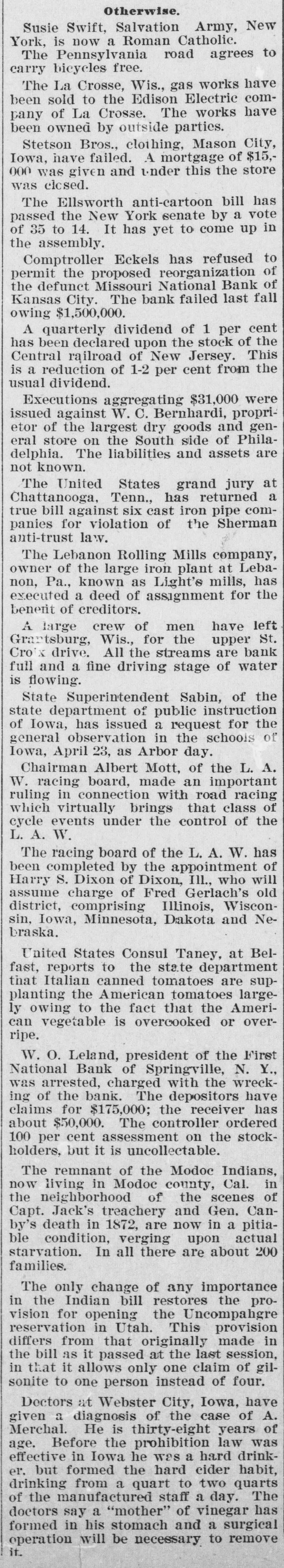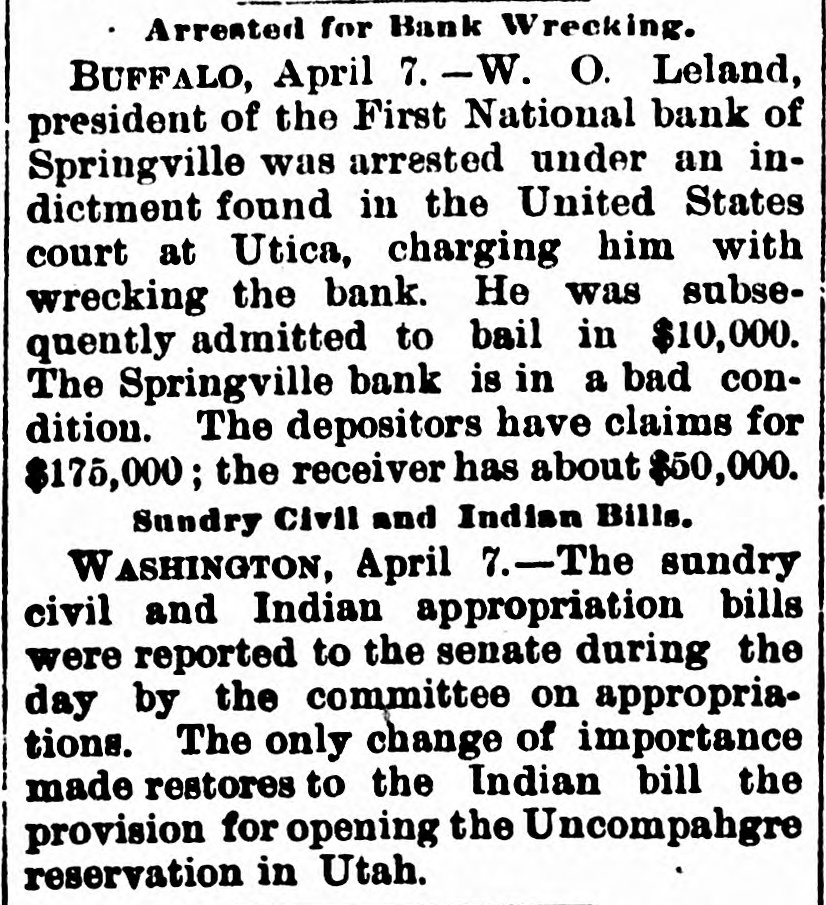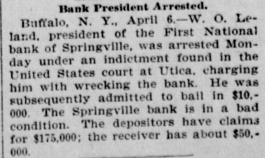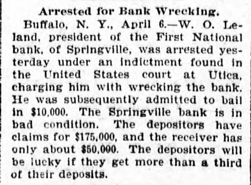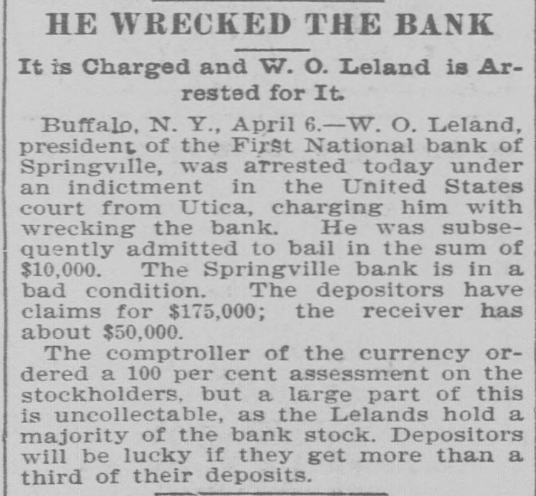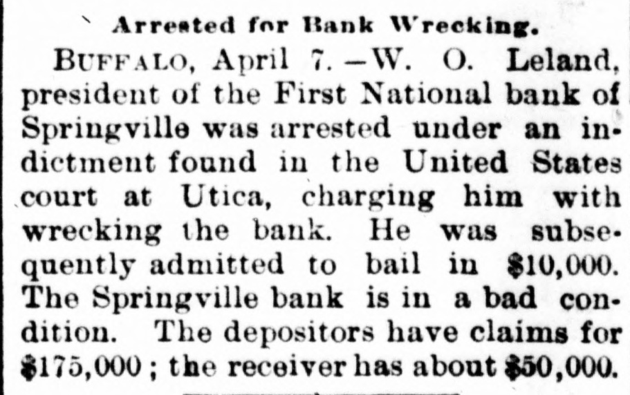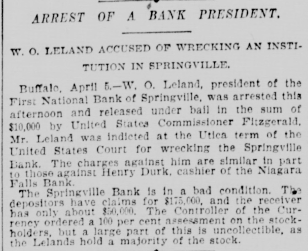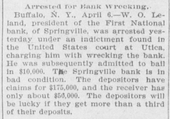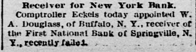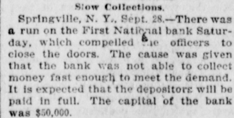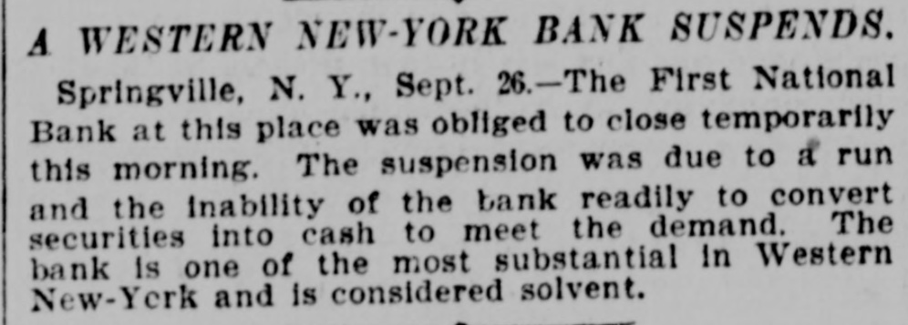 The First National Bank of Springville, N. Y., suspended Saturday in consequence of a run. The bank is believed to be solvent.