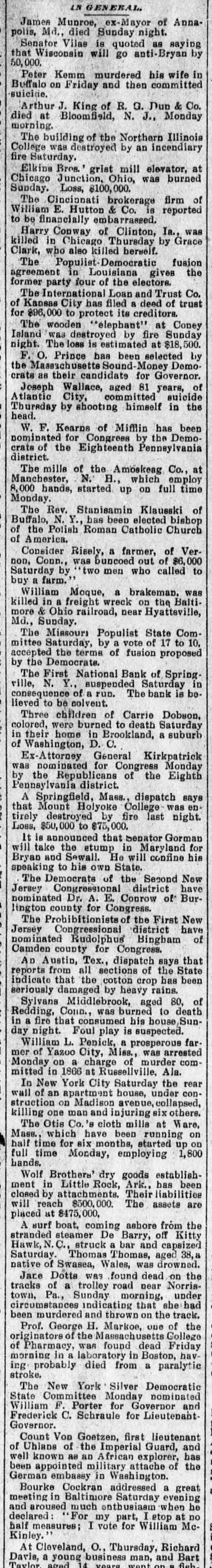 Bourke Cockran addressed a great meeting in Baltimore Saturday evening and aroused much enthusiasm when he declared: "For my part, I stop at no half measures; I vote for William McKinley."