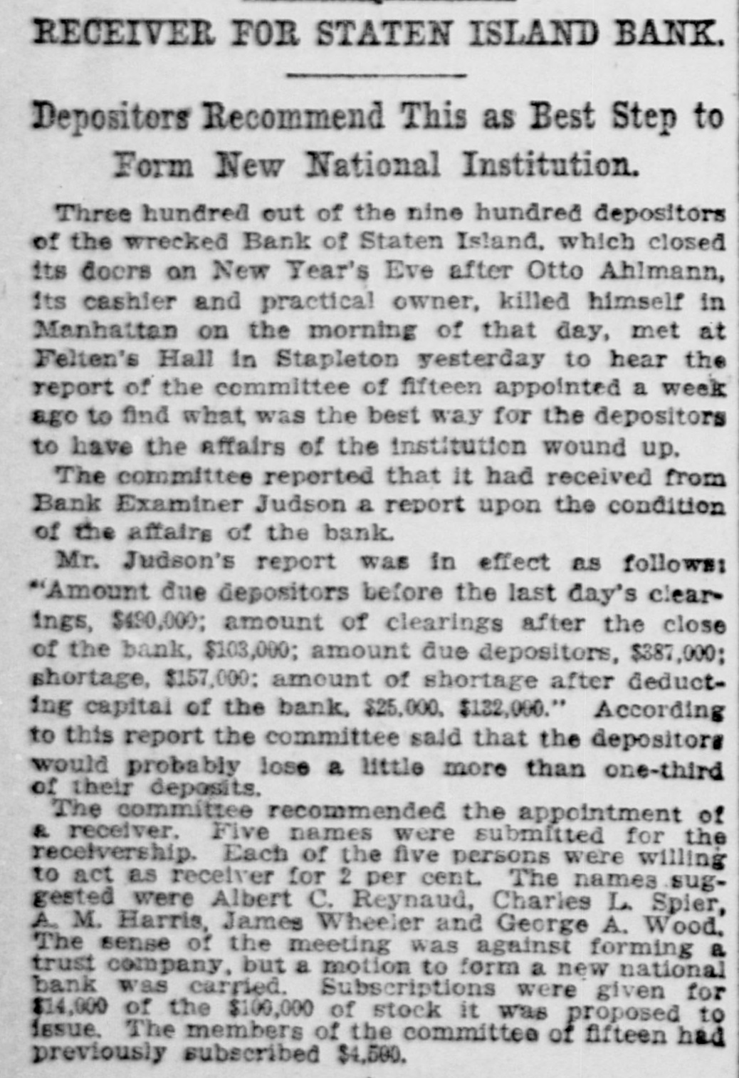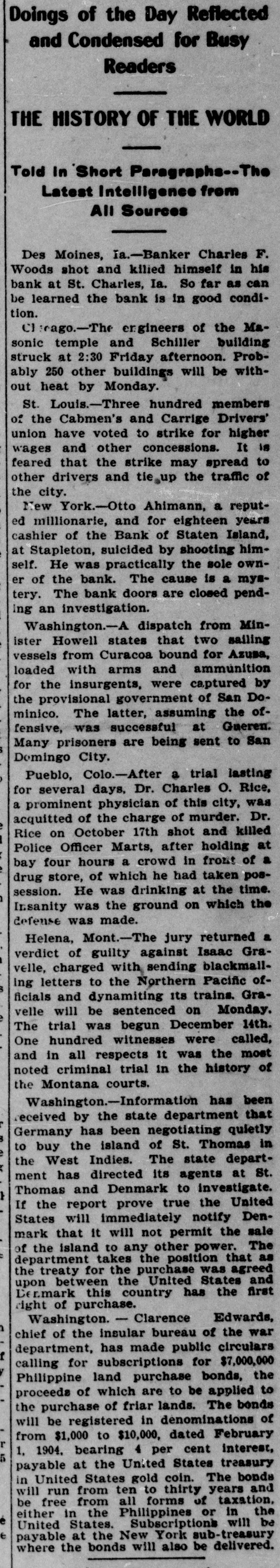 Doings of the Day Reflected and Condensed for Busy Readers THE HISTORY OF THE WORLD Told In Short Paragraphs--The Latest Intelligence from All Sources Des Moines, Ia.-Banker Charles F. Woods shot and kilied himself in his bank at St. Charles, Ia. So far as can be learned the bank is in good condition. Chicago.-The engineers of the Masonic temple and Schiller building struck at 2:30 Friday afternoon. Probably 250 other buildings will be without heat by Monday. St. Louis.-Three hundred members of the Cabmen's and Carrige Drivers' union have voted to strike for higher wages and other concessions. It is feared that the strike may spread to other drivers and ie up the traffic of the city. New York.-Otto Ahimann, a reputed millionarie, and for eighteen years cashier of the Bank of Staten Island, at Stapleton, suicided by shooting himself. He was practically the sole owner of the bank. The cause is a myatery. The bank doors are closed pending an investigation. Washington.-A dispatch from Minister Howell states that two sailing vessels from Curacoa bound for Azusa, loaded with arms and ammunition were the for provisional the insurgents, government captured of San Do- by minico. The latter, assuming the offensive, was successful at Gueren. Many prisoners are being sent to San Domingo City. Pueblo, Colo.-After a trial lasting for several days, Dr. Charles O. Rice, a prominent physician of this city, was acquitted of the charge of murder. Dr. Rice on October 17th shot and killed I Police Officer Marts, after holding at bay four hours a crowd in front of a of which he drug store, had taken the time. possession. He was drinking at Insanity was the ground on which the defense was made. Helena, Mont.-The jury returned a verdict of guilty against Isaac Grawith velle, charged sending blackmail. Pacific ofletters to the Northern s ing Graficials and dynamiting its trains. velle will be sentenced on Monday. e The trial was begun December 14th. One hundred witnesses were called, and in all respects it was the most noted criminal trial in the history of the Montana courts. Washington.-Information has been the state department that has been 3 Germany received by negotiating quietly in to buy the island of St. Thomas the West Indies. The state departx has directed its agents at St. and Denmark to } true Thomas ment If the report prove investigate. the United States will immediately notify Denmark that it will not permit the sale of the island to any other power. The department takes the position that as for the purchase was agreed between the this the upon Der.mark treaty country United has States the first and right of purchase. Washington. - Clarence Edwards, n chief of the insular bureau of the war has made f department, public for circulars $7,000,000 for subscriptions y land purchase of which are to calling proceeds Philippine be bonds, applied the to the purchase of friar lands. The bonds will be registered in denominations of from $1,000 to $10,000, dated February r 1, 1904. bearing 4 per cent interest, 5 payable at the United States treasury in United States gold coin. The bonds will run from ten to thirty years and be all forms the Philippines or the either free in from of taxation. in é United States. Subscriptions will be e payable at the New York sub-treasury where the bonds will also be delivered.