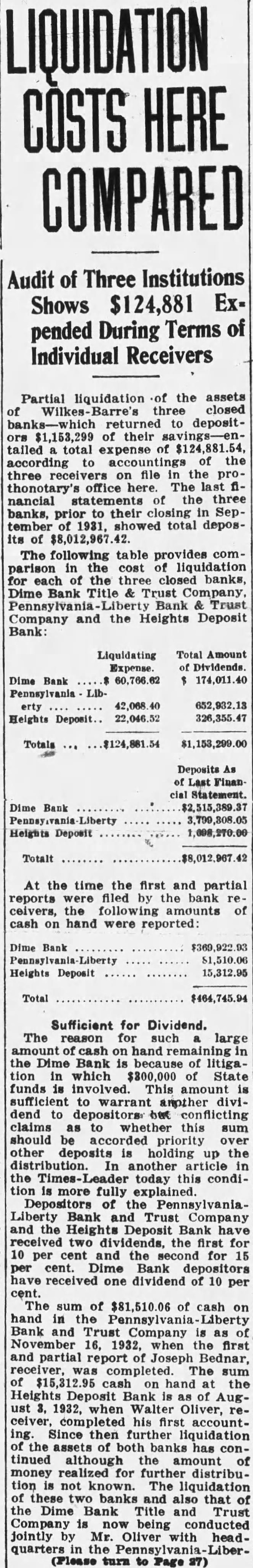 SIXTY-DAY RULE PUT EFFECT BY BANKS WILKES-BARRE HOUSES ACT OVER STATE TAKES OVER HEIGHTS BANK. Wilkes- Barre, Sept. 23 (INS). The third bank in Wilkes Barre to close In many days, the Heights Deposit bank here, failed to open for business On the at the hour set for was notice stating property of the institution had been taken over by Secretary of Banking Gordon, to conserve of positors and stockholders and prevent preference for withdrawing The last statement of the bank showed assets deposits of talized at had in surplus and undivided profits of The institution. located in midterrific and last evening. when the Pennsyl vania Liberty Bank and Trust company and the Dime Bank Title and Trust company closed their doors and taken by the state banking Early today and decided to place the in the hands of the secretary of banking. W. B. Davies was placed in charge. Heavy Runs At Banks. Central banks most of them subjected to heavy runs yesterday reported conditions more nearly normal today as withdrawal rule was proclaimed by the Clearing association and rerushed in from federal to stem the tide of withdrawals Despite the recession in uneasiness, there considertension the general bank ing situation and to allay it. several banks they would pay 10 per cent to tide depositors over while the rule is