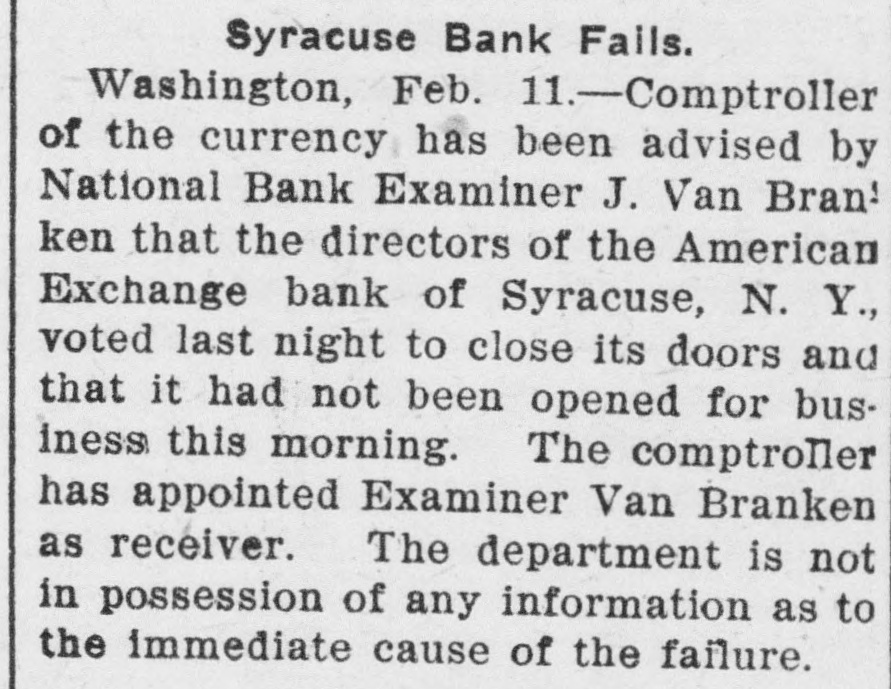 Syracuse Bank Fails. Washington, Feb. 11.-Comptroller of the currency has been advised by National Bank Examiner J. Van Bran ken that the directors of the American Exchange bank of Syracuse, N. Y., voted last night to close its doors and that it had not been opened for business this morning. The comptroller has appointed Examiner Van Branken as receiver. The department is not in possession of any information as to the immediate cause of the failure.