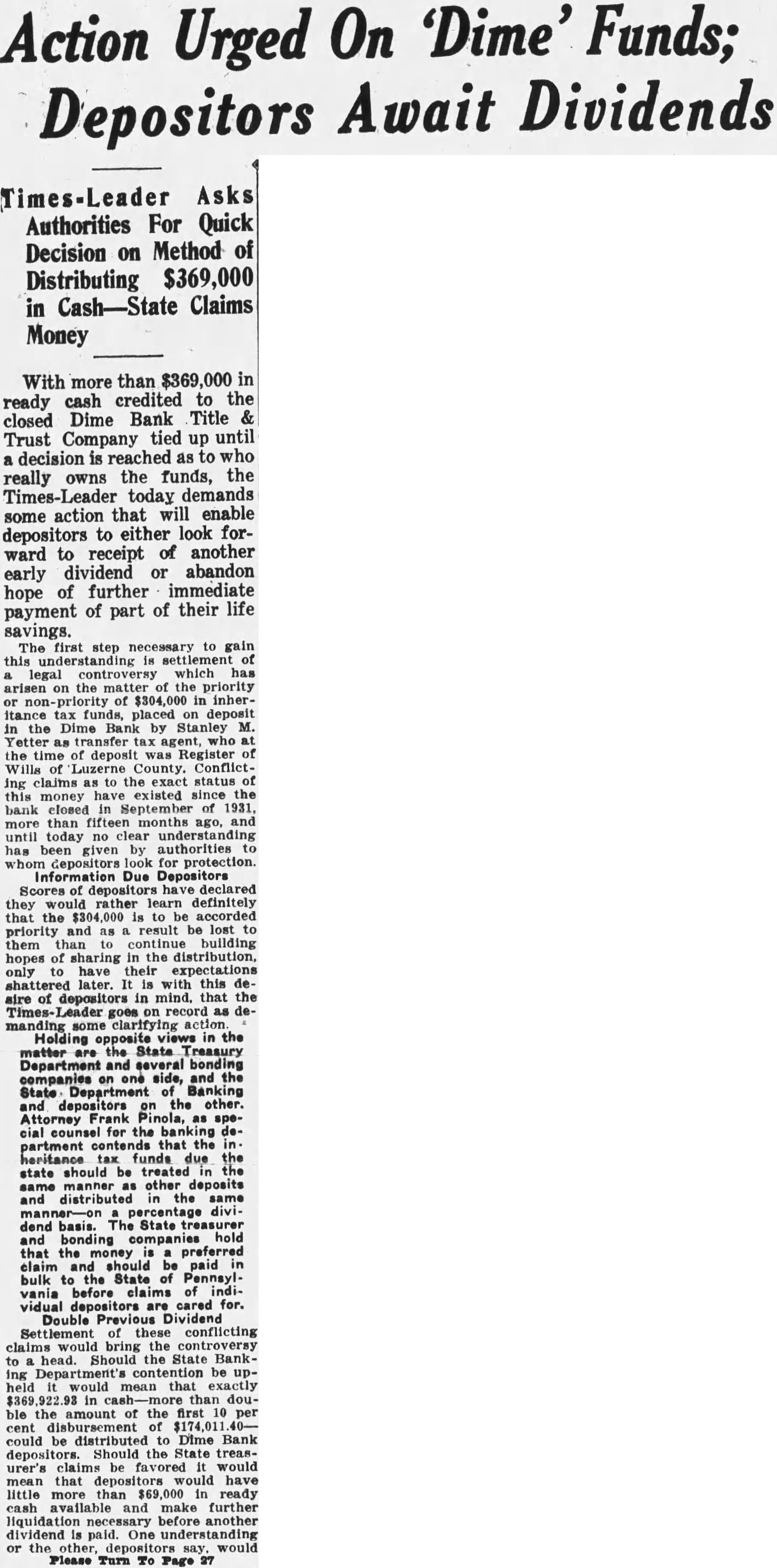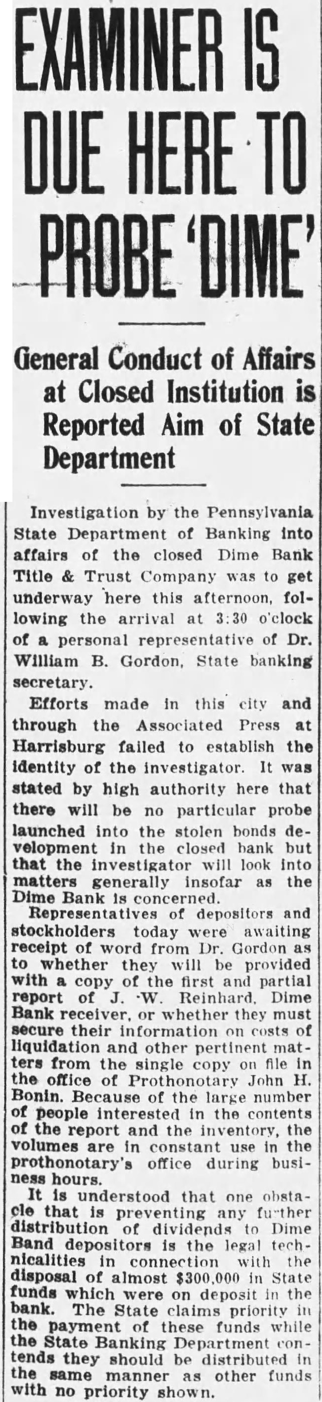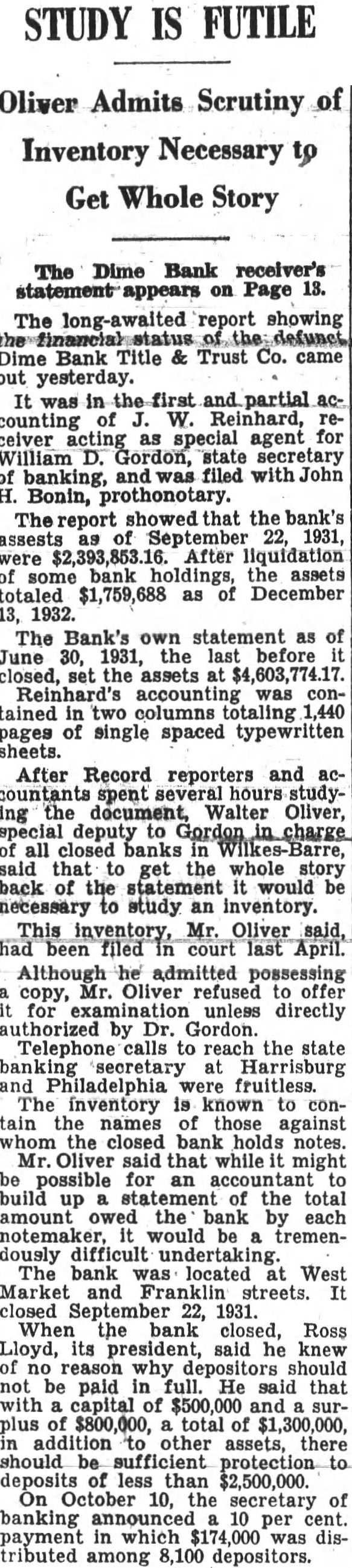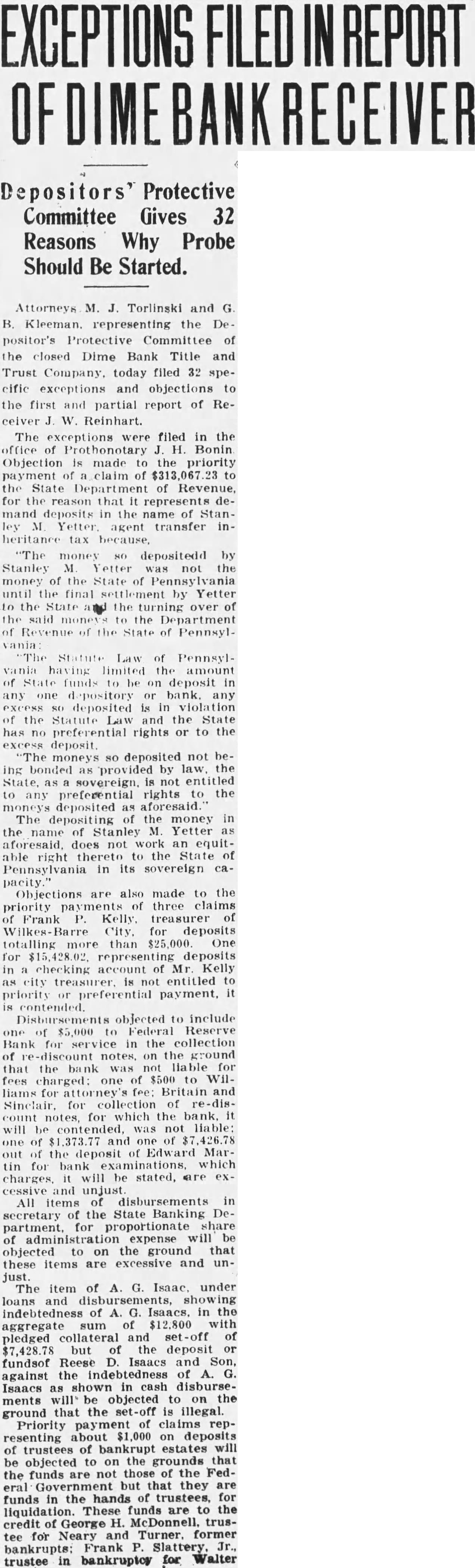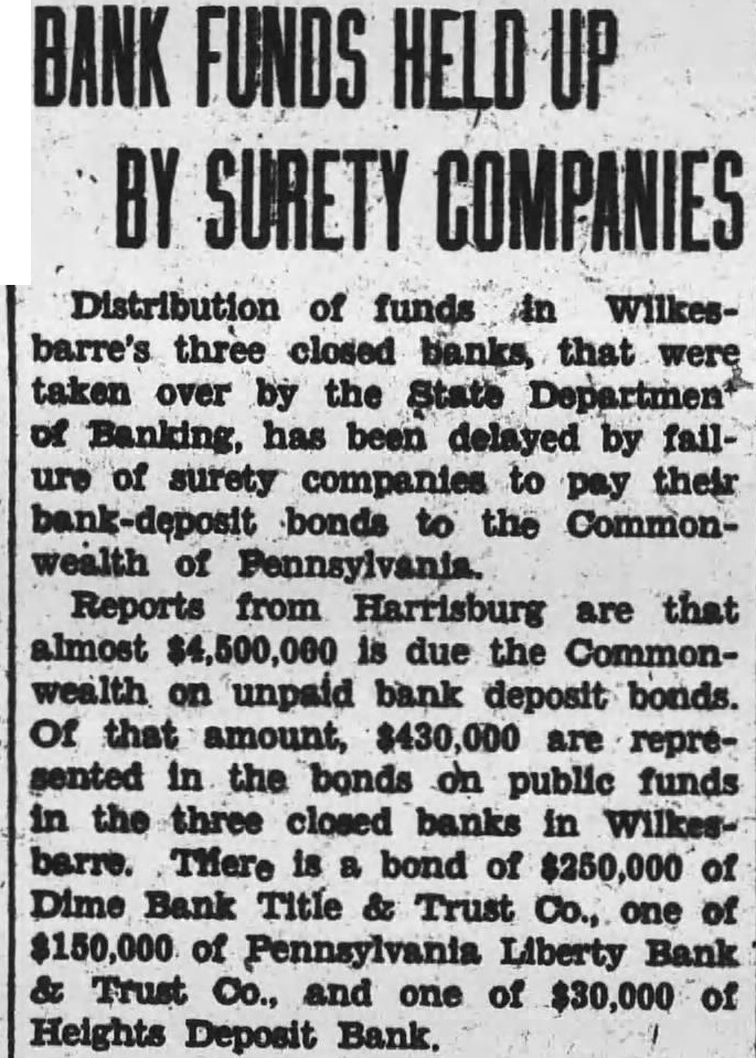 Office for headquarters Protective Committee of Dime Bank Title and Trust Company was leased yesterday in the Dime Bank building, West Market and Franklin Streets, by Boyle, secretary and temporary treasurer of the committee. Mr. Boyle announced that the fice will ready for next and that there in charge accept defray the pense Information the depositors the defunct bank. He that the office been leased through renting agent charge building which State Banking Department operating an the rental office be $15 month. treasurer the resignation Mr. Tuesday. Rudolph elected treasurer Saturday. opened count for the in Miners Bank made start names dresses depositors and stockholders from the and partial report Dime Bank's receiver the office. turned Boyle Mr. Rudolph who will continue much his time as to the work the committee. Ross Lloyd, former president of Dime night glad appear and assist them their work. effect. by Frank statement published the yesterday. directed attention the the importance having all the possible its proposed fight against closed banks extending payments State that protected by security Attorney Williams pointed out that committee would obtain from Ross Lloyd other officials Dime information about the which those made and bonded would materialpreparing exceptions first and partial report Reinhard, as receiver. In March, 1932, Attorney WilHams the attention Pinchot the the State being deposits that the governor, Attorney Williams "During campaign tour, particularly Counyou seemed much Interthe working class people. seems to this time there opportunity for you your offices in assisthad money Luzerne County which closed. true with reference the Dime Bank Title Company, bank the City which closed and there considerable State money, be predicated banks throughout the State. courts determined State being against believe safely say that one closed those banks operating, view the fact that State and has preferred claim, the State every time any money deposited in bank, our statute bond had be furnished for State protection, particularly immediate payment State. understand that the State making preferred the Dime Bank Title and Trust upon right. bonded. for the bond can under the State should bonding company for its money and allow the bonding company come any other colupon duty liability which they perform. This and the wholesale closing banks has brought out the absurdity questing unless the looks the bonding company for payment. assistance in this matter will anxiously least this Counat 1,000,000 throughout Pennsylvania. very grave and feel that matter responsible for law being applied the proper depositors thereby safe guard-