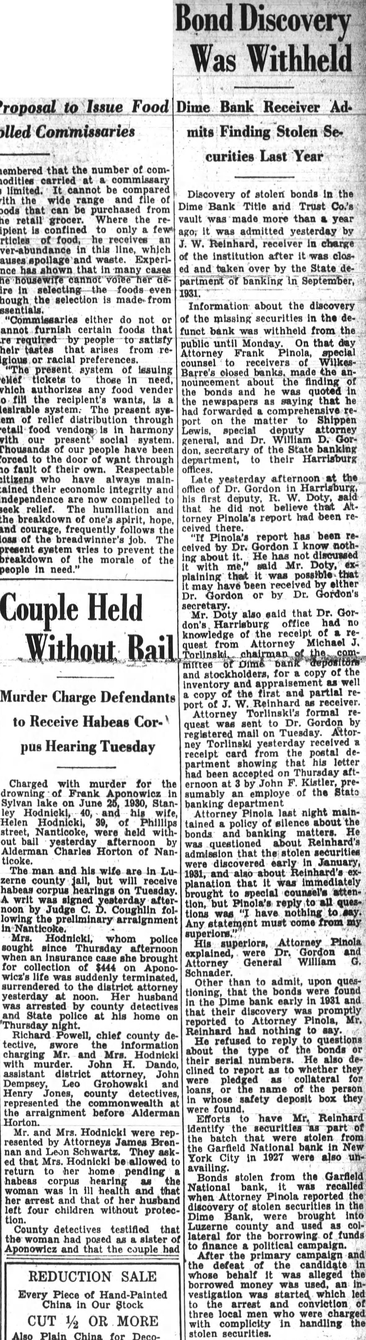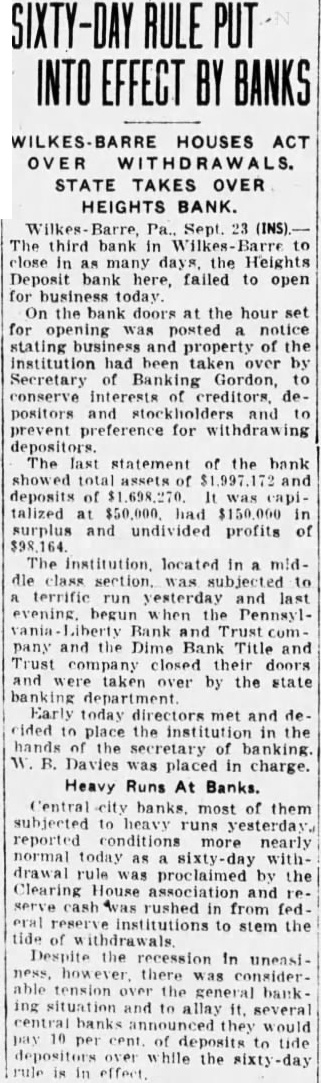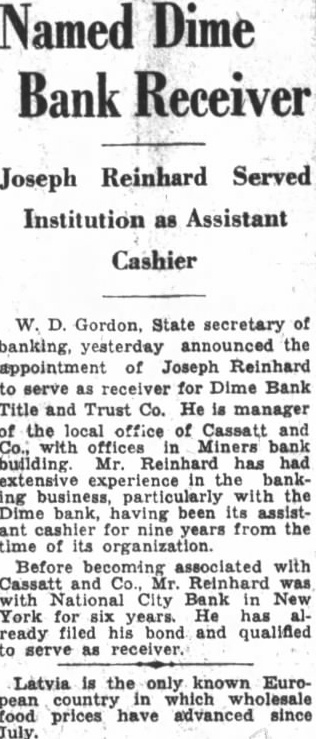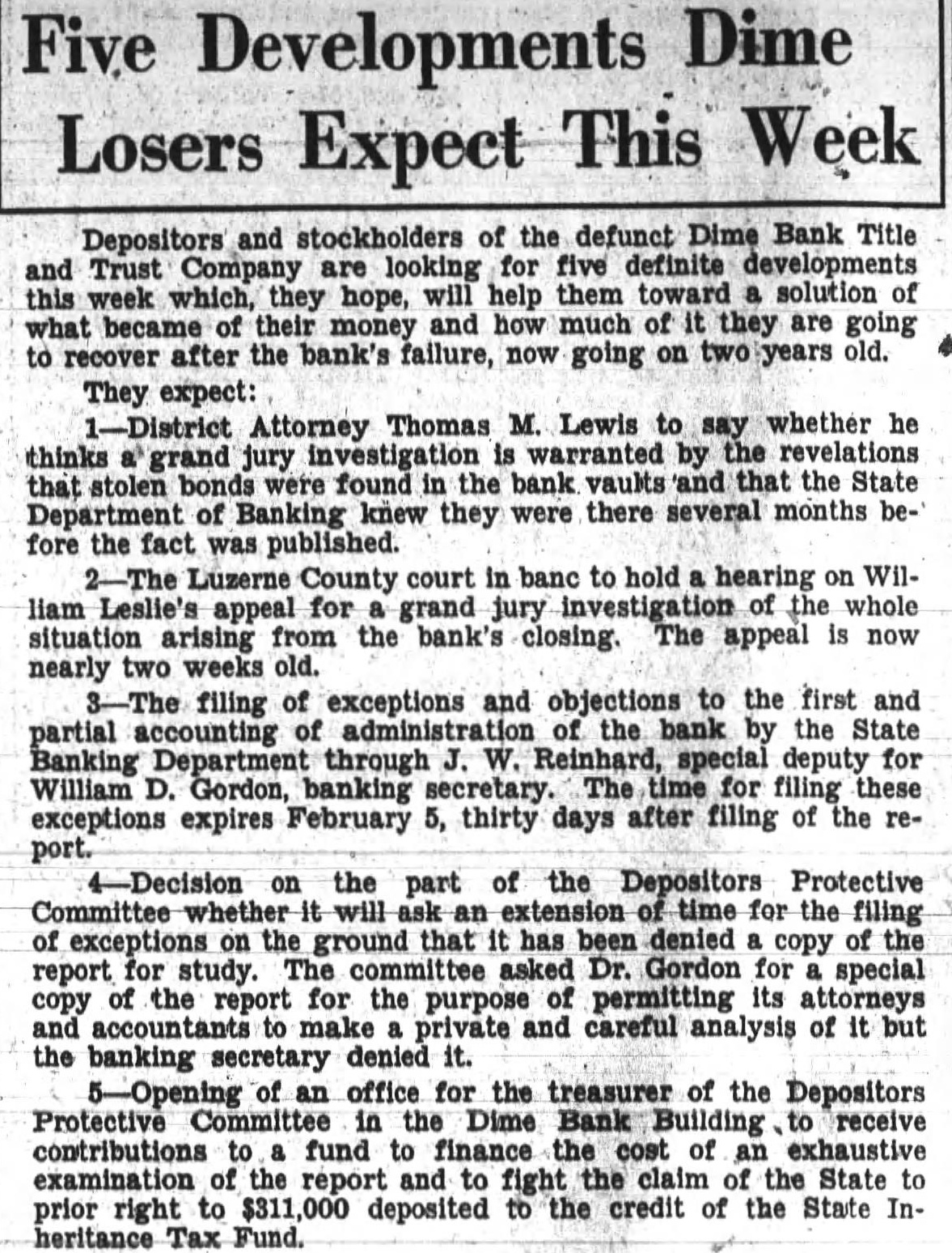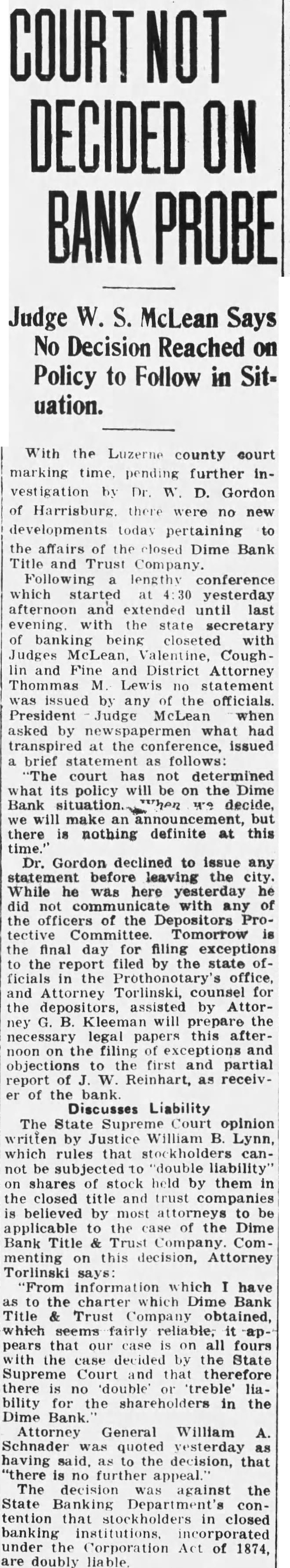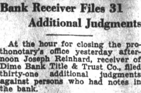 Office for headquarters Protective Committee of Dime Bank Title and Trust Company was leased yesterday in the Dime Bank building, West Market and Franklin Streets, by Boyle, secretary and temporary treasurer of the committee. Mr. Boyle announced that the fice will ready for next and that there in charge accept defray the pense Information the depositors the defunct bank. He that the office been leased through renting agent charge building which State Banking Department operating an the rental office be $15 month. treasurer the resignation Mr. Tuesday. Rudolph elected treasurer Saturday. opened count for the in Miners Bank made start names dresses depositors and stockholders from the and partial report Dime Bank's receiver the office. turned Boyle Mr. Rudolph who will continue much his time as to the work the committee. Ross Lloyd, former president of Dime night glad appear and assist them their work. effect. by Frank statement published the yesterday. directed attention the the importance having all the possible its proposed fight against closed banks extending payments State that protected by security Attorney Williams pointed out that committee would obtain from Ross Lloyd other officials Dime information about the which those made and bonded would materialpreparing exceptions first and partial report Reinhard, as receiver. In March, 1932, Attorney WilHams the attention Pinchot the the State being deposits that the governor, Attorney Williams "During campaign tour, particularly Counyou seemed much Interthe working class people. seems to this time there opportunity for you your offices in assisthad money Luzerne County which closed. true with reference the Dime Bank Title Company, bank the City which closed and there considerable State money, be predicated banks throughout the State. courts determined State being against believe safely say that one closed those banks operating, view the fact that State and has preferred claim, the State every time any money deposited in bank, our statute bond had be furnished for State protection, particularly immediate payment State. understand that the State making preferred the Dime Bank Title and Trust upon right. bonded. for the bond can under the State should bonding company for its money and allow the bonding company come any other colupon duty liability which they perform. This and the wholesale closing banks has brought out the absurdity questing unless the looks the bonding company for payment. assistance in this matter will anxiously least this Counat 1,000,000 throughout Pennsylvania. very grave and feel that matter responsible for law being applied the proper depositors thereby safe guard-