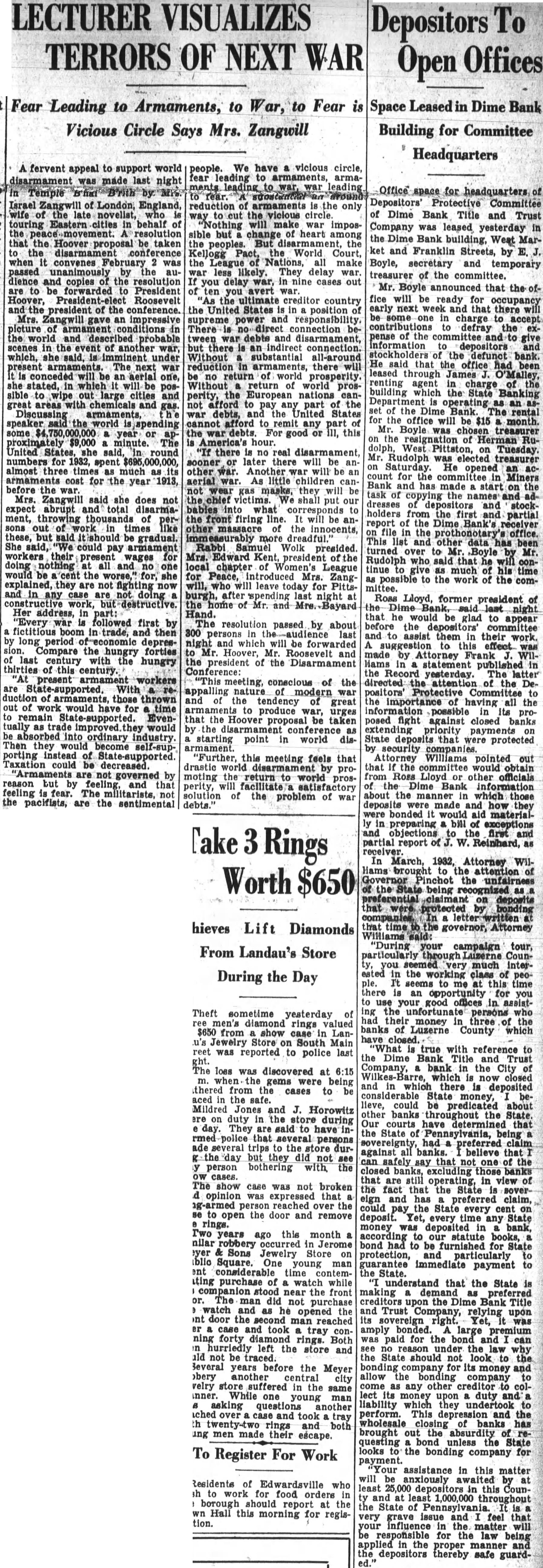 A fervent appeal to support world disarmament was made last night Temple Israel Zangwill of London, touring Eastern behalf the that the Hoover be taken when convenes was passed unanimously audience and copies resolution be forwarded President Roosevelt president the conference. Mrs. Zangwill an impressive picture conditions the world and described probable scenes in the of another war, which, she said, is imminent under present armaments. The next an stated, to large with chemicals Discussing armaments, speaker the world spending some $4,750,000,000 or United said, round numbers for almost much armaments cost for the year before Mrs. Zangwill said she does not expect abrupt ment, work times these, but said gradual. She could pay armament workers present wages for doing nothing and would be the worse," she they not fighting and in case work, destructive. Her address, part: "Every followed first fictitious boom in trade, then period depresCompare the hungry forties century hungry thirties of century. present workers With duction of armaments, those thrown work would have for Evenwould into ordinary industry. Then they would become self-supporting instead State-supported. Taxation could decreased 'Armaments are not governed reason but by and that feeling The the pacifists, are the sentimental people. We have circle, ments reduction armaments the only viclous circle. make war impossible heart But World Court, the Nations, make war less They delay delay war, nine cases out ten you avert creditor country the United States and responsibility. There direct connection tween and there an indirect connection. Without substantial all-around reduction there of prosperity. Without return world prosperity, the European nations not to the war debts, United States cannot afford remit any the good this America's there real disarmament, other will children wear masks, they will victims. shall put our bables the front firing line. other the innocents, dreadful. Rabbi Samuel presided. Edward Kent, president local chapter of Women's League Peace, Zangwill for Pittsburgh, last night of Mr. and Hand. The resolution passed by about 300 persons last night and be forwarded Hoover, Mr. Roosevelt and the president of the Disarmament "This meeting, conscious of the nature war and the tendency great to produce urges that the Hoover proposal taken by the disarmament conference starting point world disarmament. "Further, meeting feels that drastic world by promoting the return to world perity, will solution of problem of war debts.'