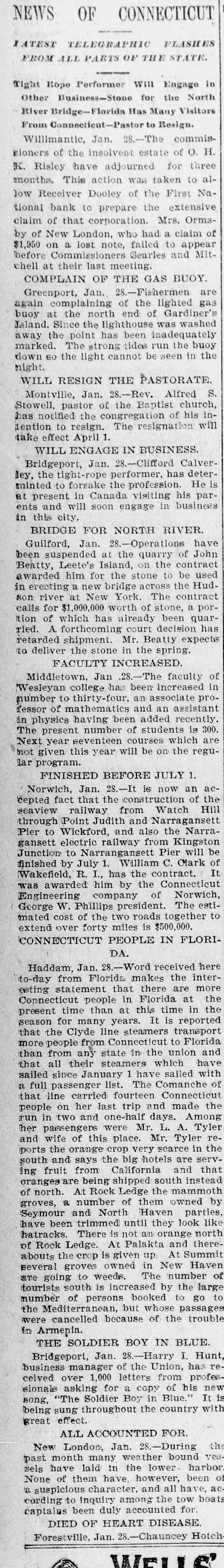 OF NEWS CONNECTIC ATEST TELEGRAPHIC in will Rope right Engage Performer for the North Other Business-Street Many River BridgeFlorida Visitors From Resign. Jan. commisWillimant of H. O. of the estate gioners insolvent K. for three have Risley adjourned alwas This taken action months. of the NaJow First Dooley Receiver the tional bank extensive prepare of Mrs. that Ormsclaim corporation. a of of by had who claim New London, to lost $1,950 note, failed appear and Mitbefore Searles at last their chell meeting. OF GAS THE BUOY. COMPLAIN are Jan. of the Fishermen gas again lighted of at end the Greenomplaining buoy Gardiner's was the Since washed Island. nelighthouse the has away been run the inadequately The buoy tides marked. in be the 60 the seen light down cannot night. THE WILL RESIGN PASTORATI S. Jan. Alfred Montville, 28.-Rev.ru of church pastor Baptist inof his will The resign the take has tention effect to April IN WILL ENGAGE BUSINESS. Jan. CalverClifford Bridgeport, has deterperformer, He is professionis parpresent will soon at ents and Aey, minted the tight-rope the visiting in business in this city. FOR BRIDGE Jan. Guilford, at Operations the NORTH RIVER. have John quarry on the contract Beatty, used awarded in new bridge The son in erecting a New river York. a been suspended Leete's him for Island, the "stone to the contract be Hudof 000 for calls stone, porworth $1,000, of tion been has which quaralready A has court decision forthcomini Mr. Beatty expects the spring. retarded ried. shipment. the in of Jan 28.-The faculty in has been Middletownlege Wesleyan increased an to pronumber associate an of thirty-four and fessor assistant in nathematics been recently. having added physics is 300. of The present number students are which year Next courses be eventeenco the on this reguyear mot given 1. JULY Jan. Norwich, the that fact cepted lar program. FINISHED BEFORE is now an of Hill the from Watch seaview railway and Point Judith through the to Narragansett also and Pier Narrafrom electric gansett Wickford Kingston be will to Pier Narrar railwansett C. of Clark It William Wakefield, him was awarded of meering Engine Junction finished by July R. I., 1. has by the the Connecticut Norwich, W. George Phillips The estito of compresident the two cost dreams together mated is over miles forty $500,000. extend IN FLORIPEOPLE CONNEC ECTICUT DA. from to-day Word received the inter- here that eating in statement people Haddam, Jan. Florida makes there are at more the Florida in the at this time than time It ted is for years. many season the that Clyde transport steamers to more Florida people Inconnecticut in the and union fromstate any from than have their which steamers with sailed 1 have of Comanche people sailed that all since January fourteen The Connect made the her full passenser carried trip and days. Among Tyler of wife and that line on her and Lone-hair Mr. L. Tyler A. rethe crop orange ports big and says hotels run in two were place. very Mr. scarce are in Serv- the that and instead oranges mmoth of north a of groves, number North Haven ing south fruit are from being Rock shipped Ledge them the owned mamm parties by look like they until have north hatracks. At up given Seymour been and trimmed There is notan Palakta orange and Summit thereNew Haven Feveral to are groveweeds. going south to abouts of Rock the Ledge. crop is owned The in number large of by the to go passages the Meancelled number tourists of persons because but whose of the trouble THE IN BLUE. Jan. of the Bridgeport, were in BOY I. has Hunt re ceived Union, professfrom new asking sionali letters of his It is Boy "The song, Soldier the sung business 1,000 for a copy in Blue.' with country being effect. great ALL FOR th 28.Jan. New London, yes. many bound past weather month the in sels laid have lower harbor of been them None have, however, achave, and all tow the to boats cording inquiry for. amonanted been duly captains OF DIED HEART DISEASE 28. Hotch Jan. Chauncey Forestville, WEL