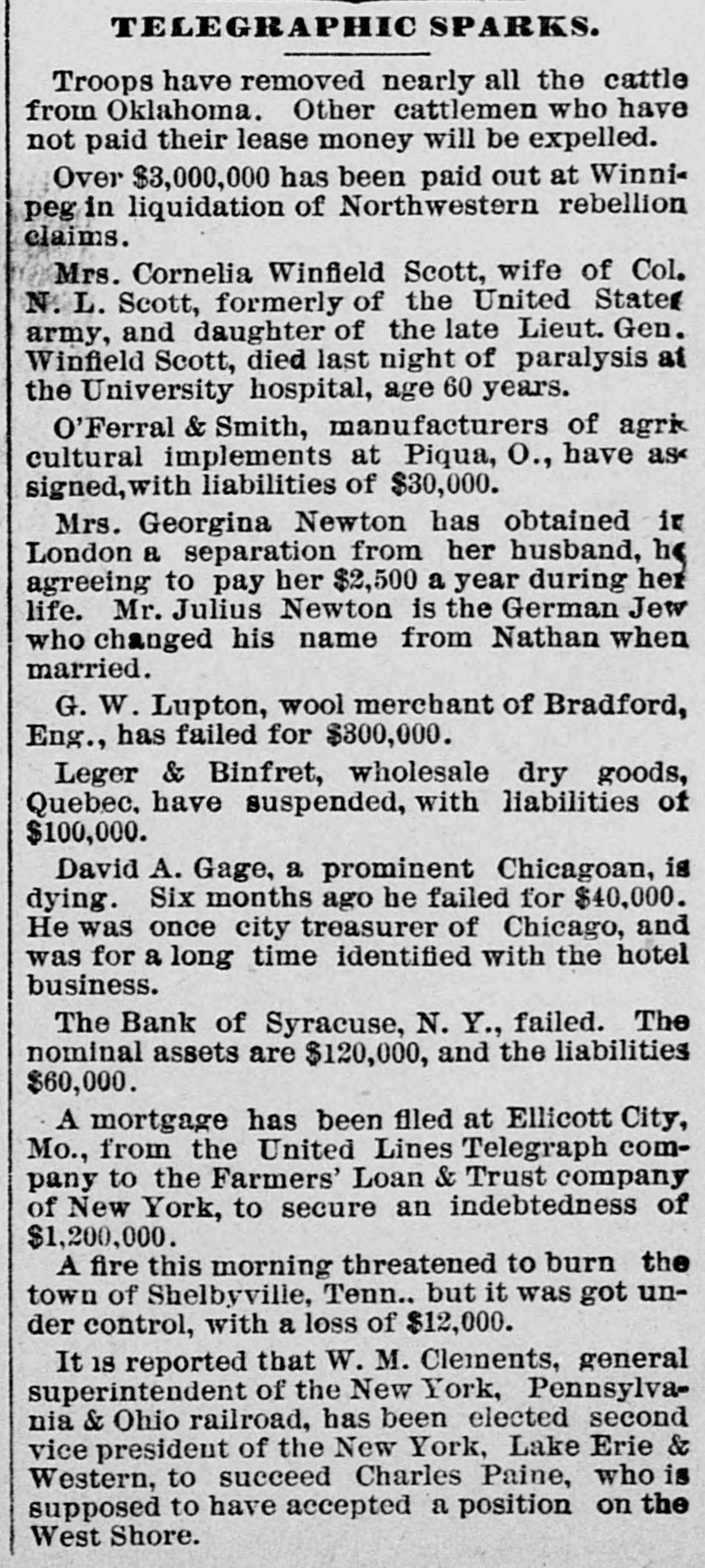 TELEGRAPHIC SPARKS. Troops have removed nearly all the cattle from Oklahoma. Other cattlemen who have not paid their lease money will be expelled. Over $3,000,000 has been paid out at Winni< peg in liquidation of Northwestern rebellion claims. Mrs. Cornelia Winfield Scott, wife of Col. N. L. Scott, formerly of the United State army, and daughter of the late Lieut. Gen. Winfield Scott, died last night of paralysis at the University hospital, age 60 years. O'Ferral & Smith, manufacturers of agrik cultural implements at Piqua, O., have as signed, with liabilities of $30,000. Mrs. Georgina Newton has obtained in London a separation from her husband, he agreeing to pay her $2,500 a year during her life. Mr. Julius Newton is the German Jew who changed his name from Nathan when married. G. W. Lupton, wool merchant of Bradford, Eng., has failed for $300,000. Leger & Binfret, wholesale dry goods, Quebec, have suspended, with liabilities of $100,000. David A. Gage, a prominent Chicagoan, is dying. Six months ago he failed for $40,000. He was once city treasurer of Chicago, and was for a long time identified with the hotel business. The Bank of Syracuse, N. Y., failed. The nominal assets are $120,000, and the liabilities $60,000. A mortgage has been filed at Ellicott City, Mo., from the United Lines Telegraph company to the Farmers' Loan & Trust company of New York, to secure an indebtedness of $1,200,000. A fire this morning threatened to burn the town of Shelbyville, Tenn.. but it was got under control, with a loss of $12,000. It 18 reported that W. M. Clements, general superintendent of the New York, Pennsylvania & Ohio railroad, has been elected second vice president of the New York, Lake Erie & Western, to succeed Charles Paine, who is supposed to have accepted a position on the West Shore.