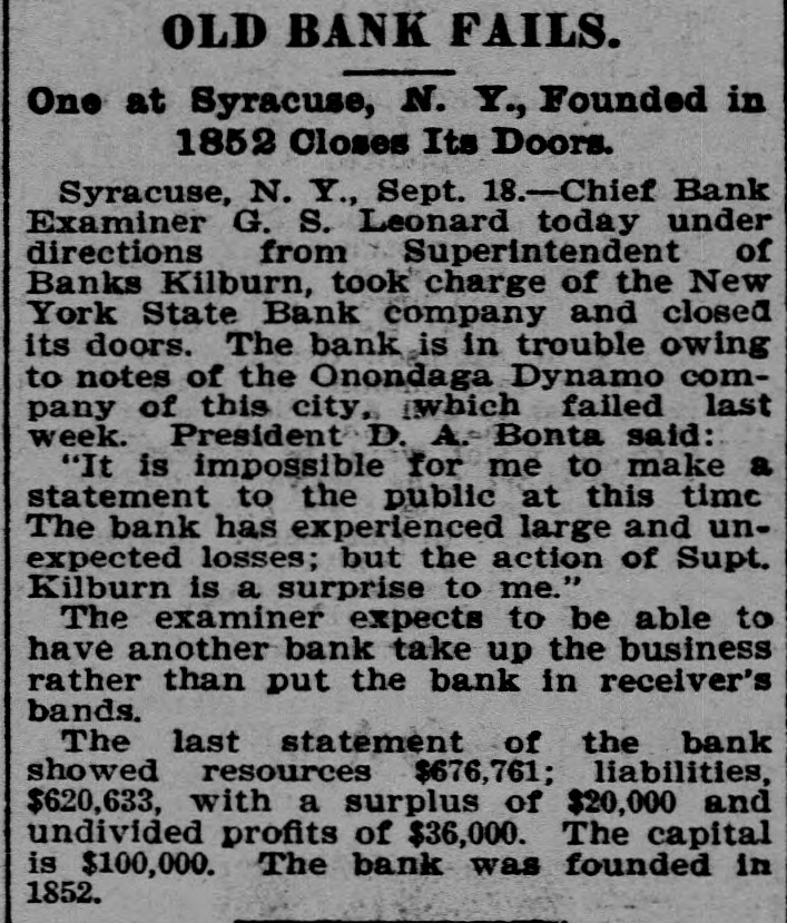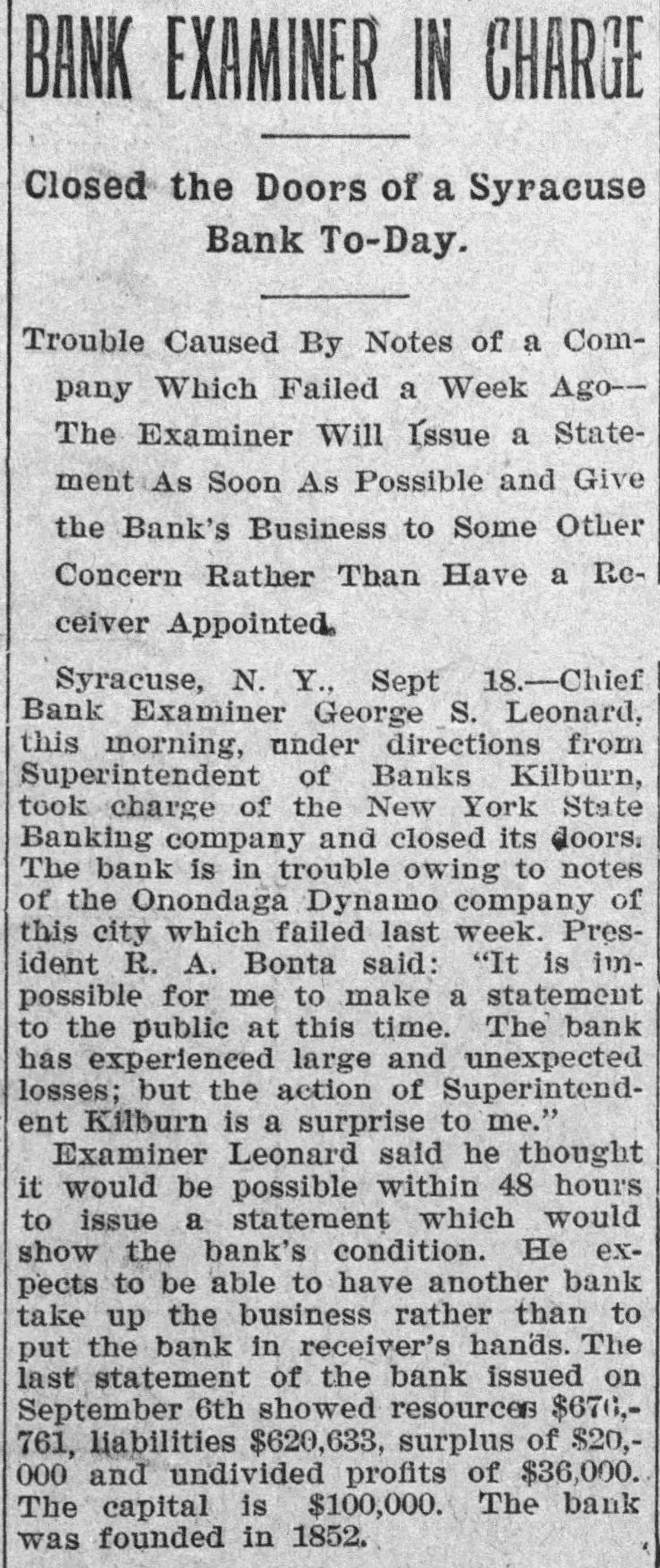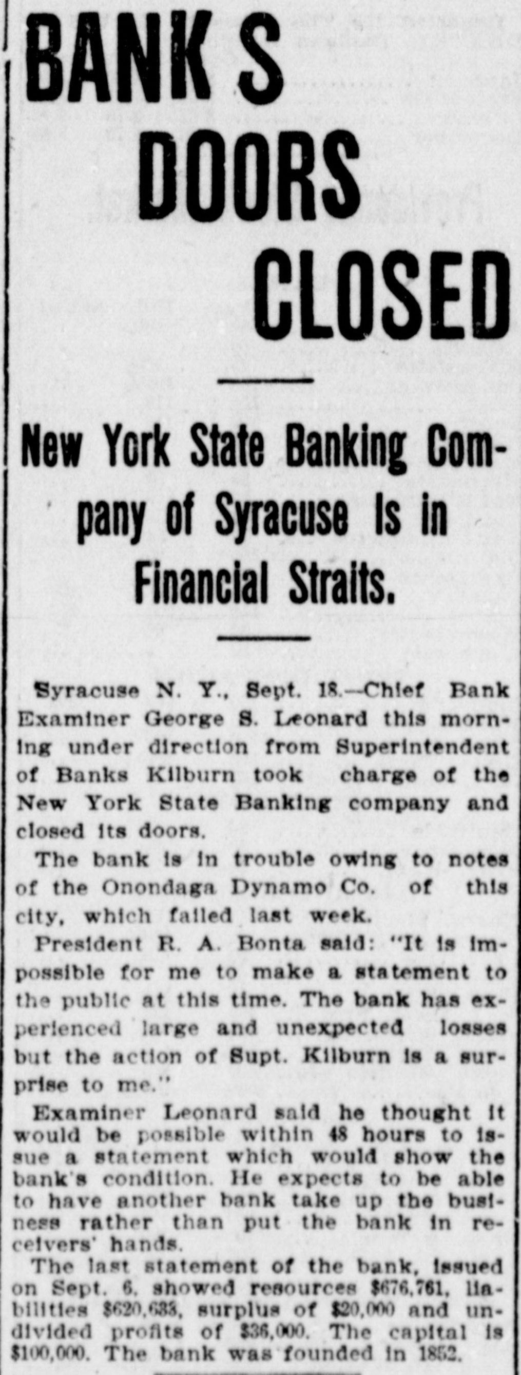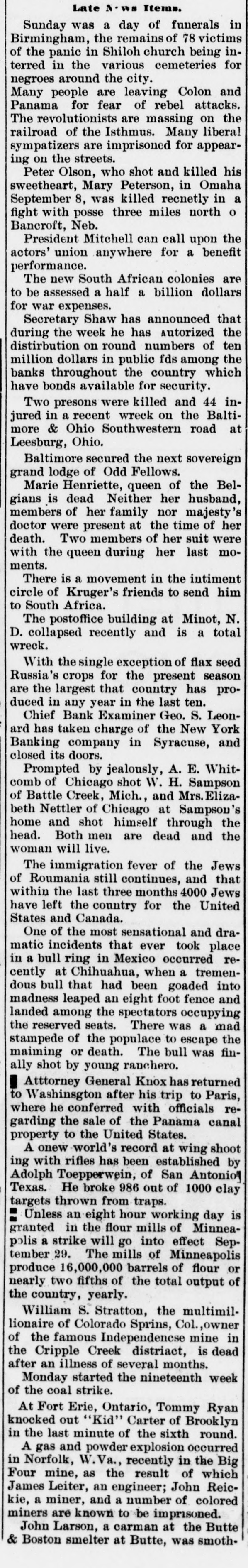 Late Items. Sunday was a day of funerals in Birmingham, the remains of 78 victims of in Shiloh the various for terred the panic in church cemeteries being inaround are leaving negroes Many people the city. Colon and Panama for fear of rebel attacks. The revolutionists are massing on the railroad of the Isthmus. Many liberal sympatizers are imprisoned for appearing on the streets. Peter Olson, who shot and killed his sweetheart, Mary Peterson, in Omaha September 8, was killed recnetly in a fight with posse three miles north o Bancroft, Neb. President Mitchell can call upon the actors' union anywhere for a benefit performance. The new South African colonies are to be assessed a half a billion dollars for war expenses. Shaw has announced that the week he has the on round during distirbution Secretary numbers Autorized of ten dollars in public among the the country million banks throughout fds which have bonds available for security. Two presons were killed and 44 injured in a recent wreck on the Baltimore & Ohio Southwestern road at Leesburg, Ohio. Baltimore secured the next sovereign grand lodge of Odd Fellows. Marie Henriette, queen of the Belgians is dead Neither her husband, members of her family nor majesty's doctor were present at the time of her death. Two members of her suit were with the queen during her last moments. There is a movement in the intiment circle of Kruger's friends to send him to South Africa. The postoffice building at Minot, N. D. collapsed recently and is a total wreck. With the single exception of flax seed for the season are that country proRussia's the largest crops present ten. has duced in any year in the last Chief Bank Examiner Geo. S. Leonard has taken charge of the New York Banking company in Syracuse, and closed its doors. Prompted by jealously, A. E. Whitshot W. comb of Chicago and H. Mrs. Sampson Elizaof Battle Creek, Mich., beth Nettler of Chicago at Sampson's home and shot himself through the head. Both men are dead and the woman will live. The immigration fever of the Jews of Roumania still continues, and that within the last three months 4000 Jews have left the country for the United States and Canada. One of the most sensational and dramatic incidents that ever took place in bull ring in Mexico occurred reat Chihuahua, a cently a when tremenbull that had been goaded into an eight landed the spectators madness dous among leaped foot occupying fence and the seats. was a mad of the populace to escape stampede reserved There The bull fin- the maiming or death. was ally shot by young ranchero. General Knox has returned to after his conferred rewhere Atttorney Washinggton he with trip officials to Paris, garding the sale of the Panama canal property to the United States. A onew world's record at wing shoot ing with rifles has been established by Adolph Toepperwein, of San Antonio Texas. He broke 986 out of 1000 clay targets thrown from traps. Unless an eight hour working day is granted in the flour mills of Minneaa strike will go into effect SepThe mills polis tember 29. barrels of Minneapolis of flour produce 16,000,000 or nearly two fifths of the total output of the country, yearly. William S. Stratton, the multimillionaire of Colorado Sprins, Col. owner of the famous Independencies mine in the Cripple Creek distriact, is dead after an illness of several months. Monday started the nineteenth week of the coal strike. Ontario, Tommy Ryan Carter knocked At Fort out Erie, "Kid" of Brooklyn in the last minute of the sixth round. A gas and powder explosion occurred in Norfolk, .Va., recently in the Big Four as the result James an engineer; mine, Leiter, John of which Reickie, a miner, and a number of colored miners are known to be imprisoned. John Larson, a carman at the Butte Boston smelter at Butte, was smoth-