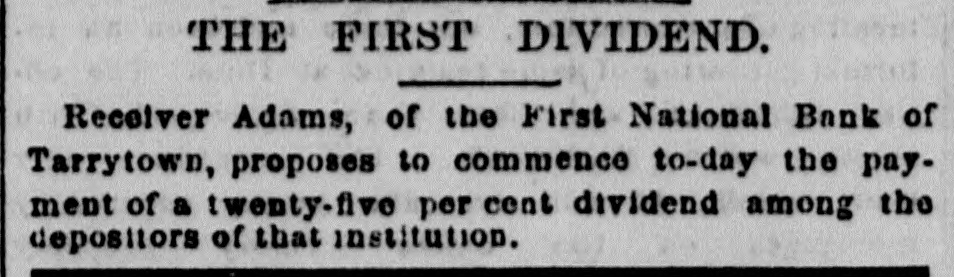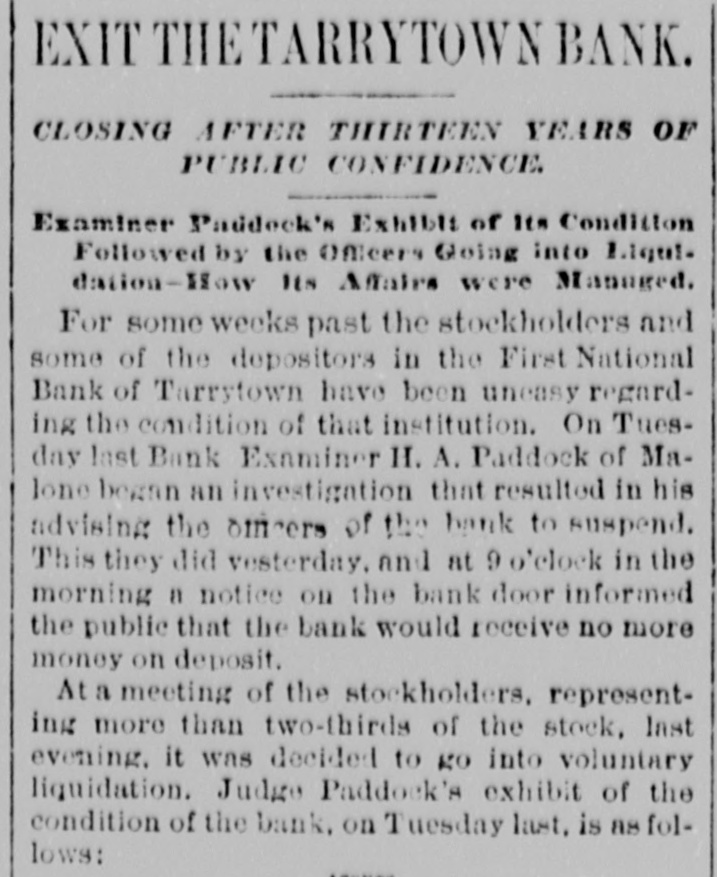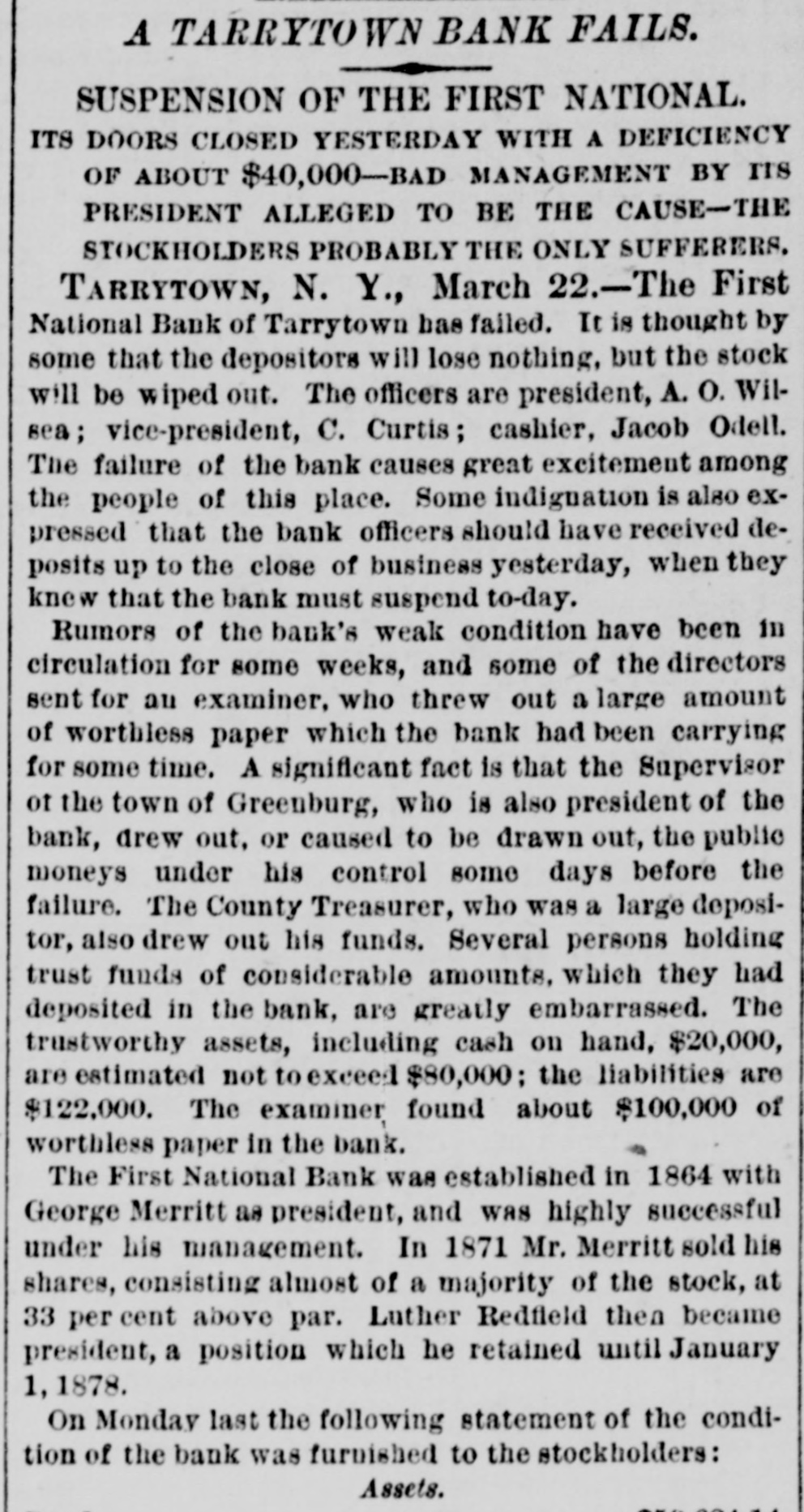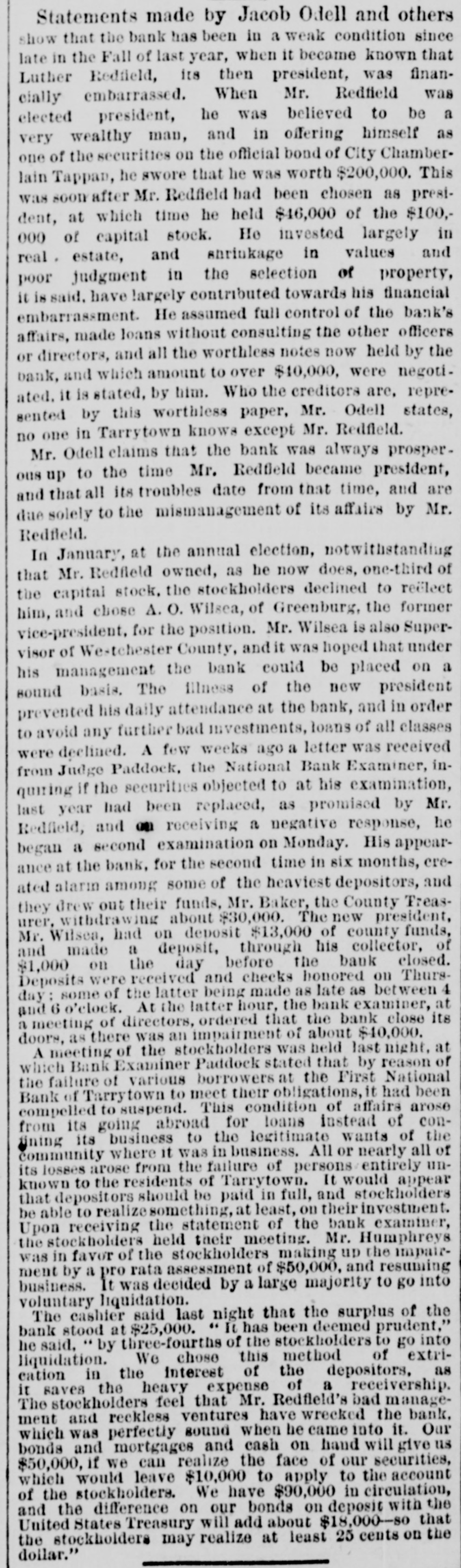Statements made by Jacob Odell and others show that the bank has been in a weak condition since late in the Fall of last year, when it became known that Luther Redfield, its then president, was financially embarrassed. When Mr. Redfield was elected president, he was believed to be a very wealthy man, and in offering himself as one of the securities on the official bond of City Chamberlain Tappan, he swore that he was worth $200,000. This was soon after Mr. Redfield had been chosen as president, at which time he held $46,000 of the $100,000 of capital stock. He invested largely in real, estate, and shrinkage in values and poor judgment in the selection of property, it is said, have !argely contributed towards his financial embarrassment. He assumed full control of the bank's affairs, made loans without consulting the other officers or directors, and all the worthless notes now held by the bank, and which amount to over $40,000, were negotiated. it is stated, by him. Who the creditors are, represented by this worthless paper, Mr. Odell states, no one in Tarrytown knows except Mr. Redfield. Mr. Odell claims that the bank was always prosperous up to the time Mr. Redfield became president, and that all its troubles date from that time, and are due solely to the mismanagement of its affairs by Mr. Redfield. In January, at the annual election, notwithstanding that Mr. Redfield owned, as he now does, one-third of the capital stock, the stockholders declined to reëlect him, and chose A. O. Wilsea, of Greenburg, the former vice-president, for the position. Mr. Wilsea is also Supervisor of Westchester County, and it was hoped that under his management the bank could be placed on a sound basis. The illness of the new president prevented his daily attendance at the bank, and in order to avoid any further bad investments, loans of all classes were declined. A few weeks ago a letter was received from Judge Paddock, the National Bank Examiner, inquiring if the securities objected to at his examination, last year had been replaced, as promised by Mr. receiving a negative response, he Redfield, and began a second examination on Monday. His appearance at the bank, for the second time in six months, created alarm among some of the heaviest depositors, and they drew out their funds, Mr. Baker, the County Treasurer, withdrawing about $30,000. The new president, Mr. Wilsea, had on deposit $13,000 of county funds, and made a deposit, through his collector, of $1,000 on the day before the bank closed. Deposits were received and checks honored on Thursday; some of the latter being made as late as between 4 and 6 o'clock. At the latter hour, the bank examiner, at a meeting of directors, ordered that the bank close its doors, as there was an impairment of about $40,000. A meeting of the stockholders was held last night, at which Bank Examiner Paddock stated that by reason of the failure of various borrowers at the First National Bank of Tarrytown to meet their obligations, it had been compelled to suspend. This condition of affairs arose from its going abroad for loans instead of confining its business to the legitimate wants of the community where it was in business. All or nearly all of its losses arose from the failure of persons entirely unknown to the residents of Tarrytown. It would appear that depositors should be paid in full, and stockholders be able to realize something, at least, on their investment. Upon receiving the statement of the bank examiner, the stockholders held their meeting. Mr. Humphreys was in favor of the stockholders making up the impairment by a pro rata assessment of $50,000, and resuming business. It was decided by a large majority to go into voluntary liquidation. The cashier said last night that the surplus of the bank stood at $25,000. " It has been deemed prudent," he said, by three-fourths of the stockholders to go into liquidation. We chose this method of extrication in the interest of the depositors, as it saves the heavy expense of a receivership. The stockholders feel that Mr. Redfleld's bad management and reckless ventures have wrecked the bank. which was perfectly sound when he came into it. Our bonds and mortgages and cash on hand will give us $50,000, if we can realize the face of our securities, which would leave $10,000 to apply to the account of the stockholders. We have $90,000 in circulation, and the difference on our bonds on deposit with the United States Treasury will add about $18,000-so that the stockholders may realize at least 25 cents on the doilar."