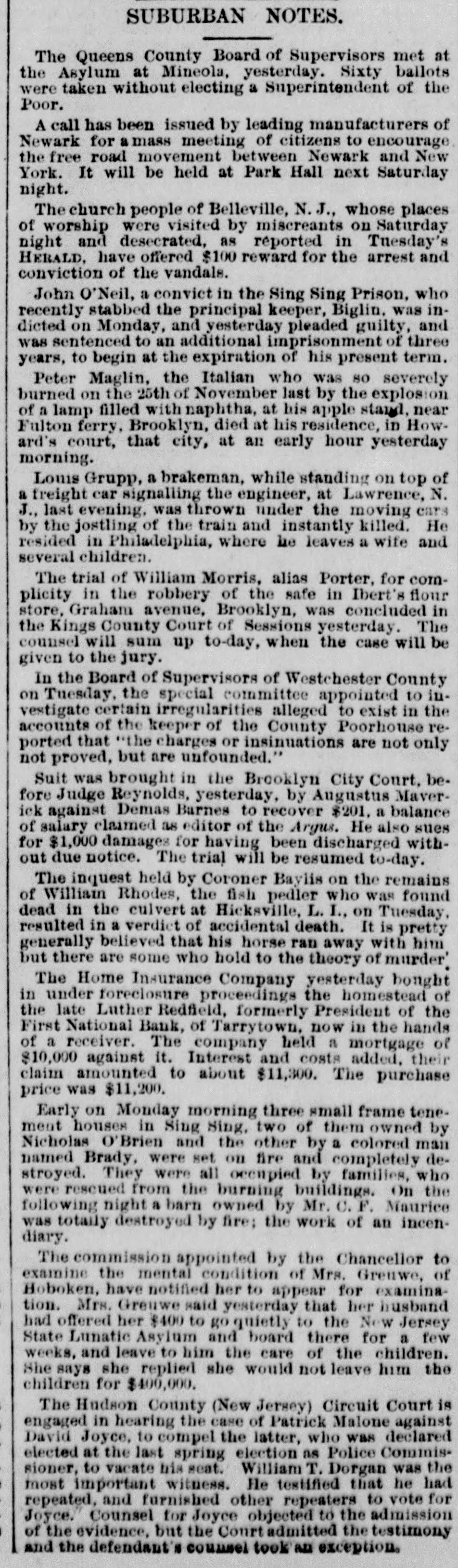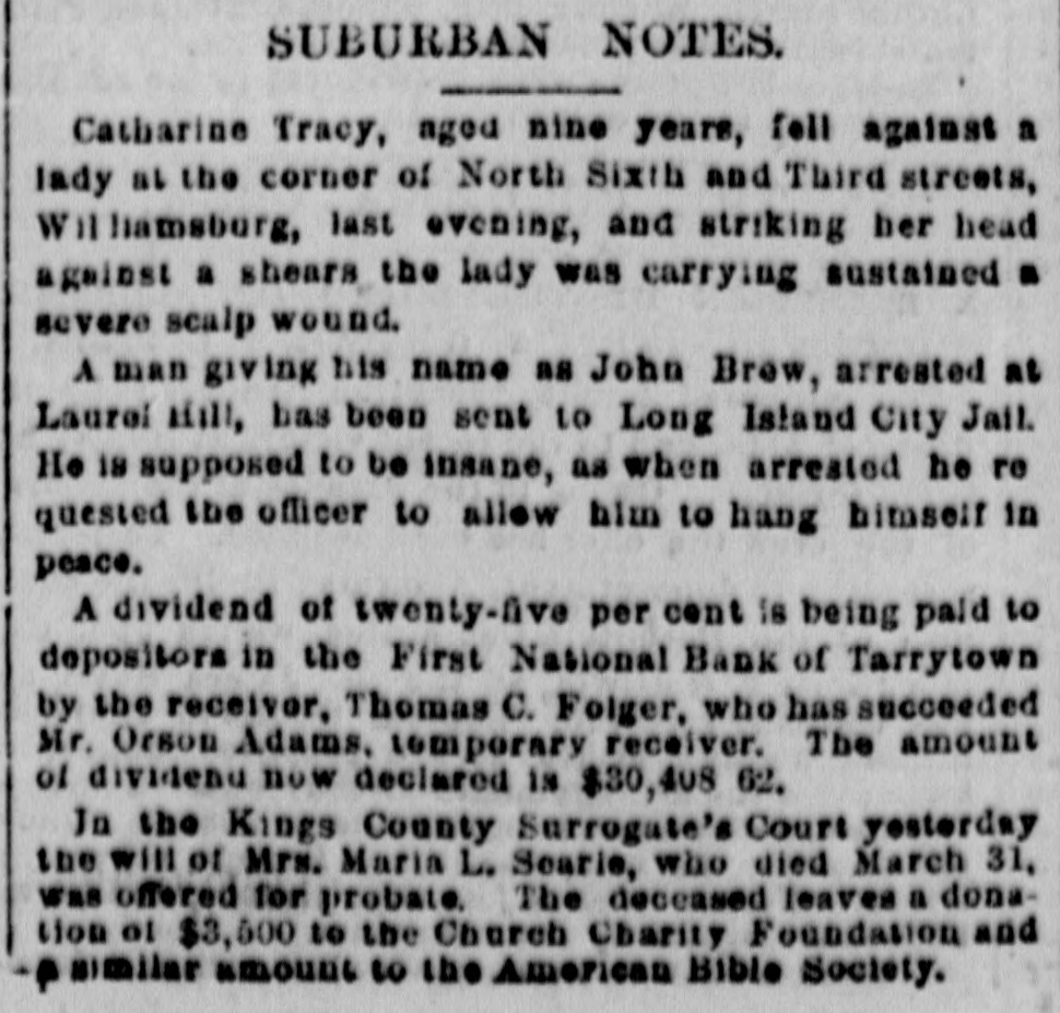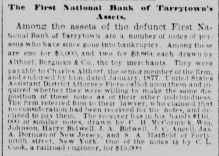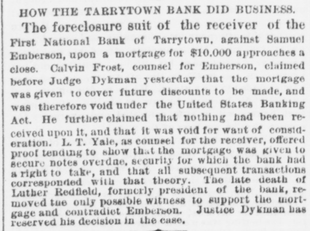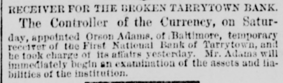 Statements made by Jacob Odell and others show that the bank has been in a weak condition since late in the Fall of last year, when it became known that Luther Redfield, its then president, was financially embarrassed. When Mr. Redfield was elected president, he was believed to be a very wealthy man, and in offering himself as one of the securities on the official bond of City Chamberlain Tappan, he swore that he was worth $200,000. This was soon after Mr. Redfield had been chosen as president, at which time he held $46,000 of the $100,000 of capital stock. He invested largely in real, estate, and shrinkage in values and poor judgment in the selection of property, it is said, have !argely contributed towards his financial embarrassment. He assumed full control of the bank's affairs, made loans without consulting the other officers or directors, and all the worthless notes now held by the bank, and which amount to over $40,000, were negotiated. it is stated, by him. Who the creditors are, represented by this worthless paper, Mr. Odell states, no one in Tarrytown knows except Mr. Redfield. Mr. Odell claims that the bank was always prosperous up to the time Mr. Redfield became president, and that all its troubles date from that time, and are due solely to the mismanagement of its affairs by Mr. Redfield. In January, at the annual election, notwithstanding that Mr. Redfield owned, as he now does, one-third of the capital stock, the stockholders declined to reëlect him, and chose A. O. Wilsea, of Greenburg, the former vice-president, for the position. Mr. Wilsea is also Supervisor of Westchester County, and it was hoped that under his management the bank could be placed on a sound basis. The illness of the new president prevented his daily attendance at the bank, and in order to avoid any further bad investments, loans of all classes were declined. A few weeks ago a letter was received from Judge Paddock, the National Bank Examiner, inquiring if the securities objected to at his examination, last year had been replaced, as promised by Mr. receiving a negative response, he Redfield, and began a second examination on Monday. His appearance at the bank, for the second time in six months, created alarm among some of the heaviest depositors, and they drew out their funds, Mr. Baker, the County Treasurer, withdrawing about $30,000. The new president, Mr. Wilsea, had on deposit $13,000 of county funds, and made a deposit, through his collector, of $1,000 on the day before the bank closed. Deposits were received and checks honored on Thursday; some of the latter being made as late as between 4 and 6 o'clock. At the latter hour, the bank examiner, at a meeting of directors, ordered that the bank close its doors, as there was an impairment of about $40,000. A meeting of the stockholders was held last night, at which Bank Examiner Paddock stated that by reason of the failure of various borrowers at the First National Bank of Tarrytown to meet their obligations, it had been compelled to suspend. This condition of affairs arose from its going abroad for loans instead of confining its business to the legitimate wants of the community where it was in business. All or nearly all of its losses arose from the failure of persons entirely unknown to the residents of Tarrytown. It would appear that depositors should be paid in full, and stockholders be able to realize something, at least, on their investment. Upon receiving the statement of the bank examiner, the stockholders held their meeting. Mr. Humphreys was in favor of the stockholders making up the impairment by a pro rata assessment of $50,000, and resuming business. It was decided by a large majority to go into voluntary liquidation. The cashier said last night that the surplus of the bank stood at $25,000. " It has been deemed prudent," he said, by three-fourths of the stockholders to go into liquidation. We chose this method of extrication in the interest of the depositors, as it saves the heavy expense of a receivership. The stockholders feel that Mr. Redfleld's bad management and reckless ventures have wrecked the bank. which was perfectly sound when he came into it. Our bonds and mortgages and cash on hand will give us $50,000, if we can realize the face of our securities, which would leave $10,000 to apply to the account of the stockholders. We have $90,000 in circulation, and the difference on our bonds on deposit with the United States Treasury will add about $18,000-so that the stockholders may realize at least 25 cents on the doilar."