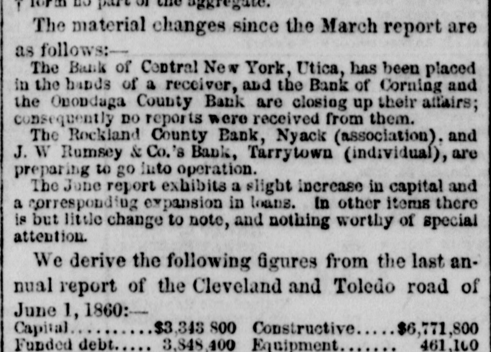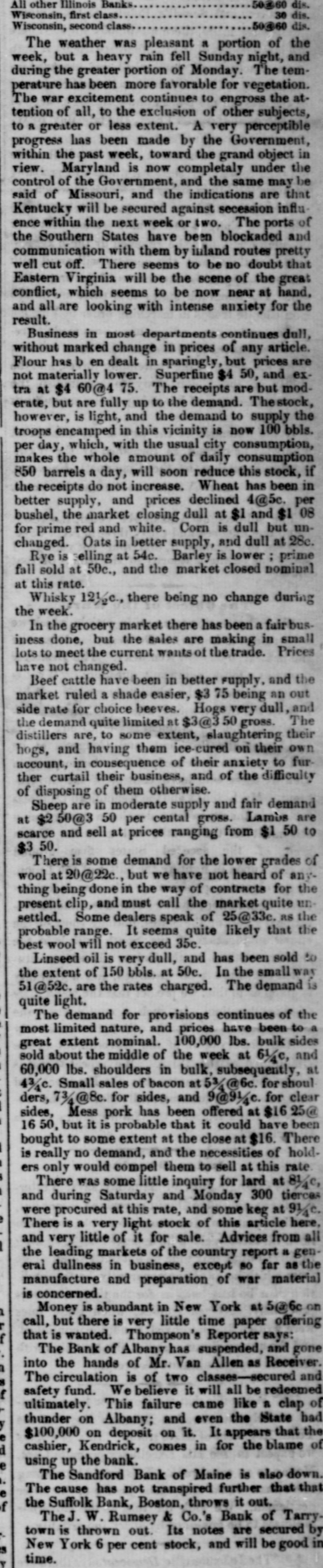 50360 dis. All other Illinois Banks 30 dis. Wisconsin, first class 50@60 dis. Wisconsin, second class The weather was pleasant a portion of the week, but a heavy rain fell Sunday night, and during the greater portion of Monday. The temperature has been more favorable for vegetation. The war excitement continues to engross the attention of all, to the exclusion of other subjects, to a greater or less extent. A very perceptible progress has been made by the Government, within the past week, toward the grand object in view. Maryland is now completaly under the control of the Government, and the same may be said of Missouri, and the indications are that Kentucky will be secured against secession influence within the next week or two. The ports of the Southern States have been blockaded and communication with them by iuland routes pretty well cut off. There seems to be no doubt that Eastern Virginia will be the scene of the great conflict, which seems to be now near at hand, and all are looking with intense anxiety for the result. Business in most departments continues dull, without marked change in prices of any article. Flour has b en dealt in sparingly, but prices are not materially lower. Superfine $4 50, and exThe receipts are but moderate, but are fully up to the demand. The stock, however, is light, and the demand to supply the troops encamped in this vicinity is now 100 bbls. per day, which, with the usual city consumption, makes the whole amount of daily consumption 850 barrels a day, will soon reduce this stock, if the receipts do not increase. Wheat has been in better supply, and prices declined 4@5c. per bushel, the market closing dull at $1 and $1 08 for prime red and white. Corn is dull but unchanged. Oats in better supply, and dull at 28e. Rye is elling at 54c. Barley is lower prime fall sold at 50c., and the market closed nominal at this rate. Whisky 121/c., there being no change during the week. In the grocery market there has been a fairbusiness done, but the sales are making in small lots to meet the current wants of the trade. Prices have not changed. Beef cattle have been in better supply. and the market ruled a shade easier, $3.75 being an out side rate for choice beeves. Hogs very dull, and the demand quite limited at $3@3.50 gross. The distillers are, to some extent, slaughtering their hogs, and having them ice-cured on their own account, in consequence of their anxietv to further curtail their business, and of the difficulty of disposing of them otherwise. Sheep are in moderate supply and fair demand at $2 50@3 50 per cental gross. Lambs are scarce and sell at prices ranging from $1 50 to $3 50. There is some demand for the lower grades of wool at 20@22c., but we have not heard of anything being done in the way of contracts for the present clip, and must call the market quite unsettled. Some dealers speak of 25@33c. RS the probable range. It seems quite likely that the best wool will not exceed 35c. Linseed oil is very dull, and has been sold to the extent of 150 bbls. at 50c. In the small 51@52c. are the rates charged. The demand is quite light. The demand for provisions continues of the most limited nature, and prices have been to a great extent nominal. 100,000 lbs. bulk sides sold about the middle of the week at 61/c, and 60,000 lbs. shoulders in bulk, subsequently, at 43/c. Small sales of bacon at 53 @6c. for shoul ders, 73/488c. for sides, and 9@91/4c. for clear sides, Mess pork has been offered at $16 25@ 50, but it is probable that it could have been bought to some extent at the close at $16. There is really no demand, and the necessities of holders only would compel them to sell at this rate There was some little inquiry for lard at 81/4e, and during Saturday and Monday 300 tierces were procured at this rate, and some keg at 91/4e. There is a very light stock of this article here. and very little of it for sale. Advices from all the leading markets of the country report a general dullness in business, except so far as the manufacture and preparation of war material is concerned. Money is abundant in New York at 5@6c on call, but there is very little time paper offering that is wanted. Thompson's Reporter says: The Bank of Albany has suspended, and gone into the hands of Mr. Van Allen as Receiver. h The circulation is of two classes-secured and f safety fund. We believe it will all be redeemed ultimately. This failure came like a clap of thunder on Albany; and even the State had y e $100,000 on deposit on it. It appears that the d cashier, Kendrick, comes in for the blame of using up the bank. e The Sandford Bank of Maine is also down. . The cause has not transpired further that that e the Suffolk Bank, Boston, throws it out. f The J. W. Rumsey & Co.'s Bank of Tarry town is thrown out. Its notes are secured by s New York 6 per cent stock, and will be good in time.