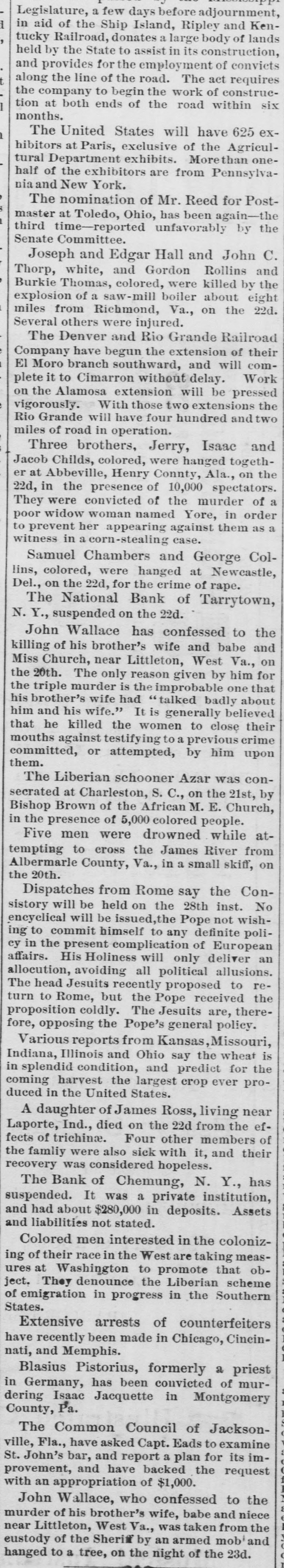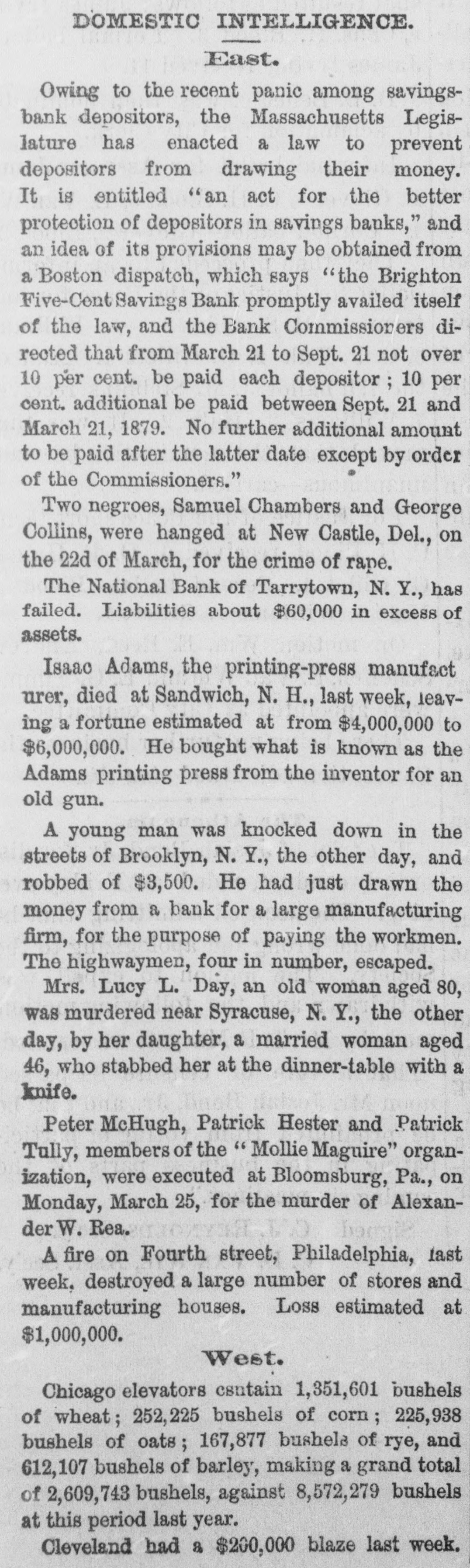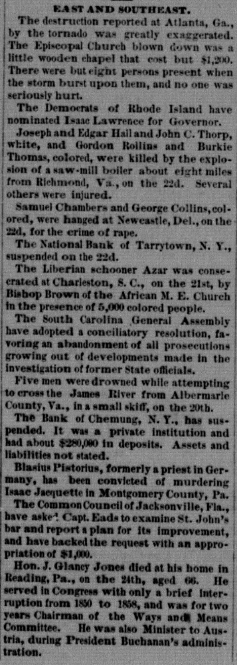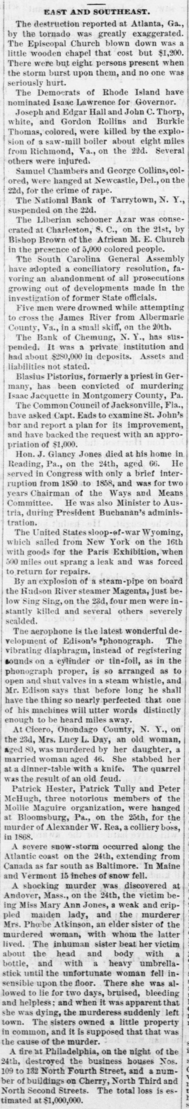 EAST AND SOUTHEAST. The destruction reported at Atlanta, Ga., by the tornado was greatly exaggerated. The Episcopal Church blown down was a little wooden chapel that cost but $1,200. There were but eight persons present when the storm burst upon them, and no one was seriously hurt. The Democrats of Rhode Island have nominated Isaae Lawrence for Governor. Joseph and Edgar Hall and John C. Thorp, white, and Gordon Rollins and Burkie Thomas, colored, were killed by the explosion of a saw-mill boiler about eight miles from Richmond, Va., on the 22d. Several others were injured. Samuel Chambers and George Collins, colored, Were hanged at Newcastle, Del., on the 22d, for the crime of rape. The National Bank of Tarrytown, N. Y., suspended on the 22d. The Liberian schooner Azar was consecrated at Charleston, S. C., on the 21st, by Bishop Brown of the African M. E. Church in the presence of 5,000 colored people. The South Carolina General Assembly have adopted a conciliatory resolution, favoring an abandonment of all prosecutions growing out of developments made in the investigation of former State officials. Five men were drowned while attempting to cross the James River from Albermarle County, Va., in a small skiff, on the 20th. The Bank of Chemung, N. Y., has suspended. It was a private institution and had about $280,000 in deposits. Assets and liabilities not stated. Blasius Pistorius, formerly a priest in Germany, has been convicted of murdering Isaac Jacquette in Montgomery County, Pa. The Common Council of Jacksonville, Fla., have asked Capt. Eads to examine St. John's bar and report a plan for its improvement, and have backed the request with an appropriation of $1,000. Hon. J. Glancy Jones died at his home in Reading, Pa., on the 24th, aged 66. He served in Congress with only a brief interruption from 1850 to 1858, and was for two years Chairman of the Ways and Means Committee. He was also Minister to Austria, during President Buchanan's administration. The United States sloop-ef-war Wyoming, which sailed from New York on the 16th with goods for the Paris Exhibition, when 500 miles out sprang a leak and was forced to return for repairs. By an explosion of a steam-pipe on board the Hudson River steamer Magenta, just below Sing Sing, on the 23d, four men were instantly killed and several others severely scalded. The aerophone is the latest wonderful development of Edison's "phonograph. The vibrating diaphragm, instead of registering sounds on a cylinder or tin-foil, as in the phonograph proper, is SO arranged as to open and shut valves in a steam whistle, and Mr. Edison says that before long he shall have the thing SO nearly perfected that one of his machines will utter words distinctly enough to be heard miles away. At Cicero, Onondago County, N. Y., on the 23d, Mrs. Lucy L. Day, an old woman, aged 80, was murdered by her daughter, a married woman aged 46. She stabbed her at a dinner-table with a knife. The quarrel was the result of an old feud. Patrick Hester, Patrick Tully and Peter McHugh, three notorious members of the Mollie Maguire organization, were hanged at Bloomsburg, Pa., on the 25th, for the murder of Alexander W. Rea, a colliery boss, in 1868. A severe snow-storm occurred along the Atlantic coast on the 24th, extending from Canada as far south as Baltimore. In Maine and Vermont 15 inches of snow fell. A shocking murder was discovered at Andover, Mass., on the 24th, the victim being Miss Mary Ann Jones, a weak and crippled maiden lady, and the murderer Mrs. Phobe Atkinson, an elder sister of the murdered woman, with whom the latter lived. The inhuman sister beat her victim about the head and body with a bottle, and with a heavy umbrellastick until the unfortunate woman fell insensible upon the floor. There she was allowed to lie for two days, bruised, bleeding and helpless; and when it was apparent that she was dying, the murderess suddenly left town. The sisters owned a little property in common, and it is supposed that that was the cause of the murder. A fire at Philadelphia, on the night of the to 24th, destroyed the business houses Nos. 109 to 132 North Fourth Street, and a numher of buildings on Cherry North Third and