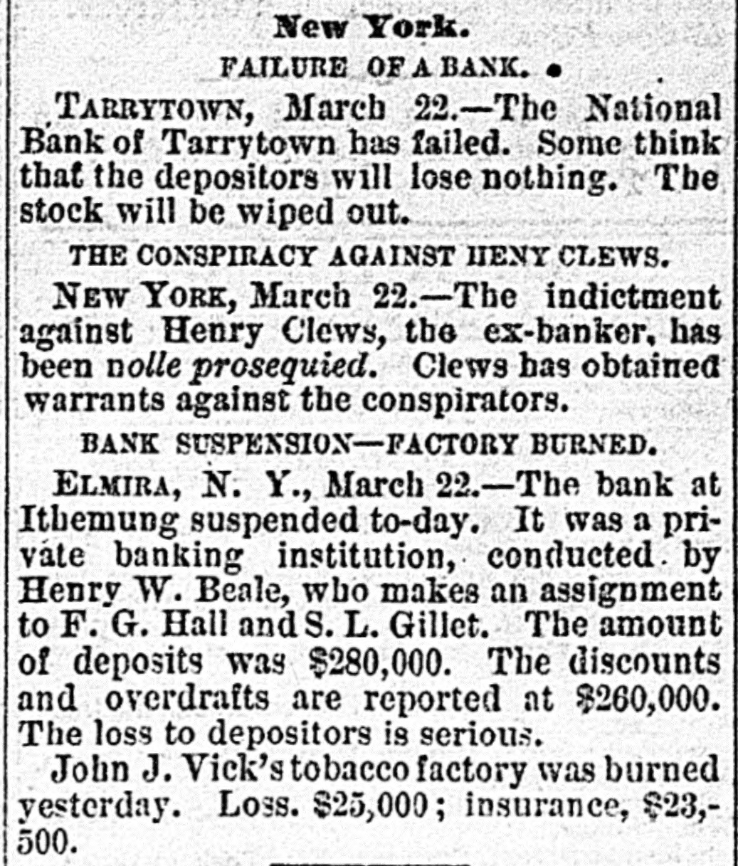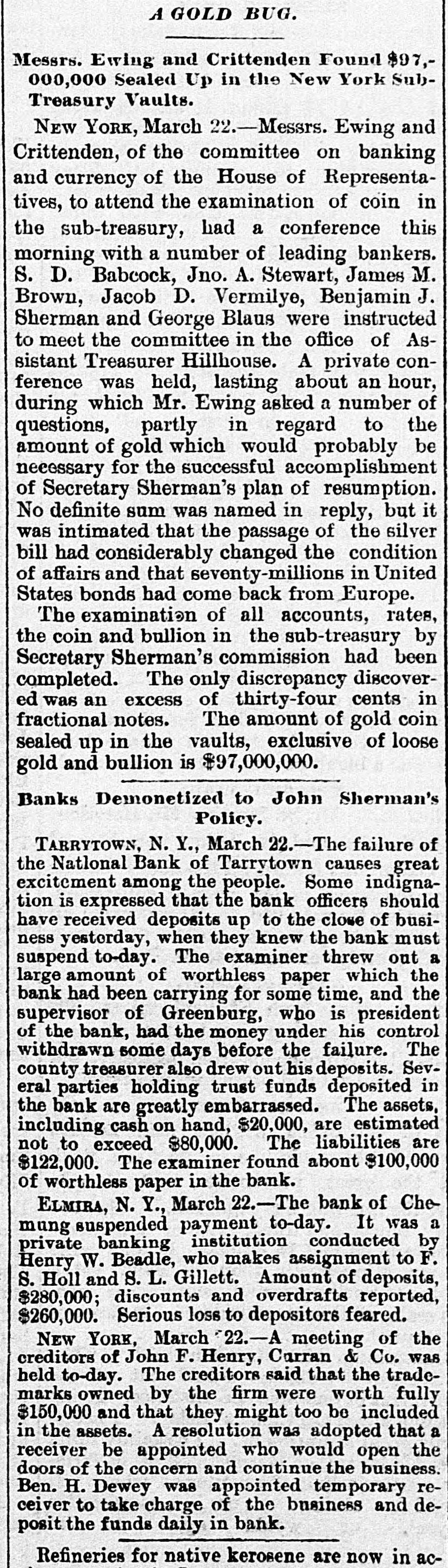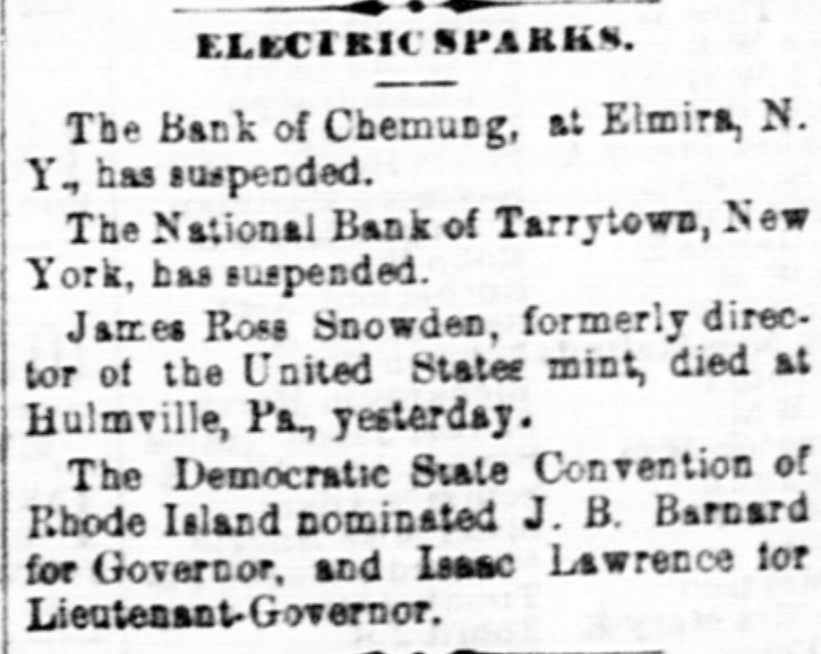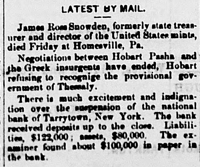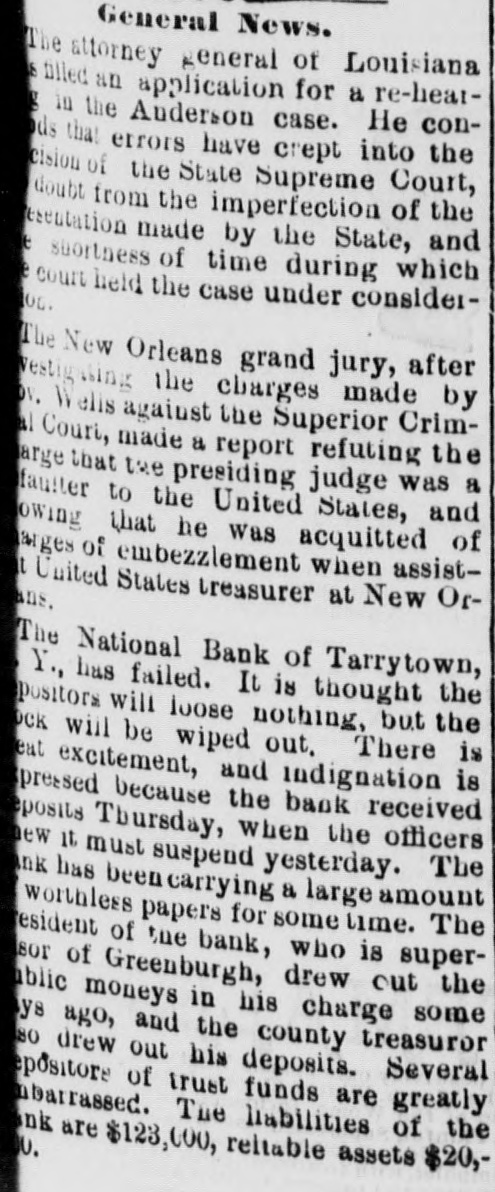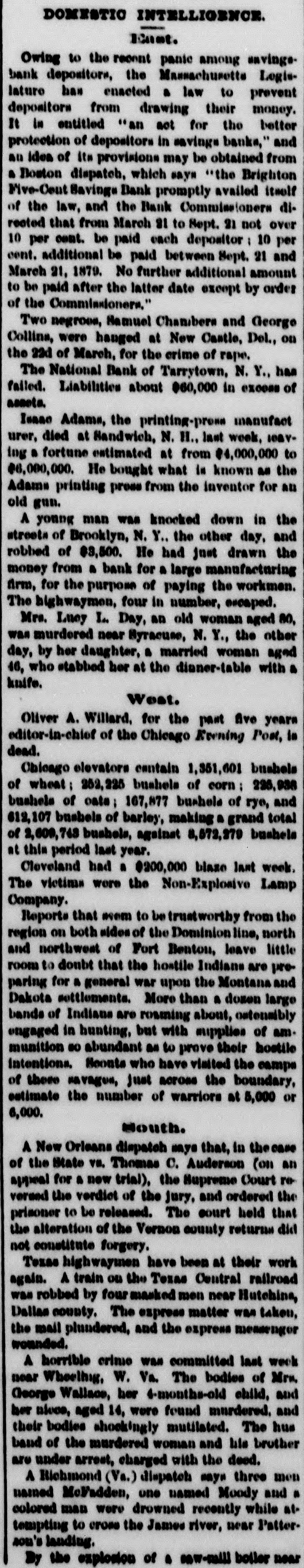 EAST AND SOUTHEAST. The destruction reported at Atlanta, Ga., by the tornado was greatly exaggerated. The Episcopal Church blown down was a little wooden chapel that cost but $1,200. There were but eight persons present when the storm burst upon them, and no one was seriously hurt. The Democrats of Rhode Island have nominated Isaae Lawrence for Governor. Joseph and Edgar Hall and John C. Thorp, white, and Gordon Rollins and Burkie Thomas, colored, were killed by the explosion of a saw-mill boiler about eight miles from Richmond, Va., on the 22d. Several others were injured. Samuel Chambers and George Collins, colored, Were hanged at Newcastle, Del., on the 22d, for the crime of rape. The National Bank of Tarrytown, N. Y., suspended on the 22d. The Liberian schooner Azar was consecrated at Charleston, S. C., on the 21st, by Bishop Brown of the African M. E. Church in the presence of 5,000 colored people. The South Carolina General Assembly have adopted a conciliatory resolution, favoring an abandonment of all prosecutions growing out of developments made in the investigation of former State officials. Five men were drowned while attempting to cross the James River from Albermarle County, Va., in a small skiff, on the 20th. The Bank of Chemung, N. Y., has suspended. It was a private institution and had about $280,000 in deposits. Assets and liabilities not stated. Blasius Pistorius, formerly a priest in Germany, has been convicted of murdering Isaac Jacquette in Montgomery County, Pa. The Common Council of Jacksonville, Fla., have asked Capt. Eads to examine St. John's bar and report a plan for its improvement, and have backed the request with an appropriation of $1,000. Hon. J. Glancy Jones died at his home in Reading, Pa., on the 24th, aged 66. He served in Congress with only a brief interruption from 1850 to 1858, and was for two years Chairman of the Ways and Means Committee. He was also Minister to Austria, during President Buchanan's administration. The United States sloop-ef-war Wyoming, which sailed from New York on the 16th with goods for the Paris Exhibition, when 500 miles out sprang a leak and was forced to return for repairs. By an explosion of a steam-pipe on board the Hudson River steamer Magenta, just below Sing Sing, on the 23d, four men were instantly killed and several others severely scalded. The aerophone is the latest wonderful development of Edison's "phonograph. The vibrating diaphragm, instead of registering sounds on a cylinder or tin-foil, as in the phonograph proper, is SO arranged as to open and shut valves in a steam whistle, and Mr. Edison says that before long he shall have the thing SO nearly perfected that one of his machines will utter words distinctly enough to be heard miles away. At Cicero, Onondago County, N. Y., on the 23d, Mrs. Lucy L. Day, an old woman, aged 80, was murdered by her daughter, a married woman aged 46. She stabbed her at a dinner-table with a knife. The quarrel was the result of an old feud. Patrick Hester, Patrick Tully and Peter McHugh, three notorious members of the Mollie Maguire organization, were hanged at Bloomsburg, Pa., on the 25th, for the murder of Alexander W. Rea, a colliery boss, in 1868. A severe snow-storm occurred along the Atlantic coast on the 24th, extending from Canada as far south as Baltimore. In Maine and Vermont 15 inches of snow fell. A shocking murder was discovered at Andover, Mass., on the 24th, the victim being Miss Mary Ann Jones, a weak and crippled maiden lady, and the murderer Mrs. Phobe Atkinson, an elder sister of the murdered woman, with whom the latter lived. The inhuman sister beat her victim about the head and body with a bottle, and with a heavy umbrellastick until the unfortunate woman fell insensible upon the floor. There she was allowed to lie for two days, bruised, bleeding and helpless; and when it was apparent that she was dying, the murderess suddenly left town. The sisters owned a little property in common, and it is supposed that that was the cause of the murder. A fire at Philadelphia, on the night of the to 24th, destroyed the business houses Nos. 109 to 132 North Fourth Street, and a numher of buildings on Cherry North Third and