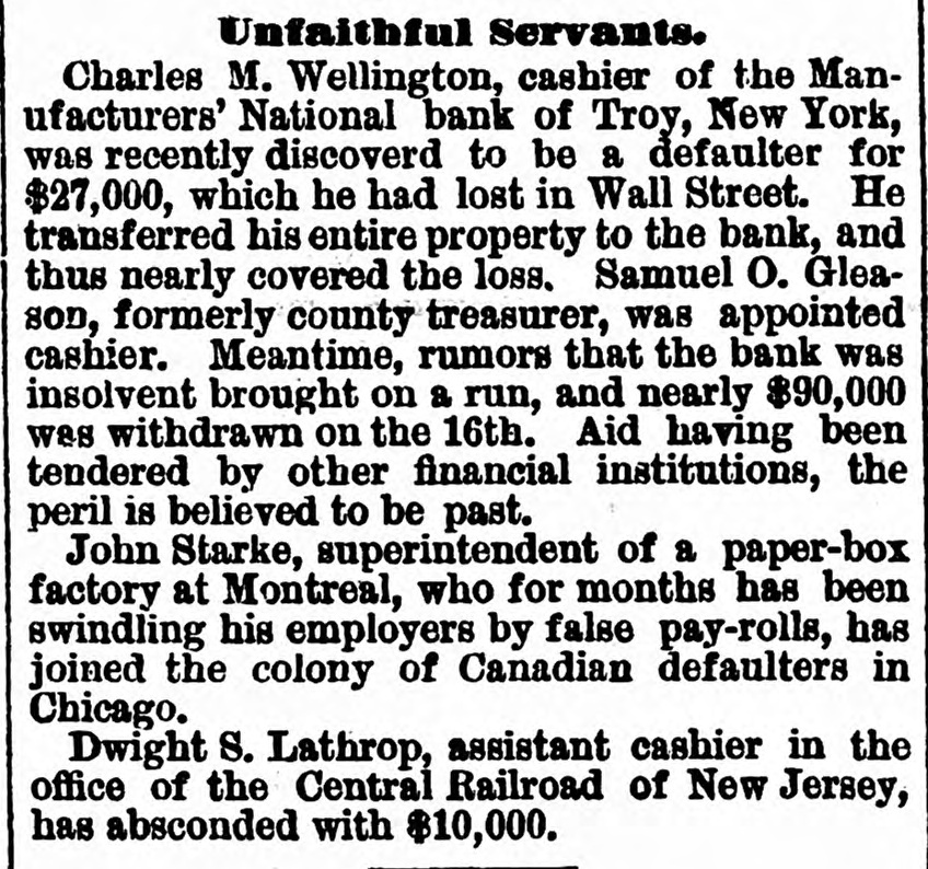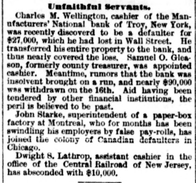 Unfaithful Servants. Charles M. Wellington, cashier of the Manufacturers' National bank of Troy, New York, was recently discoverd to be a defaulter for $27,000, which he had lost in Wall Street. He transferred his entire property to the bank, and thus nearly covered the loss. Samuel O. Gleason, formerly county treasurer, was appointed cashier. Meantime, rumors that the bank was insolvent brought on a run, and nearly $90,000 was withdrawn on the 16th. Aid having been tendered by other financial institutions, the peril is believed to be past. John Starke, superintendent of a paper-box factory at Montreal, who for months has been swindling his employers by false pay-rolls, has joined the colony of Canadian defaulters in Chicago. Dwight S. Lathrop, assistant cashier in the office of the Central Railroad of New Jersey, has absconded with $10,000.