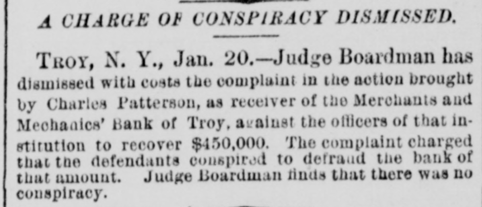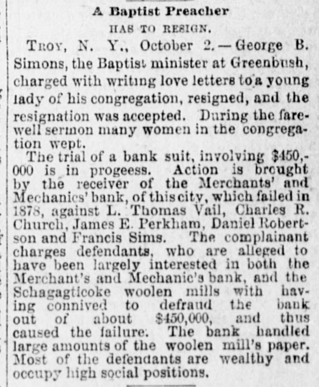 A Baptist Preacher HAS TO RESIGN. TROY, N. Y., October 2. - George B. Simons, the Baptist minister at Greenbush, charged with writing love letters to a young lady of his congregation, resigned, and the resignation was accepted. During the farewell serinon many women in the congregation wept. The trial of a bank suit, involving $450,000 is in progeess. Action is brought by the receiver of the Merchants' and Mechanics' bank, of this city, which failed in 1878, against L. Thomas Vail, Charles R. Church, James E. Perkham, Daniel Robertson and Francis Sims. The complainant charges defendants. who are alleged to have been largely interested in both the Merchant's and Mechanic's bank, and the Schagagticoke woolen mills with having connived to defraud the bank out of about $450,000, and thus caused the failure. The bank handled large amounts of the woolen mill's paper. Most of the defendants are wealthy and occupy high social positions.