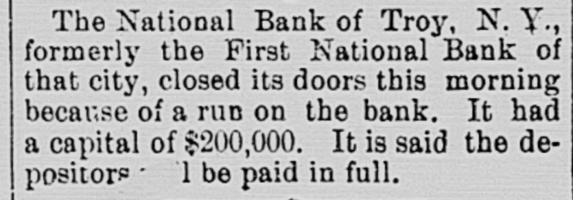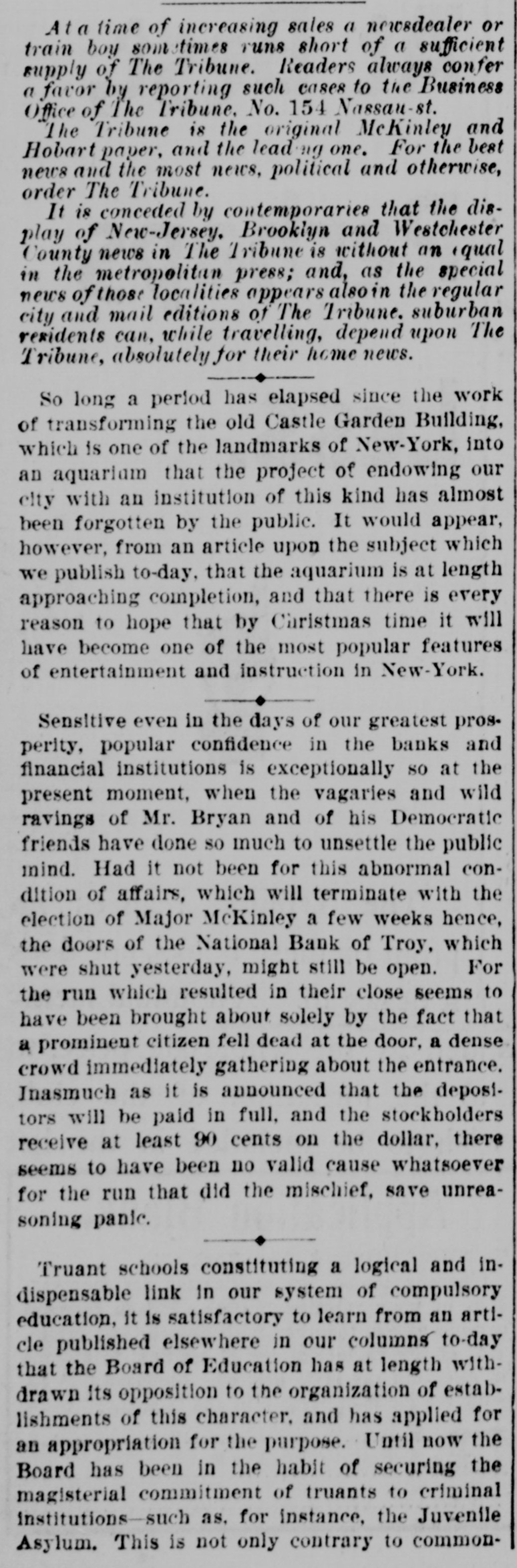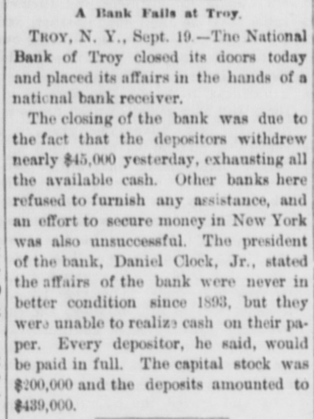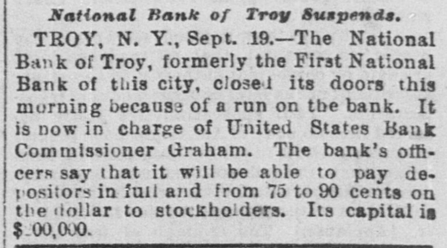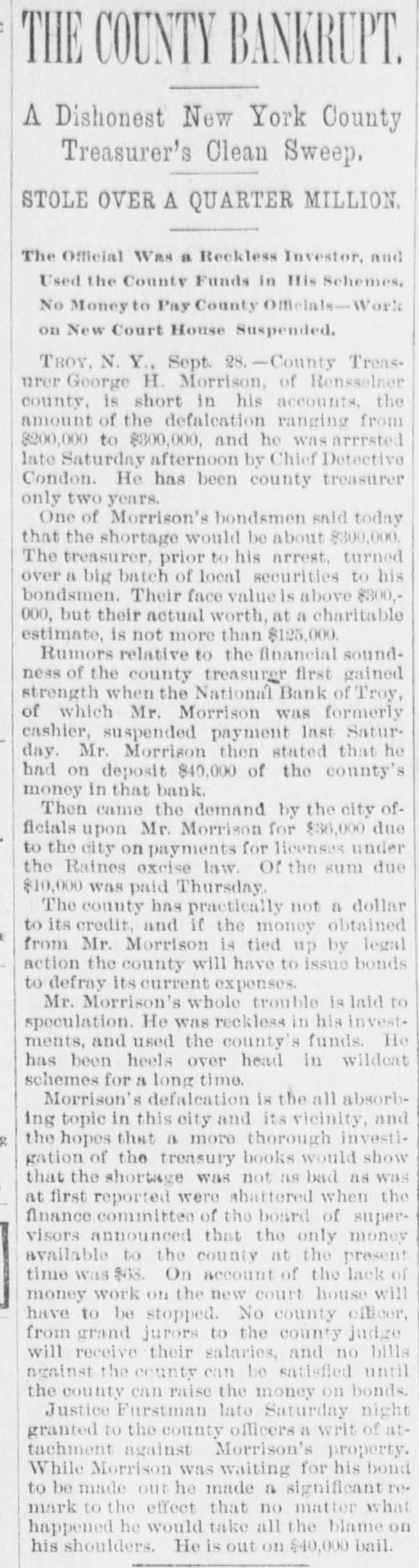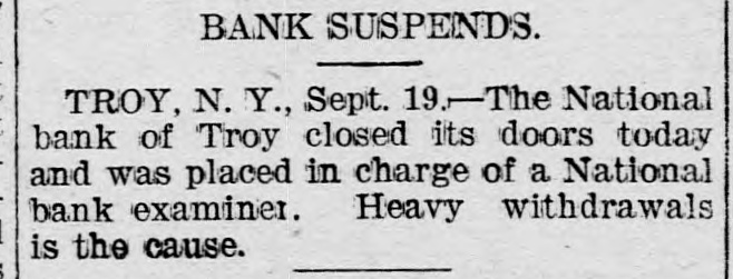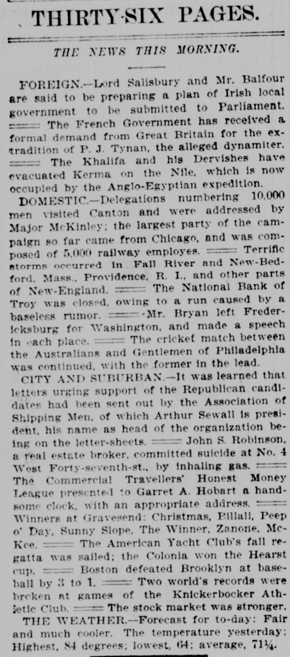 CONDENSED NEWS Gathered From All Parts of the Country by Telegraph. The steamship New York, sailing Saturday for Europe, took 458,000 ounces of silver. The steamship St. Louis, which arrived from Europe Saturday, brought $665,000 in gold. Total arrivals to date, $27,836,550. The democratic congressional conferees for the Fourteenth Pennsyvania district have nominated J. F. Klugh, of Dauphin, for congress. James Swimmer, a full-blood Cherokee Indian, and Henry Williams, a colored youth of 18, were hanged at Talequah, I. T., for murder. By the collision of a freight and coal train on the Delaware, Lackawanna & Western railroad near Halstead, Pa., Friday morning, Engineer Coddington, of the former train was killed. The banking house of S. H. Watson & Sons, Tinton, Ia., established for 40 years, made a general assignment Friday afternoon to Mat Gaasch for the benefit of their creditors. Liabilities $250,000; assets $350,000. Depositors and creditors will be paid in full. Four mills of the Hazardville Powder Co., Hazardville, Ct., blew up at 6 o'clock Saturday morning, the shock being strongly felt for a region of 20 miles about. No one was killed or injured so far as known, as the workmen had not yet entered the mills. The explosion was caused by lightning. Benj. Harrison will make some campaign speeches in October and the fears of the republican national executive committeemen at Chicago headquarters were set at rest Friday by the welcome intelligence. It was received Friday afternoon in the form of a personal letter from the ex-president. Richard Cobb, son of ex-Gov. R. W. Cobb, was shot and probably fatally wounded. He was walking across a bridge when he stumbled and discharged a rifle he was carrying in his hand. When the gun struck the bridge it was discharged, the ball passing through Mr. Cobb's lungs and ranging into the shoulder. The National Bank of Troy, formerly the First national bank, of Troy, N. Y., closed its doors Saturday morning, because of a run on the bank, and is now in charge of United States Bank Examiner Graham. The bank officers state that it will be able to pay depositors in full and from 75 to 90 cents on the dollar to stockholders. The capital is $200,000. A dispatch from Constantinople states that a number of softas (theological students) and members of the young Turkey party had a desperate fight in Galata on Wednesday. Fifteen of the combatants were killed. The dispatch adds that many of the archives of the British embassy have been placed for safety on the British guardship on the Bosporus. Albert George Whitehead, recently released from Portland prison, arrived in, New York Friday night on the Cunard line steamship Lucania, which reached her dock at 6:45 o'clock Friday night. Gen. James R. O'Beirne, chairman of the conference committee, Whitehead's brother and others who were permitted to converse with Whitehead, said that he was sane. Pratt, Simmons & Krausnick, whole-