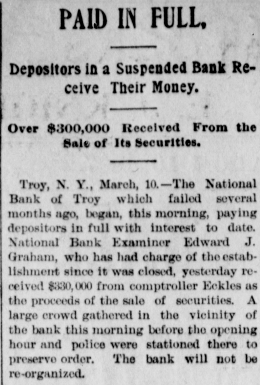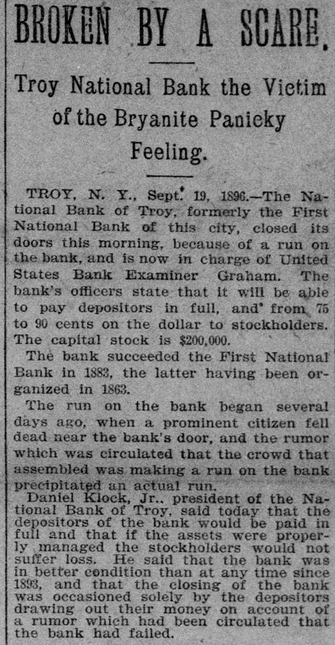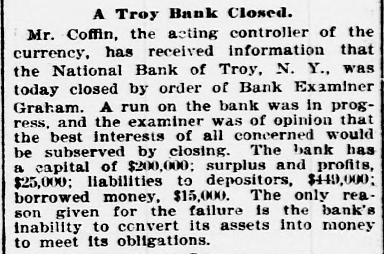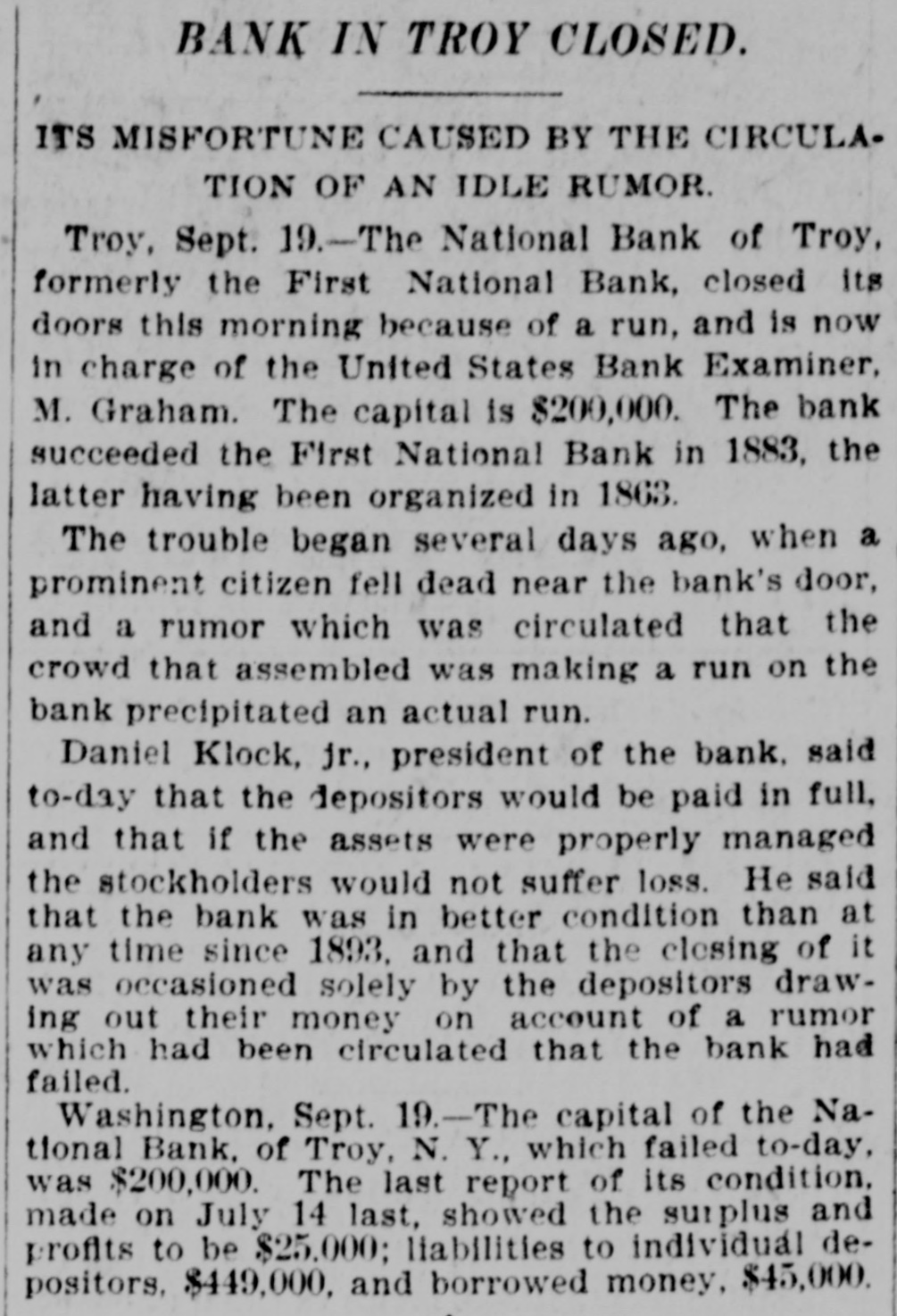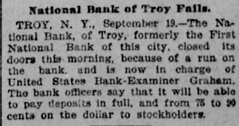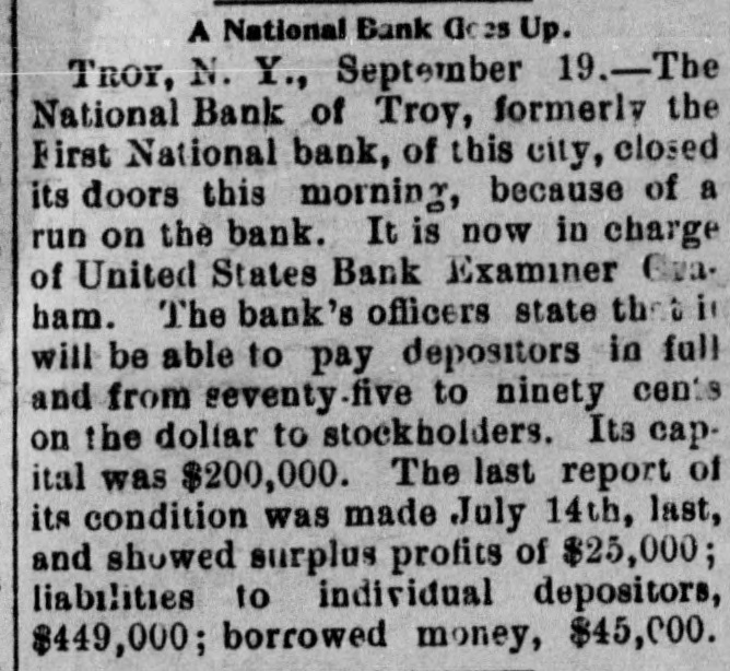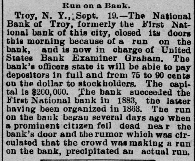 CONDENSED NEWS Gathered From All Parts of the Country by Telegraph. The steamship New York, sailing Saturday for Europe, took 458,000 ounces of silver. The steamship St. Louis, which arrived from Europe Saturday, brought $665,000 in gold. Total arrivals to date, $27,836,550. The democratic congressional conferees for the Fourteenth Pennsyvania district have nominated J. F. Klugh, of Dauphin, for congress. James Swimmer, a full-blood Cherokee Indian, and Henry Williams, a colored youth of 18, were hanged at Talequah, I. T., for murder. By the collision of a freight and coal train on the Delaware, Lackawanna & Western railroad near Halstead, Pa., Friday morning, Engineer Coddington, of the former train was killed. The banking house of S. H. Watson & Sons, Tinton, Ia., established for 40 years, made a general assignment Friday afternoon to Mat Gaasch for the benefit of their creditors. Liabilities $250,000; assets $350,000. Depositors and creditors will be paid in full. Four mills of the Hazardville Powder Co., Hazardville, Ct., blew up at 6 o'clock Saturday morning, the shock being strongly felt for a region of 20 miles about. No one was killed or injured so far as known, as the workmen had not yet entered the mills. The explosion was caused by lightning. Benj. Harrison will make some campaign speeches in October and the fears of the republican national executive committeemen at Chicago headquarters were set at rest Friday by the welcome intelligence. It was received Friday afternoon in the form of a personal letter from the ex-president. Richard Cobb, son of ex-Gov. R. W. Cobb, was shot and probably fatally wounded. He was walking across a bridge when he stumbled and discharged a rifle he was carrying in his hand. When the gun struck the bridge it was discharged, the ball passing through Mr. Cobb's lungs and ranging into the shoulder. The National Bank of Troy, formerly the First national bank, of Troy, N. Y., closed its doors Saturday morning, because of a run on the bank, and is now in charge of United States Bank Examiner Graham. The bank officers state that it will be able to pay depositors in full and from 75 to 90 cents on the dollar to stockholders. The capital is $200,000. A dispatch from Constantinople states that a number of softas (theological students) and members of the young Turkey party had a desperate fight in Galata on Wednesday. Fifteen of the combatants were killed. The dispatch adds that many of the archives of the British embassy have been placed for safety on the British guardship on the Bosporus. Albert George Whitehead, recently released from Portland prison, arrived in, New York Friday night on the Cunard line steamship Lucania, which reached her dock at 6:45 o'clock Friday night. Gen. James R. O'Beirne, chairman of the conference committee, Whitehead's brother and others who were permitted to converse with Whitehead, said that he was sane. Pratt, Simmons & Krausnick, whole-