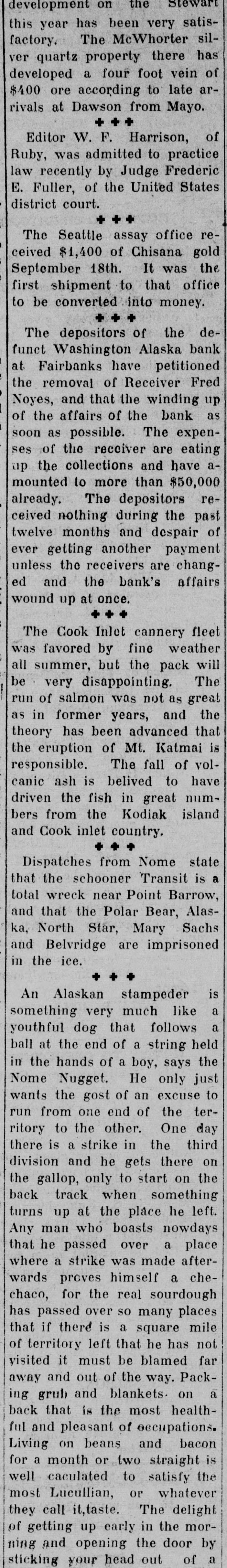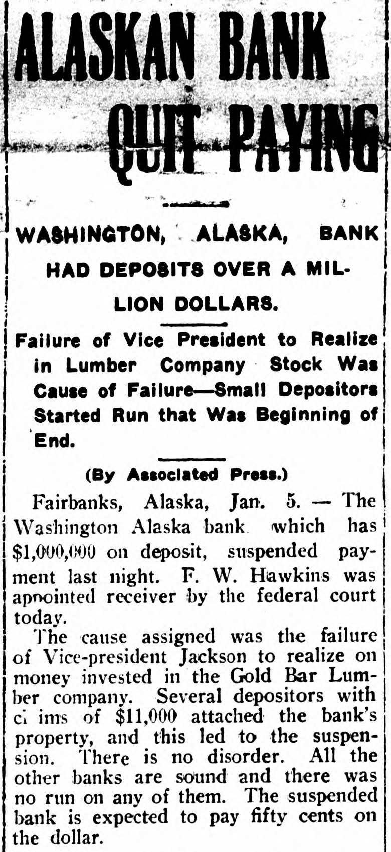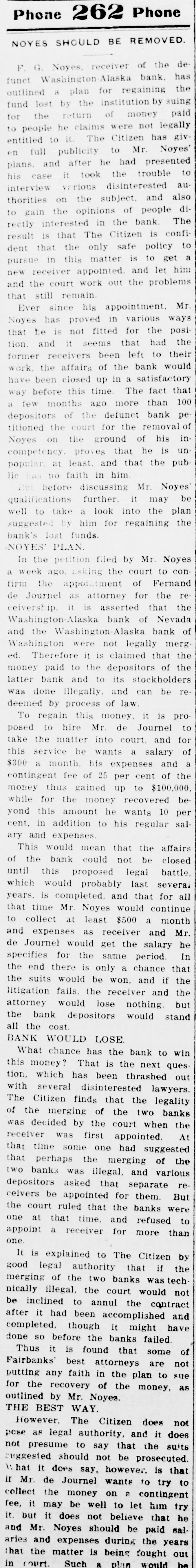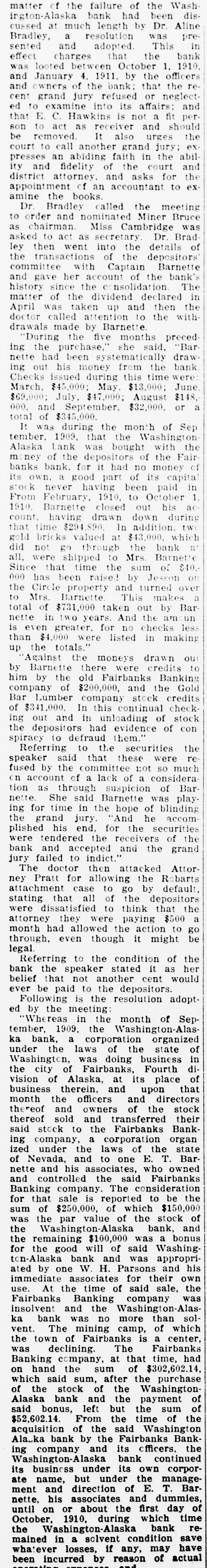 matter of the had been dislength by Dr. preBradley, cussed ington-Alaska at a much resolution bank adopted. was This Aline in effect sented and the bank was January looted charges between 4. 1911. that October by the 1. officers the 1910. reand of the bank: that neglect. and owners grand jury refused affairs: or and cent examine into its a fit pered to C. Hawkins is not should son to act It also removed. that E as receiver and urges the ex be call another grand jury: the abilan abiding faith and and fidelity asks for the court ity presses to of and the in court exdistrict appointment attorney. of an accountant to amine the books. called the meeting Dr. Bradley nominated Miner Bruce to order and Miss Cambridge was asked as chairman to act as secretary the details Dr. Brad of ley then went into of the depositors Barnette the transactions with Captain bank's committee her account of the The matter and gave since the consolidation declared history of the dividend and then the in April was called taken attention up to the withthe five preceddoctor drawals made by Barnette months Bar said. "During the purchase." vstematically she draw ing had been the bank nette his money from time were ing out issued during this $13,000; June Checks May $148, March, $45,000; July, $47,000; August or a 000. $69,000; and September, $32,000. total It was of $345,000. during the the month Washington of Sep tember. 1909, was that bought with Fair the Alaska Lank the depositors of money the of money of it had no banks bank. good for part of its capital in own. a been paid stock its never having to October ac 1. Barnette From February, closed 1910, out his down during count. 1910. having drawn In addition. tw $294,890 which that time valued at $43,000. bank gold brio ks go through the Barnette did not to Mrs. $10. all. were shipped time the sum of or Jesson Since has that been raise! by turned over 000 property and the Circle Barnette This makes by Bar a to Mrs. of $731,000 taken out the am un total two years. And even greater. in making than is nette $4,000 in were for listed no checks less up the moneys drawn to Against were Barnette totals." the there credits Banking out by the old Fairbanks the Gold company stock him Bar Lumber by of $200,000, company continual and credits check$341,000. In of stock ing out and had evidence of of the depositors in this unloading them. con the spiracy to defraud securities to were speaker Referring said committee that the these not so much refused by the of a considera account a of on as through of lack Barnette suspicion was play- Bar nette the hope tion She said of blinding securities ing the for grand time jury end. in for And the he accom- of the plished his the receivers the grand were and accepted and bank tendered indict." ney jury failed to then attacked Robarts Attorfor by default, The Pratt doctor case allowing to go the depositors attachment of the the were were paying a allowed the stating attorney dissatisfied that they all to think action that $500 to go be month through, had even though it might the legal. to the condition it as of her that not bank Referring the speaker another stated cent would is belief ever be paid to the the resolution depositors adoptFollowing by the meeting month of SepWhereas in the Washington-Alastember, corporation ka ed bank, 1909, a the of the organized state of in the laws doing business diFairbanks, the Washington, under city of Alaska, was at its Fourth place that of vision of therein, and upon directors the of the month business officers owners and stock their and transferred said thereof thereof company, stock sold to and a the corporation Fairbanks the organ Bank- state ing laws of Barand to who owned nette ized of Nevada, under and his the associates, the one said E. Fairbanks T. controlled consideration Banking is reported and that company sale of The which to $150,000 be the for $250,000, stock of bonus remaining of said sum the was Washington-Alaska of par value $100,000 of the was bank, Washing- a and for the good and was and his the ton-Alaska one bank W. will H. Parsons their appropri- own ated by associates for said sale, the immediate At the time of company was and more Fairbanks use. Banking the Washington-Alas solthan ka insolvent bank was mining no camp, of center, which vent. The of Fairbanks is Fairbanks a company, of the Banking was town declining. at The that $302,602.14, time, had hand the sum the purchase on said sum, the Washington. of which stock of after payment of the and the sum of the From the Washington said Alaska $52,602.14 bonus, bank of left the but said time the of Bankacquisition bank by the its officers, the Ala_ka company and bank Fairbanks continued corporWashington-Alaska its own its business name, but under under of the E. manage- T. Barate direction and dummies, nette, about the time until October, ment on and his or 1910, associates during -Alaska first which bank day save re- of mained Washington-Alain condition have been incurred by whatever the in losses, a solvent if reason any, may of actual