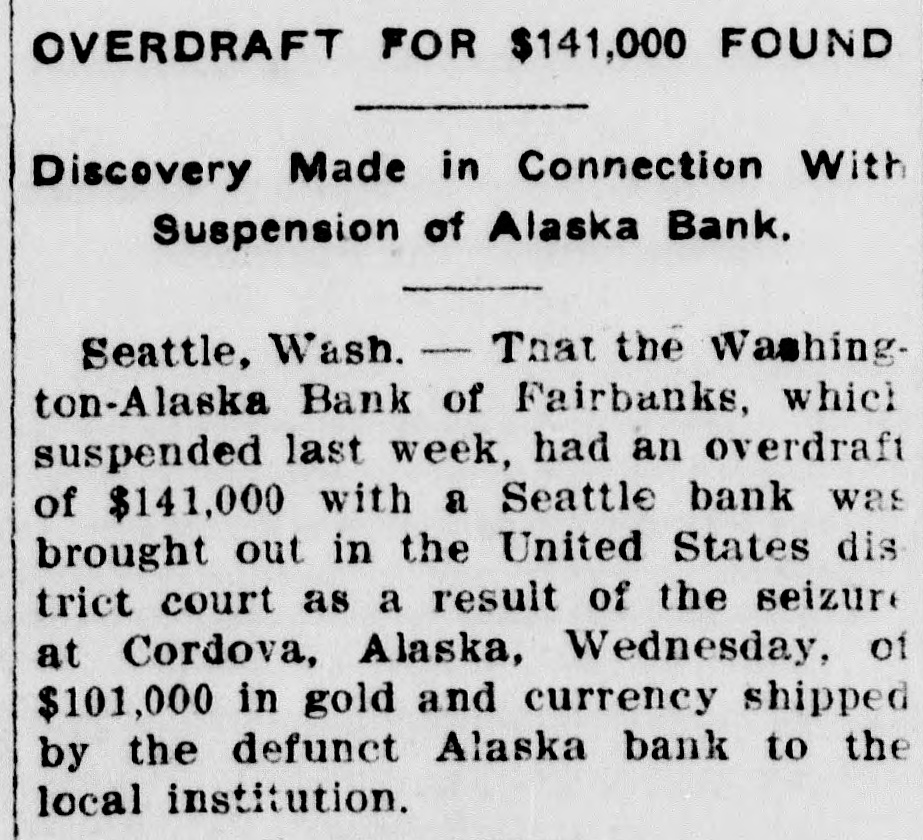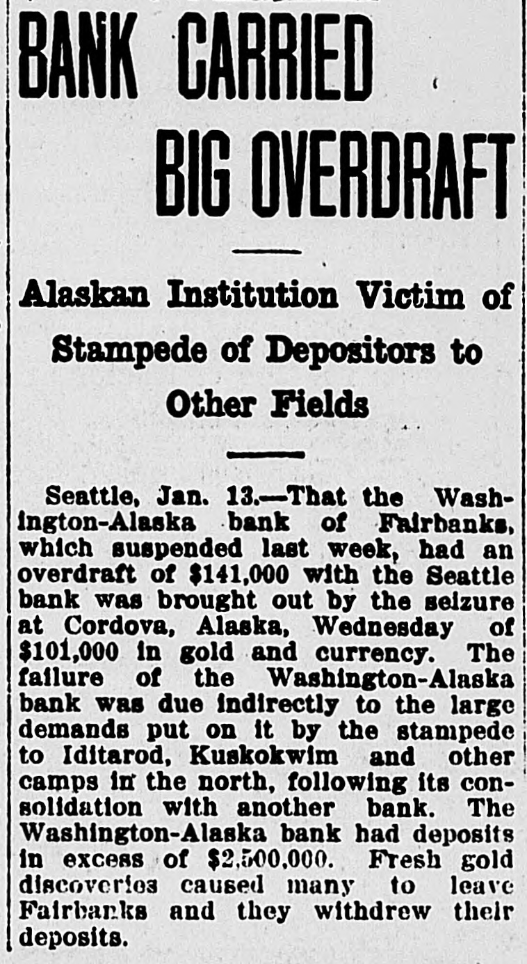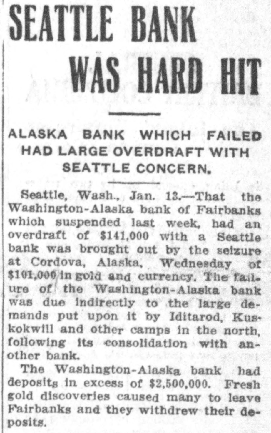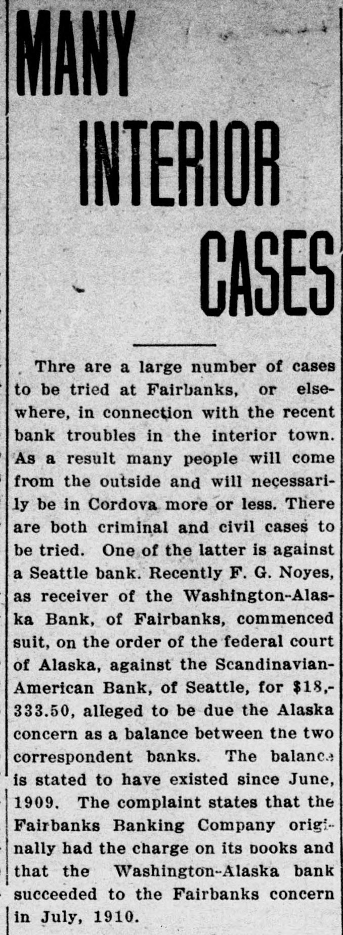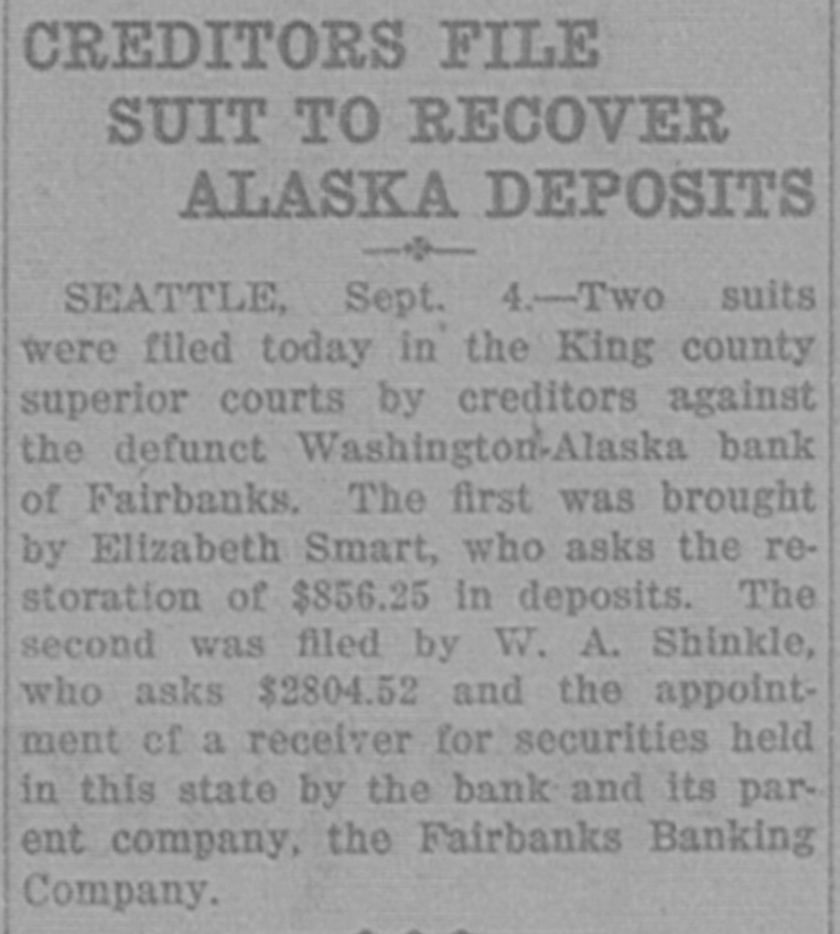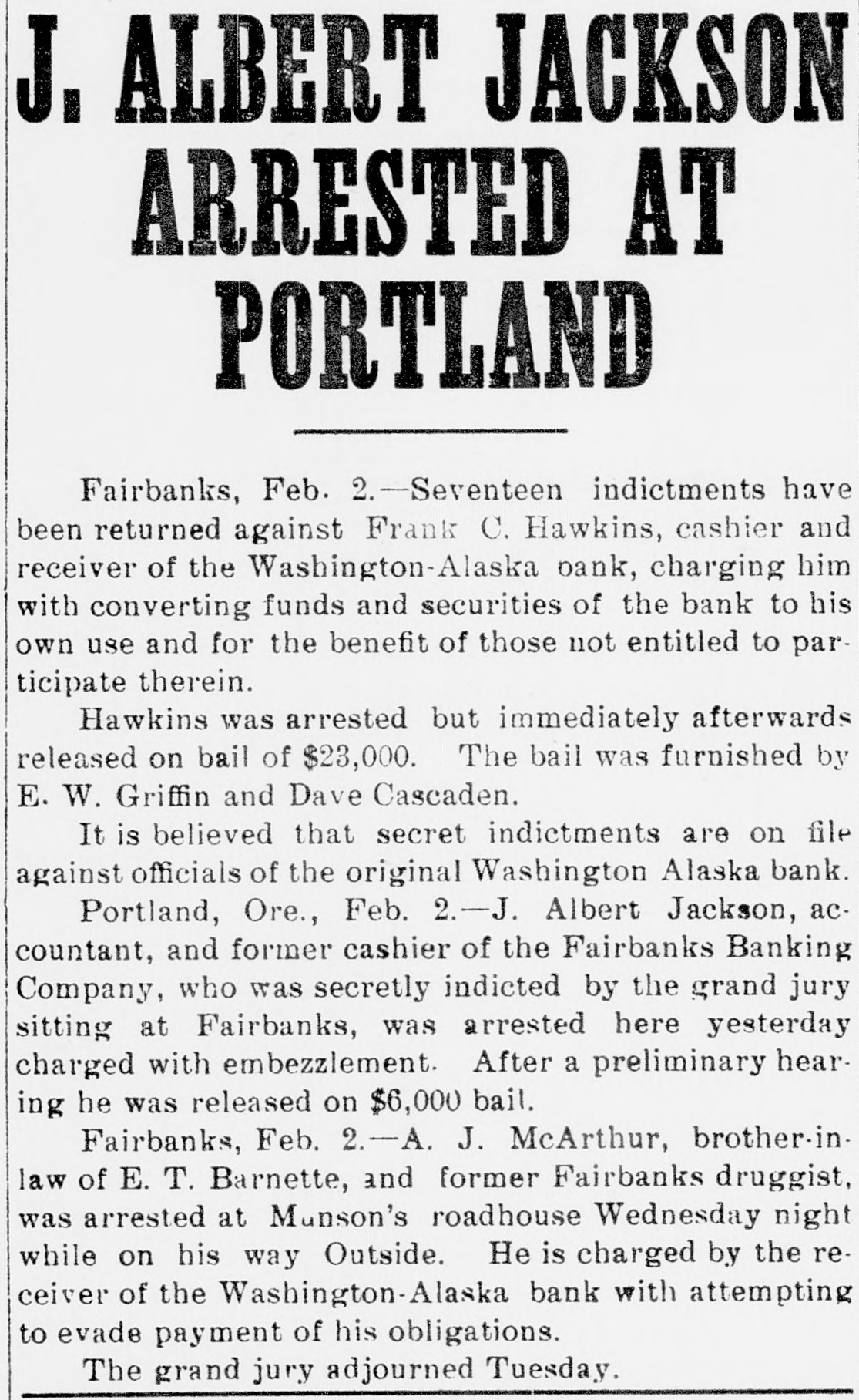 matter of the had been dislength by Dr. preBradley, cussed ington-Alaska at a much resolution bank adopted. was This Aline in effect sented and the bank was January looted charges between 4. 1911. that October by the 1. officers the 1910. reand of the bank: that neglect. and owners grand jury refused affairs: or and cent examine into its a fit pered to C. Hawkins is not should son to act It also removed. that E as receiver and urges the ex be call another grand jury: the abilan abiding faith and and fidelity asks for the court ity presses to of and the in court exdistrict appointment attorney. of an accountant to amine the books. called the meeting Dr. Bradley nominated Miner Bruce to order and Miss Cambridge was asked as chairman to act as secretary the details Dr. Brad of ley then went into of the depositors Barnette the transactions with Captain bank's committee her account of the The matter and gave since the consolidation declared history of the dividend and then the in April was called taken attention up to the withthe five preceddoctor drawals made by Barnette months Bar said. "During the purchase." vstematically she draw ing had been the bank nette his money from time were ing out issued during this $13,000; June Checks May $148, March, $45,000; July, $47,000; August or a 000. $69,000; and September, $32,000. total It was of $345,000. during the the month Washington of Sep tember. 1909, was that bought with Fair the Alaska Lank the depositors of money the of money of it had no banks bank. good for part of its capital in own. a been paid stock its never having to October ac 1. Barnette From February, closed 1910, out his down during count. 1910. having drawn In addition. tw $294,890 which that time valued at $43,000. bank gold brio ks go through the Barnette did not to Mrs. $10. all. were shipped time the sum of or Jesson Since has that been raise! by turned over 000 property and the Circle Barnette This makes by Bar a to Mrs. of $731,000 taken out the am un total two years. And even greater. in making than is nette $4,000 in were for listed no checks less up the moneys drawn to Against were Barnette totals." the there credits Banking out by the old Fairbanks the Gold company stock him Bar Lumber by of $200,000, company continual and credits check$341,000. In of stock ing out and had evidence of of the depositors in this unloading them. con the spiracy to defraud securities to were speaker Referring said committee that the these not so much refused by the of a considera account a of on as through of lack Barnette suspicion was play- Bar nette the hope tion She said of blinding securities ing the for grand time jury end. in for And the he accom- of the plished his the receivers the grand were and accepted and bank tendered indict." ney jury failed to then attacked Robarts Attorfor by default, The Pratt doctor case allowing to go the depositors attachment of the the were were paying a allowed the stating attorney dissatisfied that they all to think action that $500 to go be month through, had even though it might the legal. to the condition it as of her that not bank Referring the speaker another stated cent would is belief ever be paid to the the resolution depositors adoptFollowing by the meeting month of SepWhereas in the Washington-Alastember, corporation ka ed bank, 1909, a the of the organized state of in the laws doing business diFairbanks, the Washington, under city of Alaska, was at its Fourth place that of vision of therein, and upon directors the of the month business officers owners and stock their and transferred said thereof thereof company, stock sold to and a the corporation Fairbanks the organ Bank- state ing laws of Barand to who owned nette ized of Nevada, under and his the associates, the one said E. Fairbanks T. controlled consideration Banking is reported and that company sale of The which to $150,000 be the for $250,000, stock of bonus remaining of said sum the was Washington-Alaska of par value $100,000 of the was bank, Washing- a and for the good and was and his the ton-Alaska one bank W. will H. Parsons their appropri- own ated by associates for said sale, the immediate At the time of company was and more Fairbanks use. Banking the Washington-Alas solthan ka insolvent bank was mining no camp, of center, which vent. The of Fairbanks is Fairbanks a company, of the Banking was town declining. at The that $302,602.14, time, had hand the sum the purchase on said sum, the Washington. of which stock of after payment of the and the sum of the From the Washington said Alaska $52,602.14 bonus, bank of left the but said time the of Bankacquisition bank by the its officers, the Ala_ka company and bank Fairbanks continued corporWashington-Alaska its own its business name, but under under of the E. manage- T. Barate direction and dummies, nette, about the time until October, ment on and his or 1910, associates during -Alaska first which bank day save re- of mained Washington-Alain condition have been incurred by whatever the in losses, a solvent if reason any, may of actual
