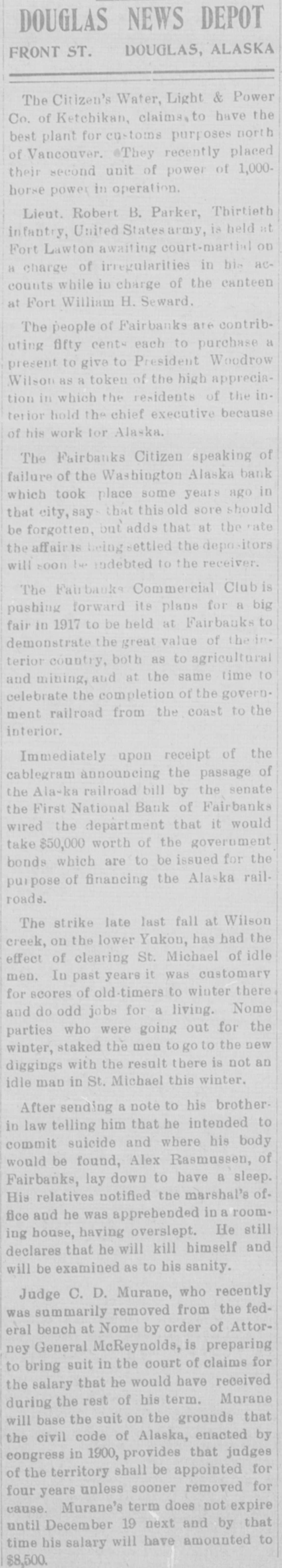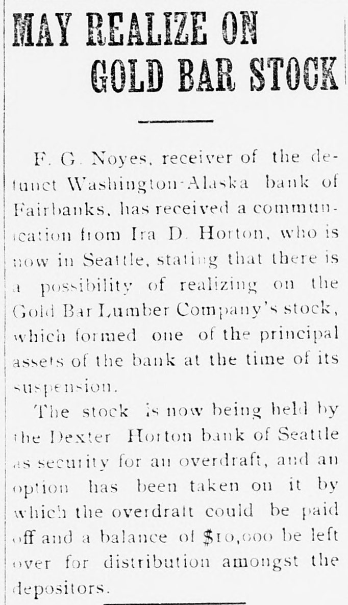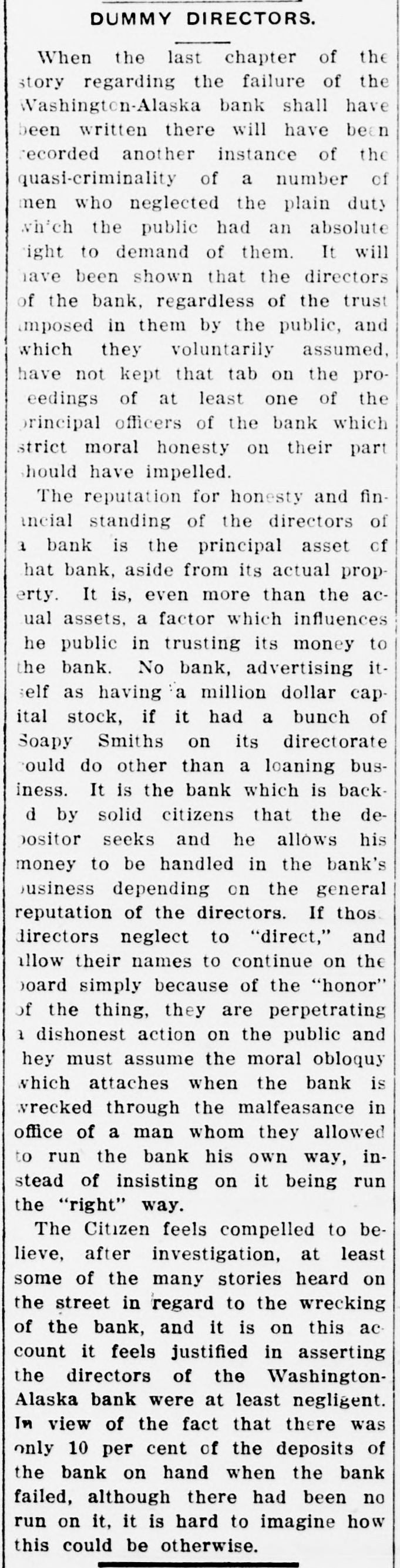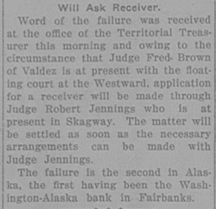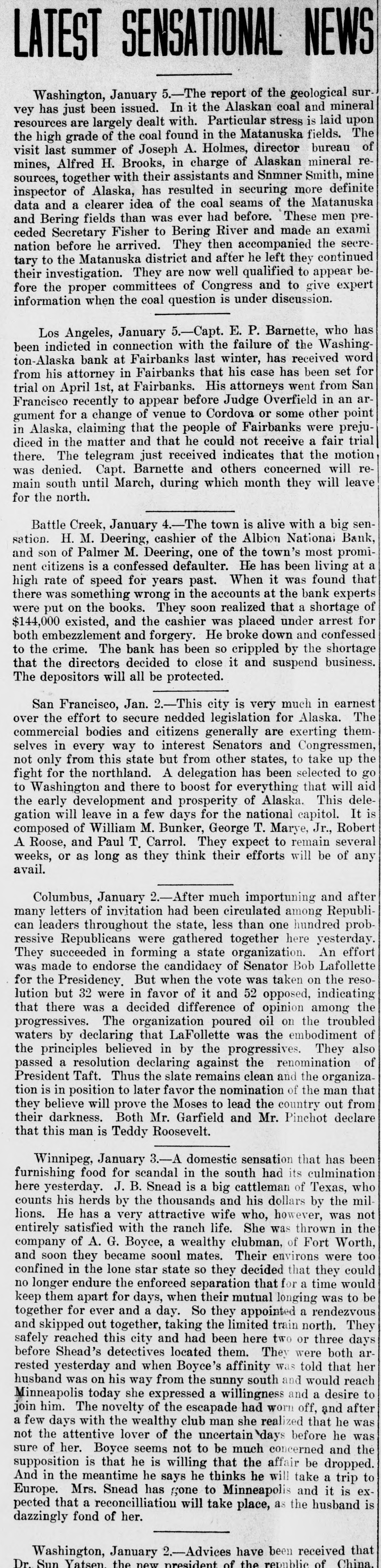 matter of the had been dislength by Dr. preBradley, cussed ington-Alaska at a much resolution bank adopted. was This Aline in effect sented and the bank was January looted charges between 4. 1911. that October by the 1. officers the 1910. reand of the bank: that neglect. and owners grand jury refused affairs: or and cent examine into its a fit pered to C. Hawkins is not should son to act It also removed. that E as receiver and urges the ex be call another grand jury: the abilan abiding faith and and fidelity asks for the court ity presses to of and the in court exdistrict appointment attorney. of an accountant to amine the books. called the meeting Dr. Bradley nominated Miner Bruce to order and Miss Cambridge was asked as chairman to act as secretary the details Dr. Brad of ley then went into of the depositors Barnette the transactions with Captain bank's committee her account of the The matter and gave since the consolidation declared history of the dividend and then the in April was called taken attention up to the withthe five preceddoctor drawals made by Barnette months Bar said. "During the purchase." vstematically she draw ing had been the bank nette his money from time were ing out issued during this $13,000; June Checks May $148, March, $45,000; July, $47,000; August or a 000. $69,000; and September, $32,000. total It was of $345,000. during the the month Washington of Sep tember. 1909, was that bought with Fair the Alaska Lank the depositors of money the of money of it had no banks bank. good for part of its capital in own. a been paid stock its never having to October ac 1. Barnette From February, closed 1910, out his down during count. 1910. having drawn In addition. tw $294,890 which that time valued at $43,000. bank gold brio ks go through the Barnette did not to Mrs. $10. all. were shipped time the sum of or Jesson Since has that been raise! by turned over 000 property and the Circle Barnette This makes by Bar a to Mrs. of $731,000 taken out the am un total two years. And even greater. in making than is nette $4,000 in were for listed no checks less up the moneys drawn to Against were Barnette totals." the there credits Banking out by the old Fairbanks the Gold company stock him Bar Lumber by of $200,000, company continual and credits check$341,000. In of stock ing out and had evidence of of the depositors in this unloading them. con the spiracy to defraud securities to were speaker Referring said committee that the these not so much refused by the of a considera account a of on as through of lack Barnette suspicion was play- Bar nette the hope tion She said of blinding securities ing the for grand time jury end. in for And the he accom- of the plished his the receivers the grand were and accepted and bank tendered indict." ney jury failed to then attacked Robarts Attorfor by default, The Pratt doctor case allowing to go the depositors attachment of the the were were paying a allowed the stating attorney dissatisfied that they all to think action that $500 to go be month through, had even though it might the legal. to the condition it as of her that not bank Referring the speaker another stated cent would is belief ever be paid to the the resolution depositors adoptFollowing by the meeting month of SepWhereas in the Washington-Alastember, corporation ka ed bank, 1909, a the of the organized state of in the laws doing business diFairbanks, the Washington, under city of Alaska, was at its Fourth place that of vision of therein, and upon directors the of the month business officers owners and stock their and transferred said thereof thereof company, stock sold to and a the corporation Fairbanks the organ Bank- state ing laws of Barand to who owned nette ized of Nevada, under and his the associates, the one said E. Fairbanks T. controlled consideration Banking is reported and that company sale of The which to $150,000 be the for $250,000, stock of bonus remaining of said sum the was Washington-Alaska of par value $100,000 of the was bank, Washing- a and for the good and was and his the ton-Alaska one bank W. will H. Parsons their appropri- own ated by associates for said sale, the immediate At the time of company was and more Fairbanks use. Banking the Washington-Alas solthan ka insolvent bank was mining no camp, of center, which vent. The of Fairbanks is Fairbanks a company, of the Banking was town declining. at The that $302,602.14, time, had hand the sum the purchase on said sum, the Washington. of which stock of after payment of the and the sum of the From the Washington said Alaska $52,602.14 bonus, bank of left the but said time the of Bankacquisition bank by the its officers, the Ala_ka company and bank Fairbanks continued corporWashington-Alaska its own its business name, but under under of the E. manage- T. Barate direction and dummies, nette, about the time until October, ment on and his or 1910, associates during -Alaska first which bank day save re- of mained Washington-Alain condition have been incurred by whatever the in losses, a solvent if reason any, may of actual