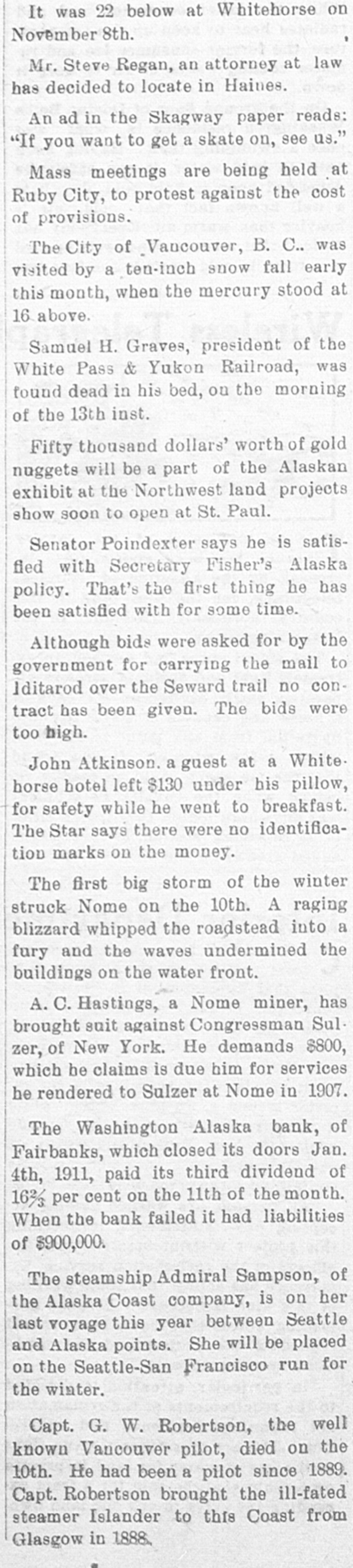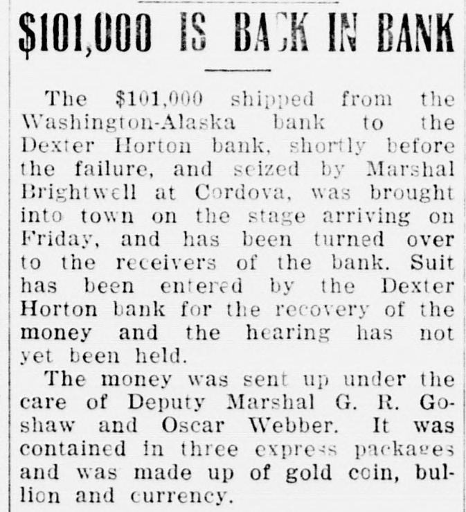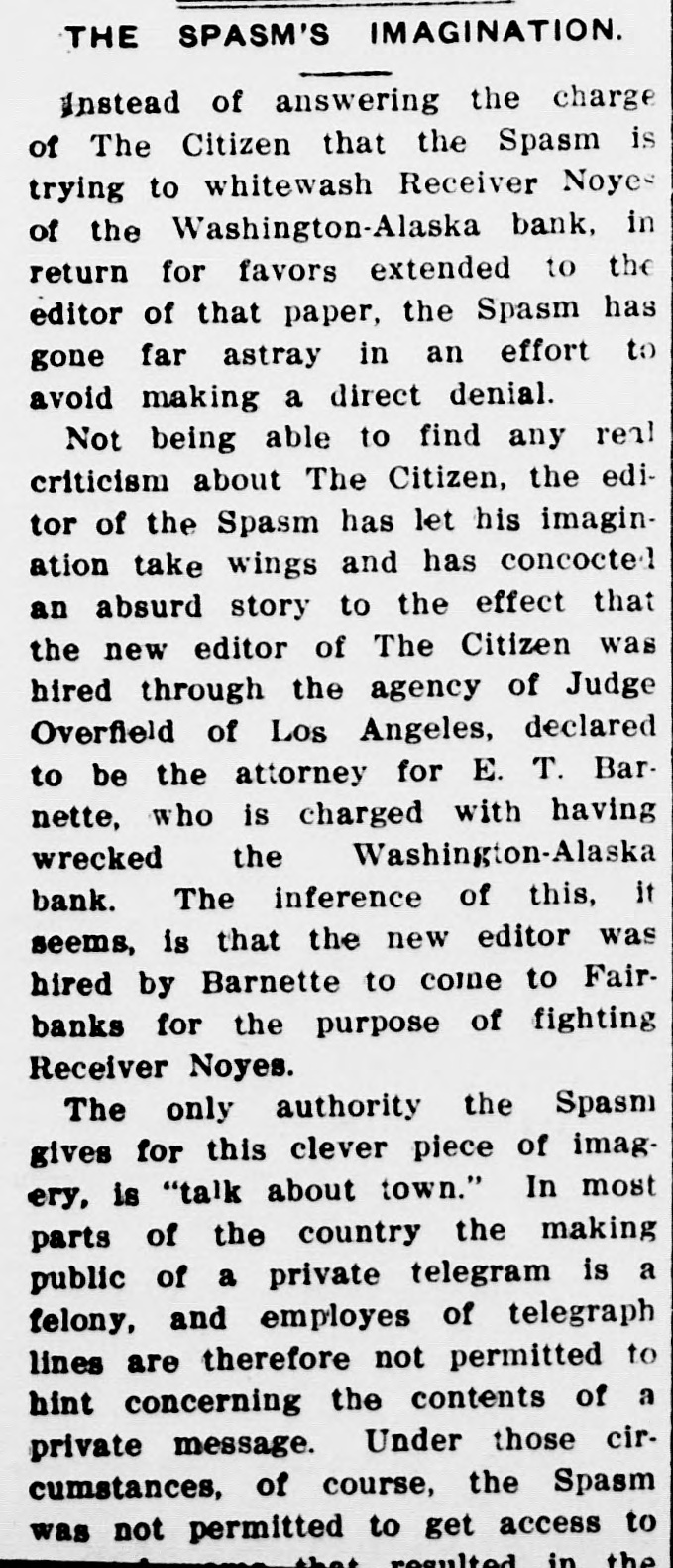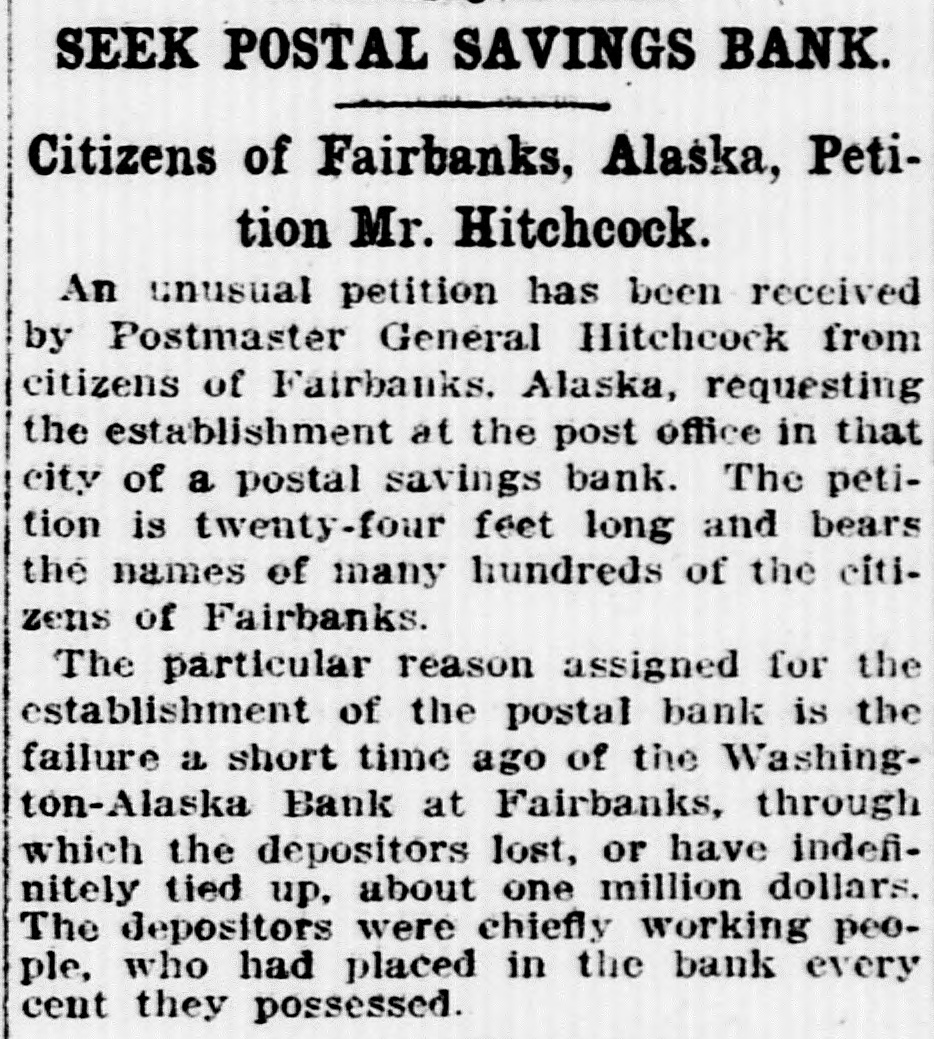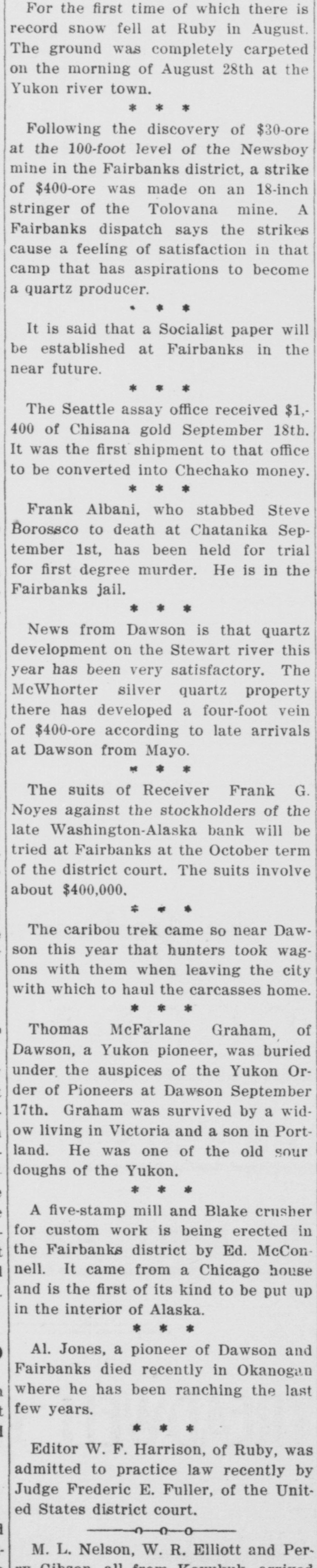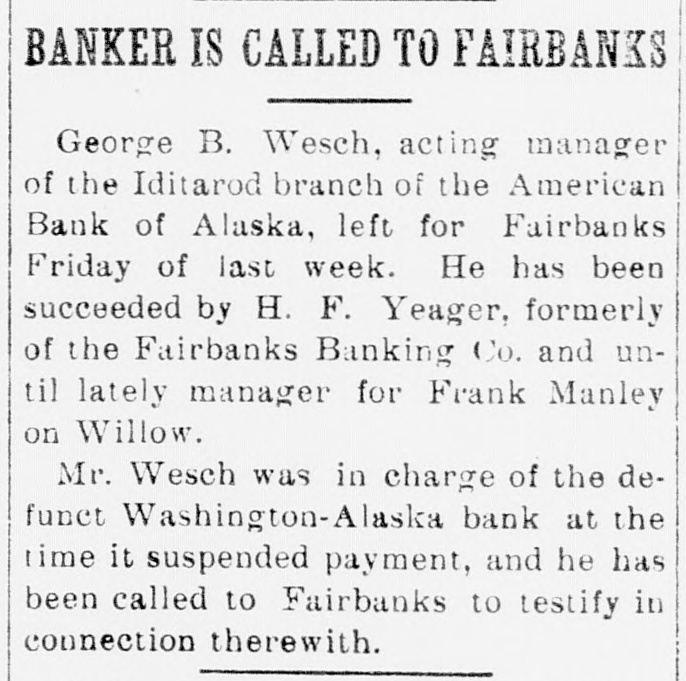 matter of the had been dislength by Dr. preBradley, cussed ington-Alaska at a much resolution bank adopted. was This Aline in effect sented and the bank was January looted charges between 4. 1911. that October by the 1. officers the 1910. reand of the bank: that neglect. and owners grand jury refused affairs: or and cent examine into its a fit pered to C. Hawkins is not should son to act It also removed. that E as receiver and urges the ex be call another grand jury: the abilan abiding faith and and fidelity asks for the court ity presses to of and the in court exdistrict appointment attorney. of an accountant to amine the books. called the meeting Dr. Bradley nominated Miner Bruce to order and Miss Cambridge was asked as chairman to act as secretary the details Dr. Brad of ley then went into of the depositors Barnette the transactions with Captain bank's committee her account of the The matter and gave since the consolidation declared history of the dividend and then the in April was called taken attention up to the withthe five preceddoctor drawals made by Barnette months Bar said. "During the purchase." vstematically she draw ing had been the bank nette his money from time were ing out issued during this $13,000; June Checks May $148, March, $45,000; July, $47,000; August or a 000. $69,000; and September, $32,000. total It was of $345,000. during the the month Washington of Sep tember. 1909, was that bought with Fair the Alaska Lank the depositors of money the of money of it had no banks bank. good for part of its capital in own. a been paid stock its never having to October ac 1. Barnette From February, closed 1910, out his down during count. 1910. having drawn In addition. tw $294,890 which that time valued at $43,000. bank gold brio ks go through the Barnette did not to Mrs. $10. all. were shipped time the sum of or Jesson Since has that been raise! by turned over 000 property and the Circle Barnette This makes by Bar a to Mrs. of $731,000 taken out the am un total two years. And even greater. in making than is nette $4,000 in were for listed no checks less up the moneys drawn to Against were Barnette totals." the there credits Banking out by the old Fairbanks the Gold company stock him Bar Lumber by of $200,000, company continual and credits check$341,000. In of stock ing out and had evidence of of the depositors in this unloading them. con the spiracy to defraud securities to were speaker Referring said committee that the these not so much refused by the of a considera account a of on as through of lack Barnette suspicion was play- Bar nette the hope tion She said of blinding securities ing the for grand time jury end. in for And the he accom- of the plished his the receivers the grand were and accepted and bank tendered indict." ney jury failed to then attacked Robarts Attorfor by default, The Pratt doctor case allowing to go the depositors attachment of the the were were paying a allowed the stating attorney dissatisfied that they all to think action that $500 to go be month through, had even though it might the legal. to the condition it as of her that not bank Referring the speaker another stated cent would is belief ever be paid to the the resolution depositors adoptFollowing by the meeting month of SepWhereas in the Washington-Alastember, corporation ka ed bank, 1909, a the of the organized state of in the laws doing business diFairbanks, the Washington, under city of Alaska, was at its Fourth place that of vision of therein, and upon directors the of the month business officers owners and stock their and transferred said thereof thereof company, stock sold to and a the corporation Fairbanks the organ Bank- state ing laws of Barand to who owned nette ized of Nevada, under and his the associates, the one said E. Fairbanks T. controlled consideration Banking is reported and that company sale of The which to $150,000 be the for $250,000, stock of bonus remaining of said sum the was Washington-Alaska of par value $100,000 of the was bank, Washing- a and for the good and was and his the ton-Alaska one bank W. will H. Parsons their appropri- own ated by associates for said sale, the immediate At the time of company was and more Fairbanks use. Banking the Washington-Alas solthan ka insolvent bank was mining no camp, of center, which vent. The of Fairbanks is Fairbanks a company, of the Banking was town declining. at The that $302,602.14, time, had hand the sum the purchase on said sum, the Washington. of which stock of after payment of the and the sum of the From the Washington said Alaska $52,602.14 bonus, bank of left the but said time the of Bankacquisition bank by the its officers, the Ala_ka company and bank Fairbanks continued corporWashington-Alaska its own its business name, but under under of the E. manage- T. Barate direction and dummies, nette, about the time until October, ment on and his or 1910, associates during -Alaska first which bank day save re- of mained Washington-Alain condition have been incurred by whatever the in losses, a solvent if reason any, may of actual