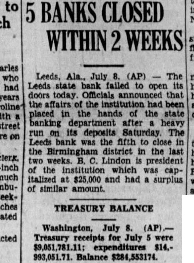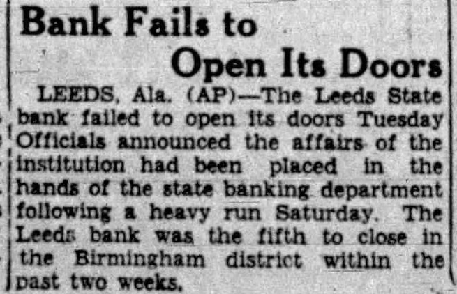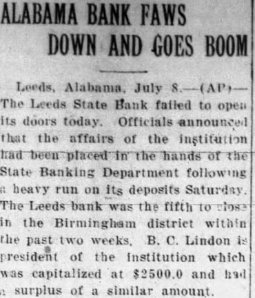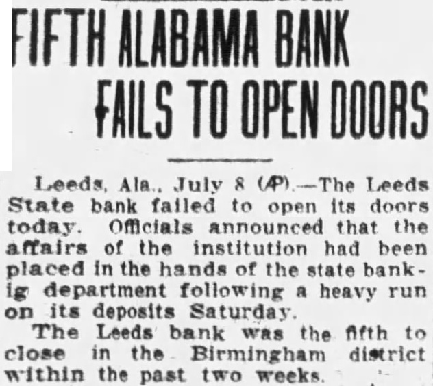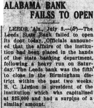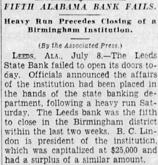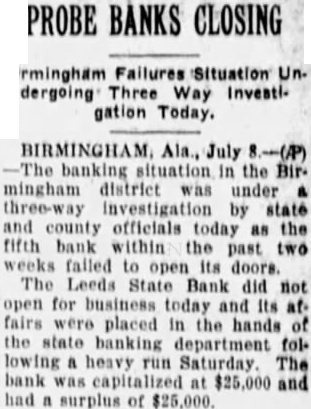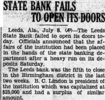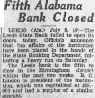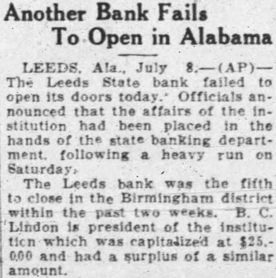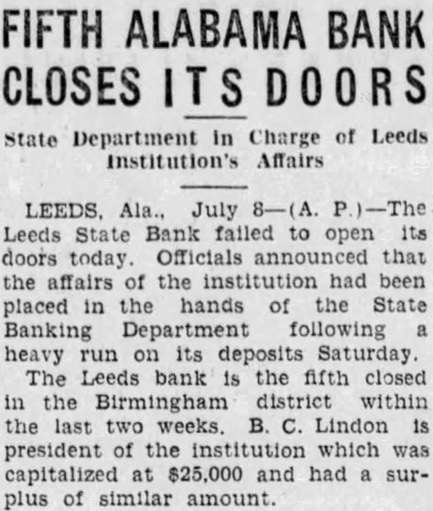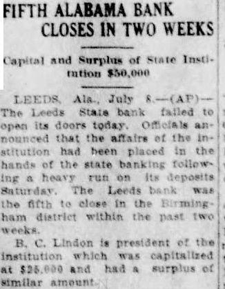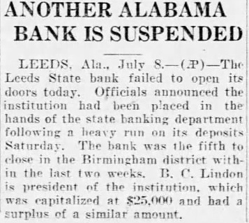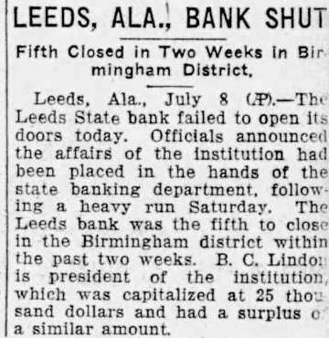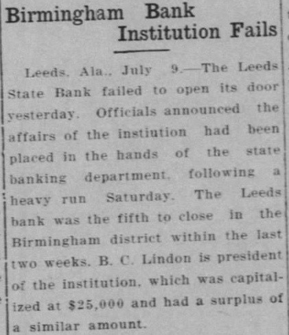 July The Leeds State Bank failed to its doors today. Officials announced that the affairs of the institution State Banking Department following heavy run on its deposits Saturday The Leeds bank was the fifth in the Birmingham district within the past two weeks. B. Lindon president of the institution which capitalized at $2500.0 and had surplus of similar amount.