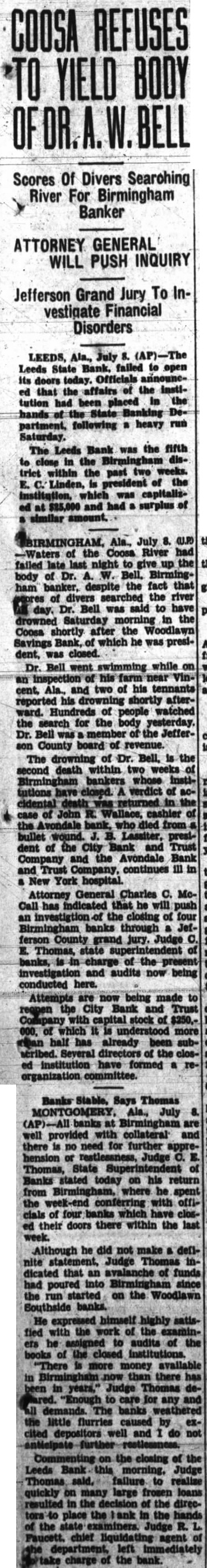 -Waters of the Coosa River had failed last night to give up the of Dr. A. Bell. Birmingbody ham banker, despite the fact that of divers the river day. Dr. Bell was said to have drowned Saturday in the Coosa shortly after the Woodlawn Savings Bank, of which he was president, was closed. Dr. Bell went swimming while on an of his farm near Vincent. Ala., and two of his tennants reported his drowning shortly afterward. Hundreds of people watched the search for the body yesterday. Dr. Bell was member of the Jefferson County board of revenue. The drowning of Dr. Bell, is the second death within two weeks of Birmingham bankers whose institutions have closed. A verdict of accidental returned in the case of John R. Wallace, cashier of the Avondale bank. who died from bullet wound. Lassiter, president of the City Bank and Trust Company and the Avondale and Trust Company, continues ill in New York hospital. Attorney General Charles C. McCall has indicated that he will an investigtion of the closing of four Birmingham banks through Jefferson County grand jury. Judge C E. Thomas, state of banks, is in charge of the present investigation and audits now being conducted here. Attempts are now being made to the City Bank and Trust Company with stock of $250,000, of which it is more half has already been subscribed. Several directors of the closed institution have formed organization committee.