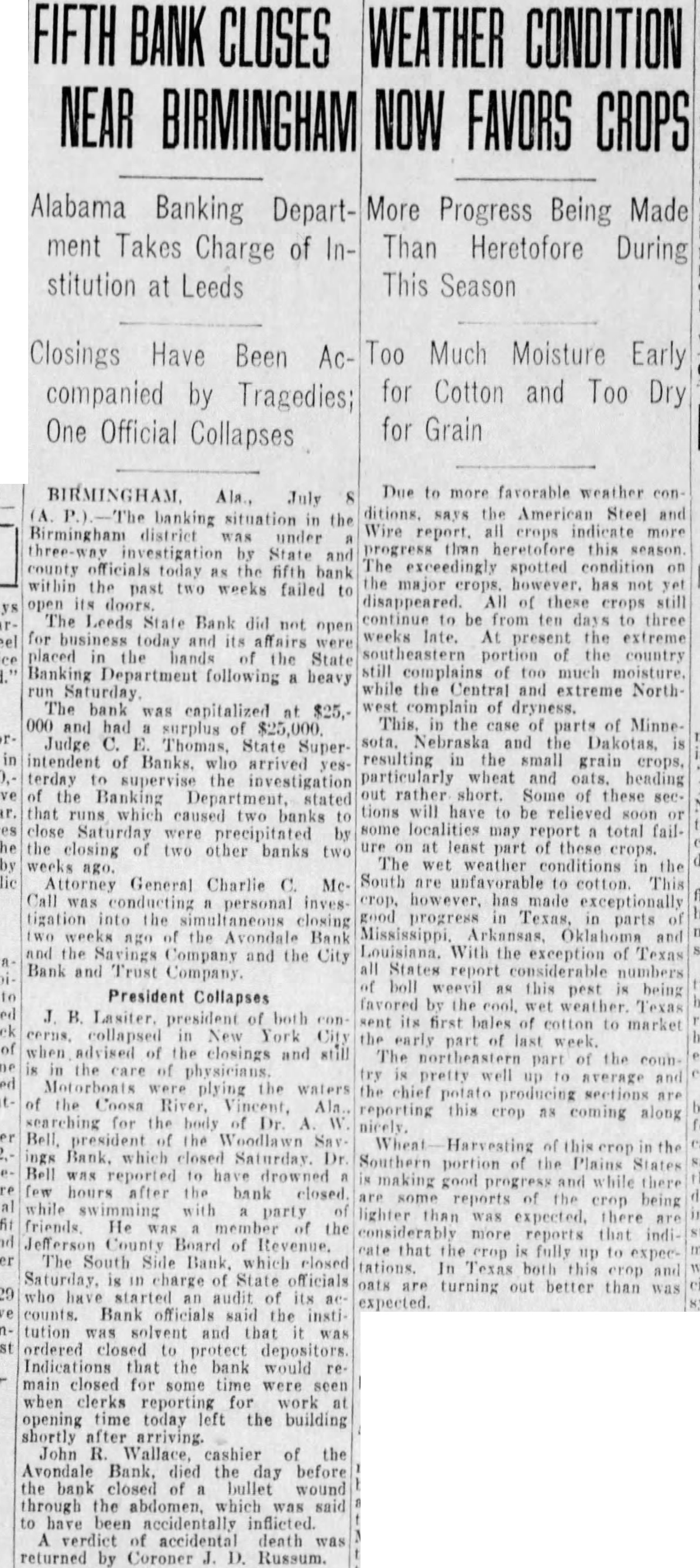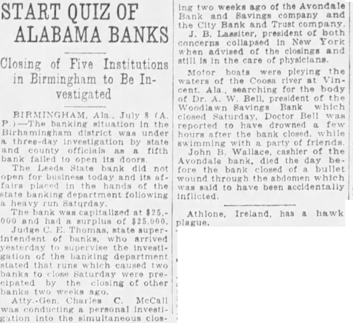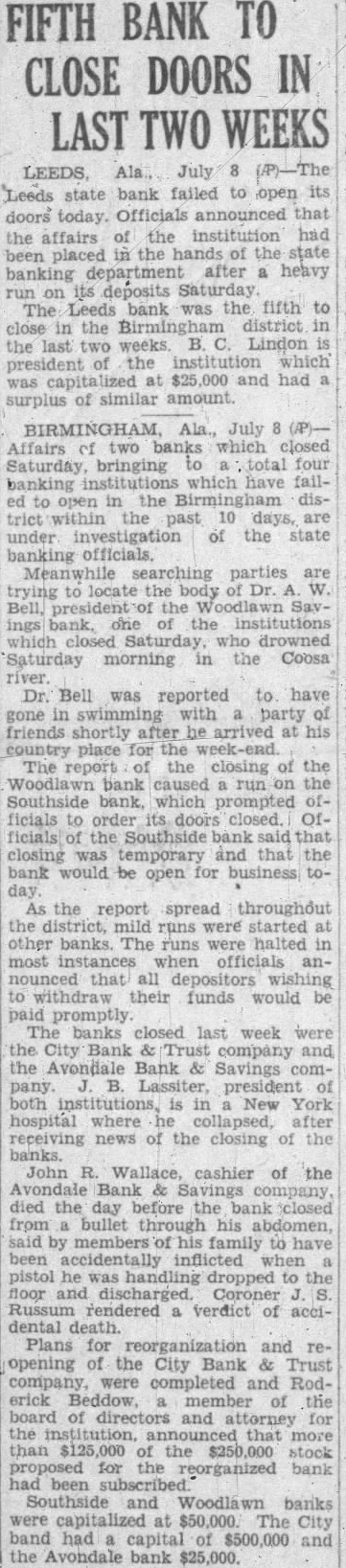 Ala., July Affairs two banks which closed Saturday, bringing four banking which in the disthe past 10 under of the state banking parties are the the institutions which who drowned morning in the Coosa Dr. Bell was reported to have swimming with friends shortly after be arrived place for the The report the closing the bank caused the bank. which prompted ficials order doors closed. Officials the Southside closing temporary and the would be open for business day As the report spread throughout the runs were started banks. The most instances when officials anthat all to their funds would promptly The banks closed last week were the City Bank company the Avondale Bank Savings pany. Lassiter, president both New York hospital where after receiving news of the closing the banks. John Wallace, cashier of the Avondale Bank Savings died the day before the bank closed bullet through his abdomen, members his family to have been inflicted when the floor and Coroner Russum rendered verdict of accidental death. Plans for reorganization and opening the City Bank completed and Roderick member the board and attorney the that than $125,000 of the $250,000 stock proposed for the reorganized bank been Southside and Woodlawn banks were at The band had capital $500,000 the Avondale bank $25,000.