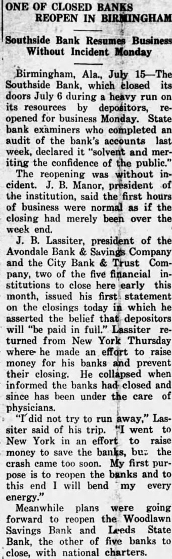 Birmingham, Ala., July Southside Bank, which closed its doors during heavy run on its by depositors, opened for business Monday. State bank who completed an audit of the bank's accounts last week, declared "solvent iting the confidence of the public." The reopening was without cident. Manor, president of the institution, said the hours of business were normal as the closing had merely been over the week end. Lassiter, president of the Avondale Bank Savings Company and the City Bank Trust Company, two the five financial institutions to close here early this month, issued his statement on the closings today which he asserted the belief depositors will paid in Lassiter turned from New York Thursday he made an effort to raise money for his banks and prevent their closing. He collapsed when informed the banks and since has been under the care of physicians. not try to run Lassiter said of his trip. went New York in an effort to raise to save the banks, but the money crash came too soon. My first purto the banks and to pose reopen this end will bend my every energy." Meanwhile plans were going forward to the Woodlawn reopen Savings Bank and Leeds State Bank, the other of five banks to close, with national charters.