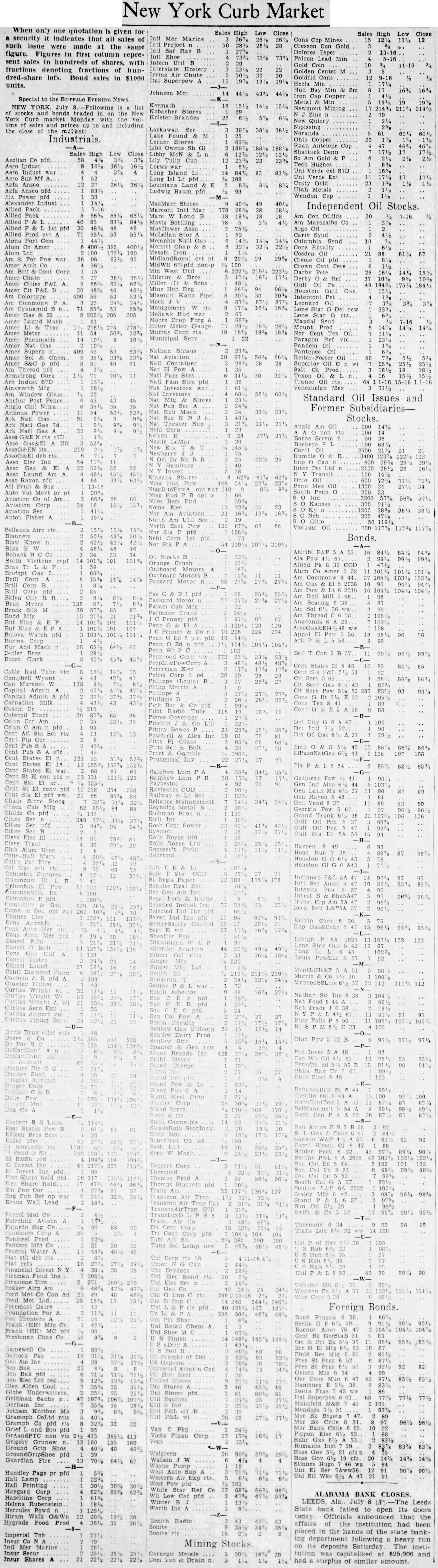 Sales High Low Close Sales High Low Close Intl Mer Marine Cons Cop Mines 11% 28 Cresson Con Gold Saf Raz B Dolores Esper 13-16 Shoe 73% 73% Falcon Lead Min 5-16 Intern Util 20 Coin 11-16 Interstate Hosiery Golden Center M Chute Goldfid Cons 9-16 Ital Superpow 19% 19% Hecla Min Hud Bay Min Sm 16% 16% Johnson Mot 43% Cap Copper Special to the BUFFALO EVENING NEWS. Metal NEW Kermath July Mining 214% Kobacher Stores traded New York Curb market Monday with the prices to and including Nipissing the close Lackawan 39% Noranda Lake Found Ohio Copper Cop Sh 189% Shattuck Denn Sales High Low Close Libby Gold 2½ Lily Tulip Cup 23% 16% Hughes Indust Loews war Island 83 83% Verde Ext pfd Ansco Unity Gold Agfa Ansco pfd Metals Ludwig Baum pfd 93 Power Wendon Cop Alexander Indust MacMarr Stores Independent Oil Stocks. Marconi Intl Lond Con Oilflds Bottling pfd Mayflower Assn Synd Alpha Port Columbia Amer Chap Mesabi Iron Cosden For Pow war 95 MidlandRoyal 29 29% Oil Cent Am Corp Mid West Util Pete Chain Amer P&L A Oil Hon Reg Houston Am Colortype Missouri Kans Intercont Pet Leonard Montgomery 16% Star Lone new Amer Gas 205 205 Mohawk Hud Moore Drop Amer Laund Mach Magdal Trac Mount Prod Amer Meter Murray 18% Nor Oil Cent Amer Pneumatic Serv Paragon Ref vte Nat Gas Pandem Superp Nathan Pantepec Amer Chem Nat Aviation Oil S&C Am pfd Armstrong Cork Fam Fam Ainsworth Mfg Investors Venezuelan Am Window Glass Standard Oil Issues and Post Fence Anglo Chil Nitra Former Subsidiaries Arizona Stocks. Natl Gas Theater Anglo Am Oil 14% Gas G&E Asso Gas&El UR Nestle LeMar Buckeye AssoG&El Humble 25 Asso Elec Hamburg Gas n Laund Transit Asso Rayon pfd Hud Oil Vot Penn Aviation Pnd Aviation Kansas Aviation Neb Axton Fisher Util 700 Bellanca Airc Blauners 49% Bonds. Nor Sta Bliss P&P Stocks Borin 101 101% Allied Pk COD Braz Outboard Motors Alum Amer Bridgpt Gas Motors 14% 14% Packard 27% Gas Corp Brist Myers Seating Parmelee Niag Anaconda 6 Bulova Mach Clark Elec Cable Rad Campbell 26% Marconi 93 Carnation Milk Caterpil Am Bowes States Prudential States Lum Rainbow COD Metal pfd 106 Cent Rub Indianap L&P5A Corp RelianceBr& B&Sh Prod Share Hold Starrett Pow Eng Wall TransLuxD Fajardo Fedders Lamp Federal Water Financial Invest Fireman Ins Firestone Airp Can Mot Foremost Foreign Bonds. Shar Frank Retail Frank Shoe Chas Co 9% Gamewell Co Pkg Res Inv Prus 14% Elec Cons Mun Alden Coal Stores Globe Underwriters Stores Goldman Sachs Ital Gorham Inc Mendoza Gotham Knitbac Gramoph CoLtd Gramph Co Bank Chile Bro Van GrAandPTC non Finan Corp Rumania 83% 83% Ground Grip Shoe Walgreen pfd Guardian Fire Wayne Hugo Handley Page pr pfd Hall Lamp Western Pow Hall Printing Haygard Corp 62% Low Caf Hazeltine Corp Winter Helena Rubenstein Powd Worth Hiram G&Wn Hygrade Food Prod Imperial Tob Zonite Mining Stocks Intl Mer Marine Insur Insur Shares 21