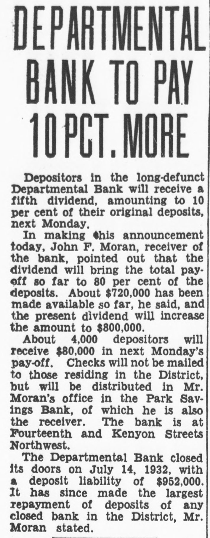 CITC rights were exercised, although that does not mean that holders of the common stock elected to purchase 45 per cent of the 24,400 shares. Washington Gas preferred is now quoted on the Washington Stock Exchange, ex-dividend, at 104 bid and 105 asked. The last sale was at $107 a share and it sold earlier this year at $109. Application will be made shortly for listing the 24.600 new shares on the Washington exchange. There are 35,600 shares already listed, which will make a total of 60,000 shares. According to plans of the Washington Gas Light Co., of which Marcy L. Sperry is president, the $2.513.000 proceeds of the stock sale will be used for payment of bank loans and for expansion and equipment. The company has paid dividends on the preferred stock regularly since the first shares were issued in 1937 and dividends on the common stock at same rate since 1886, the present rate being $1.50 per annum. Net income in 1939 amounted to $1,231,797. in 1938 to $1,005,983 and in 1937 $760,207. Moran to Sell Bank Assets. John F. Moran. receiver of the Departmental Bank, has been authorized to advertise the remaining assets of the bank for sale, the sale to take place in the receiver's office, 222 Riggs National Bank Building, Fourteenth and Park road N.W., at 8 p.m. Friday, May 17, it was announced today. The Departmental Bank closed on July 14, 1932: liabilities were approximately $1,000.000, and assets were $1,200,000, which included a stockholders' liability of $106,000. The liquidation has resulted in six dividends being paid to date by the receiver amounting to 85 per cent. Dividends and secured and preferred liabilities paid were approximately $800,000. It is expected at the termination OI the bank's affairs that a seventh and final dividend will be paid. For many years the Departmental Bank was located in the 1700 block on Pennsylvania avenue, and did a thriving business loaning money largely to Government employes. The turn in its affairs came after the 1929 crash in Wall Street. Sacks Heads Loan Group. Eckert J. Sacks, who helped organize the Washington Permanent Building Association 59 years ago and was one of the original directors, was re-elected president at the annual meeting held yesterday. John Henderson was renamed vice president, Carl J. Bergmann, treasurer. and H. H Bergmann, secretary C. Chester Caywood continues as general counsel. while directors reappointed include John H. Clipper, C. Rammling, James R. Ellis, Clyde H. Miller, Max Walten, Joseph N. Saunders and Walter B. Avery. Washington Permanent was the first association in the city to become a member of the Federal Home Loan Bank. It is also a member of the District of Columbia Building and Loan League, United States Savings and Loan League and the American Savings, Building and Loan Institute. Shareholders were informed that assets now total $10,250,000, the highest figure on record. Financial District Comment. Washington bankers attending the annual convention of the Association of Reserve City Bankers at Hot Springs, Va., were back at their desks today.