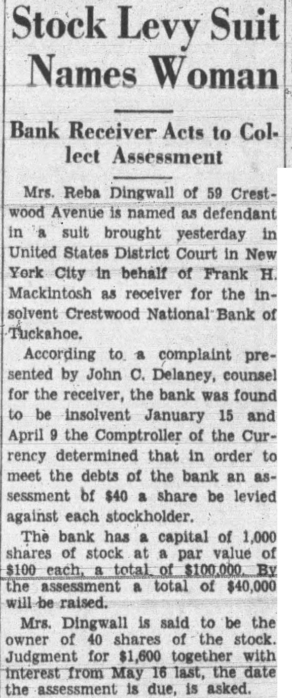Stock Levy Suit Names Woman Bank Receiver Acts to Collect Assessment Mrs. Reba Dingwall of 59 Crestwood Avenue is named as defendant in a suit brought yesterday in United States District Court in New York City in behalf of Frank H. Mackintosh as receiver for the insolvent Crestwood National Bank of Tuckahoe. According to a complaint presented by John C. Delaney, counsel for the receiver, the bank was found to be insolvent January 15 and April 9 the Comptroller of the Currency determined that in order to meet the debts of the bank an assessment bf $40 a share be levied against each stockholder. The bank has a capital of 1,000 shares of stock at a par value of $100 each, total of $100,000. By the assessment a total of $40,000 will be raised. Mrs. Dingwall is said to be the owner of 40 shares the stock. Judgment for $1,600 together with interest from May 16 last, the date the assessment is due, is asked.