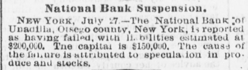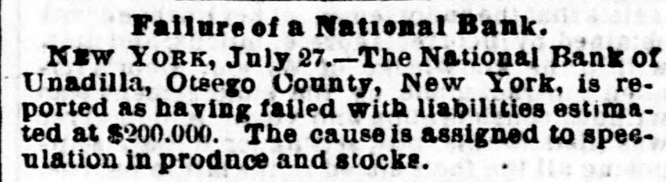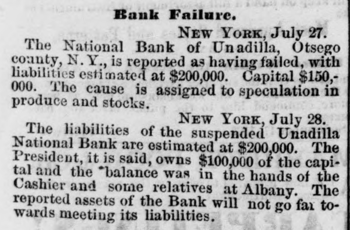 Bank Failure. NEW YORK, July 27. The National Bank of Unadilla, Otsego county, N. Y., is reported as having failed, with liabilities estimated at $200,000. Capital $150,000. The cause is assigned to speculation in produce and stocks. NEW YORK, July 28. The liabilities of the suspended Unadilla National Bank are estimated at $200,000. The President, it is said, owns $100,000 of the capital and the *balance was in the hands of the Cashier and some relatives at Albany. The reported assets of the Bank will not go far towards meeting its liabilities.