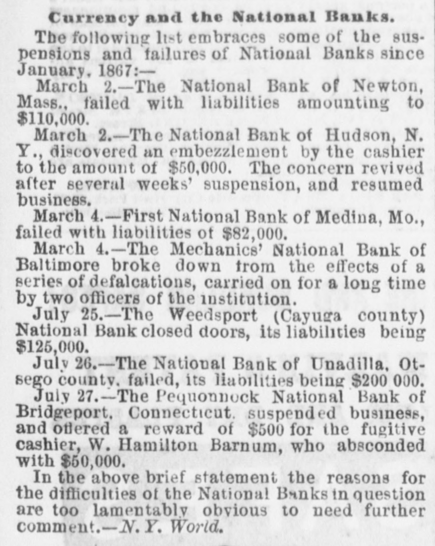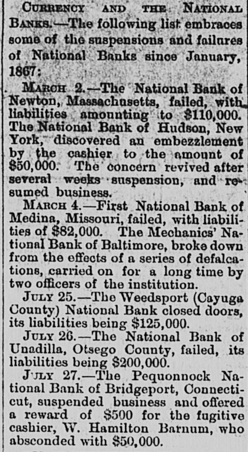 Currency and the National Banks. The following list embraces some of the suspensions and failures of National Banks since January, 1867:March 2.-The National Bank of Newton, Mass., failed with liabilities amounting to $110,000. March 2.-The National Bank of Hudson, N. Y., discovered an embezzlement by the cashier to the amount of $50,000. The concern revived after several weeks' suspension, and resumed business. March 4.-First National Bank of Medina, Mo., failed with liabilities of $82,000. March 4.-The Mechanics' National Bank of Baltimore broke down from the effects of a series of defalcations, carried on for a long time by two officers of the institution. July 25.-The Weedsport (Cayuga county) National Bank closed doors, its liabilities being $125,000. July 26.-The National Bank of Unadilla, Otsego county. failed, its liabilities being $200 000. July -The Pequonnock National Bank of Bridgeport, Connecticut. suspended business, and offered a reward of $500 for the fugitive cashier, W. Hamilton Barnum, who absconded with $50,000. In the above brief statement the reasons for the difficulties of the National Banks in question are too lamentably obvious to need further comment.-N. Y. World.