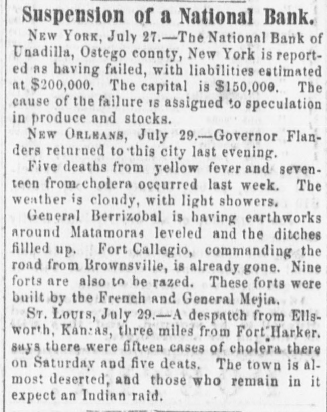 Suspension of a National Bank. NEW YORK, July 27.-The National Bank of Unadilla, Ostego county, New York is reported A8 having failed, with liabilities estimated at $200,000. The capital is $150,000. The cause of the failure 18 assigned to speculation in produce and stocks. NEW ORLEANS, July 9.-Governor Flanders returned to this city last evening. Five deaths from yellow fever and seventeen from cholera occurred last week. The weather is clondy, with light showers. General Berrizobal is having earthworks around Matamoras leveled and the ditches filled up. Fort Callegio, commanding the road from Brownsville, is already gone. Nine forts are also in be razed. These forts were built by the French and General Mejia. ST. Lours, July 29.-A despatch from Ellsworth, Kansas, three miles from Fort Harker. says there were fifteen cases of cholera there on Saturday and five deats. The town is almost deserted, and those who remain in it expect an Indian raid.