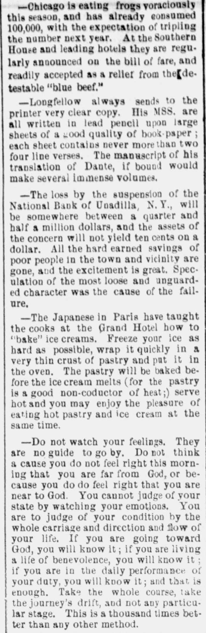-Chicago is eating frogs voraciously this season, and has already consumed 100,000, with the expectation of tripling the number next year. At the Southern House and leading hotels they are regularly announced on the bill of fare, and readily accepted as a relief from the detestable "blue beef." -Longfellow always sends to the printer very clear copy. His MSS. are all written in lead pencil upon large sheets of a good quality of book-paper each sheet contains never more than two four line verses. The manuscript of his translation of Dante, if bound would make several immense volumes. -The loss by the suspension of the National Bank of Unadilla, N. Y., will be somewhere between a quarter and half a million dollars, and the assets of the concern will not yield ten cents on a dollar. All the hard earned savings of poor people in the town and vicinity are gone, and the excitement is great. Speculation of the most loose and unguarded character was the cause of the failure. -The Japanese in Paris have taught the cooks at the Grand Hotel how to "bake" ice creams. Freeze your ice as hard as possible, wrap it quickly in a very thin crust of pastry and put it in the oven. The pastry will be baked before the ice cream melts (for the pastry is a good non-coductor of heat;) serve hot and you may enjoy the pleasure of eating hot pastry and ice cream at the same time. -Do not watch your feelings. They are no guide to go by. Do not think a cause you do not feel right this morning that you are far from God, or because you do do feel right that you are near to God. You cannot judge of your state by watching your emotions. You are to judge of your condition by the whole carriage and direction and flow of your life. If you are going toward God, you will know it; if you are living a life of benevolence, you will know it; if you are in the daily performance of your duty, you will know it; and that is enough. Take the whole course, take the journey's drift, and not any particular stage. This is a thousand times better than any other method.