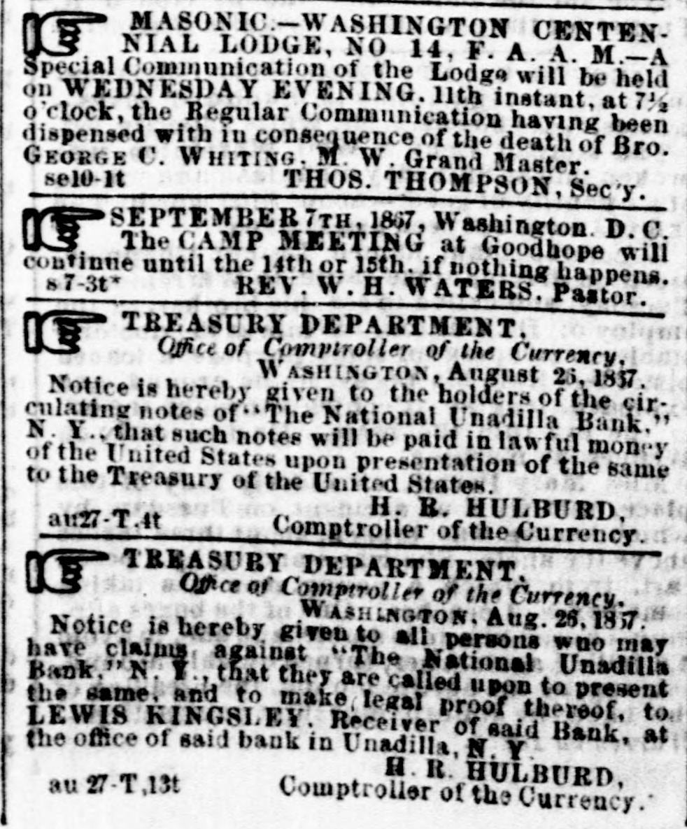 MASONIC-WASHINGTON CENTENIC NIAL LODGE, NO 14, F. A. A. M.-A Special Communication of the Lodge will be held on WEDNESDAY EVENING. 11th instant, at 71/2 clock, the Regular Communication having been dispensed with in consequence of the death of Bro. GEORGE C. WHITING. M. W. Grand Master. se10-1t THOS. THOMPSON, Sec'y. SEPTEMBER 7TH, 1867, Washington D.C. IC The CAMP MEETING at Goodhope will continue until the 14th or 15th. if nothing happens. s7-3t* REV. W. H. WATERS. Pastor. TREASURY DEPARTMENT. IC Office of Compivoller of the Currency, WASHINGTON, August 26, 1837. Notice is hereby given to the holders of the cir culating notes of The National Unadilla Bank." N Y. that such notes will be paid in lawful money of the United States upon presentation of the same to the Treasury of the United States. H. R. HULBURD, au27-T.It Comptroller of the Currency. TREASURY DEPARTMENT. Office of Comptroller of the Currency. WASHINGTON. Aug. 26, 185. Notice is hereby given to all persons who may have claims against The National Unadilla Bank,"N Y. that they are called upon to present the same. and to make legal proof thereof, to LEWIS KINGSLEY. Receiver of said Bank, at the office of said bank in Unadilla, N. Y H. R. HULBURD, au 27 7.13t Comptroller of the Currency.