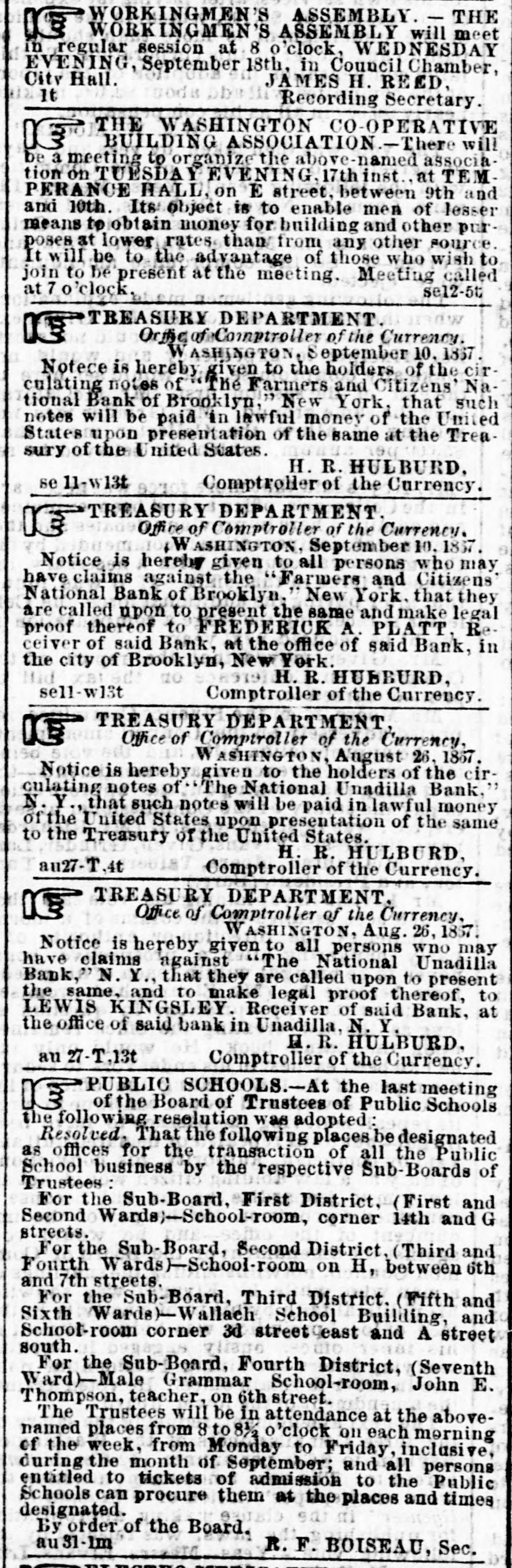 WORKINGMEN'S ASSEMBLY. - THE WORKINGMEN'S ASSEMBLY will meet in regular session at 8 o'clock, WEDNESDAY EVENING, September 18th, in Council Chamber, City Hall. JAMES H. REED, It Recording Secretary. THE WASHINGTON CO-OPERATIVE BUILDING ASSOCIATION.-There will F be a meeting to organize the above-named association on TUESDAY EVENING. 17thinst.. at TEMPERANCE HALL on E street, between 9th and and 10th. Its object is to enable men of lesser means to obtain money for building and other purposes at lower rates than from any other source. It will be to the advantage of those who wish to join to be present at the meeting. Meeting called at 7 o'clock. sel2-5t TREASURY DEPARTMENT. Orfice of Comptroller of the Currency. W ASHINGTON, eptember 10. 1867. Notece is hereby given to the holders of the circulating notes of The Farmers and Citizens' National Bank of Brooklyn," New York, that such notes will be paid in lawful money of the United States upon presentation of the same at the Treasury of the United States. H. R. HULBURD, se 11-w13t Comptroller of the Currency. TREASURY DEPARTMENT. Office of Comptroller of the Currency. WASHINGTON, September 10. 1857. Notice is hereby given to all persons who may have claims against the "Farmers and Citizens National Bank of Brooklyn. New York. that they are called upon to present the same and make legal proof thereof to FREDERICK A. PLATT. R ceiver of said Bank, at the office of said Bank, in the city of Brooklyn, New York. H. R. HUBBURD, sell-w13t Comptroller of the Currency. TREASURY DEPARTMENT. LE Office of Comptroller of the Currency, WASHINGTON, August 26, 1867. Notice is hereby given to the holders of the circulating notes of The National Unadilla Bank, N.Y., that such notes will be paid in lawful money of the United States upon presentation of the same to the Treasury of the United States. H. R. HULBURD, au27-T.4t Comptroller of the Currency. TREASURY DEPARTMENT. Office of Comptroller of the Currency, WASHINGTON, Aug. 26, 1857. Notice is hereby given to all persons wno may have claims against "The National Unadilla Bank, N. Y., that they are called upon to present the same, and to make legal proof thereof, to LEWIS KINGSLEY. Receiver of said Bank, at the office of said bank in Unadilla, N. Y. H. R. HULBURD. an 27-T.13t Comptroller of the Currency. PUBLIC SCHOOLS.-At the last meeting of the Board of Trustees of Public Schools the following resolution was adopted: Resolved. That the following places be designated as offices for the transaction of all the Public School business by the respective Sub-Boards of Trustees : For the Sub-Board, First District. (First and Second Wards)-School-room, corner 14th and G streets. For the Sub-Board, Second District. (Third and Fourth Wards)-School-room on H, between 6th and 7th streets. For the Sub-Board, Third District. (Fifth and Sixth Wards)-Wallach School Building, and School-room corner 3d street east and A street south. For the Sub-Board, Fourth District, (Seventh Ward)-Male Grammar School-room, John E. Thompson, teacher, on 6th street. The Trustees will be in attendance at the abovenamed places from 8 to81/2 o'clock on each morning of the week, from Monday to Friday, inclusive, during the month of September; and all persons entitled to tickets of admission to the Public Schools designated. can procure them at the places and times Бу order of the Board. au 31-1m R.F. BOISEAU, Sec.