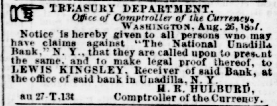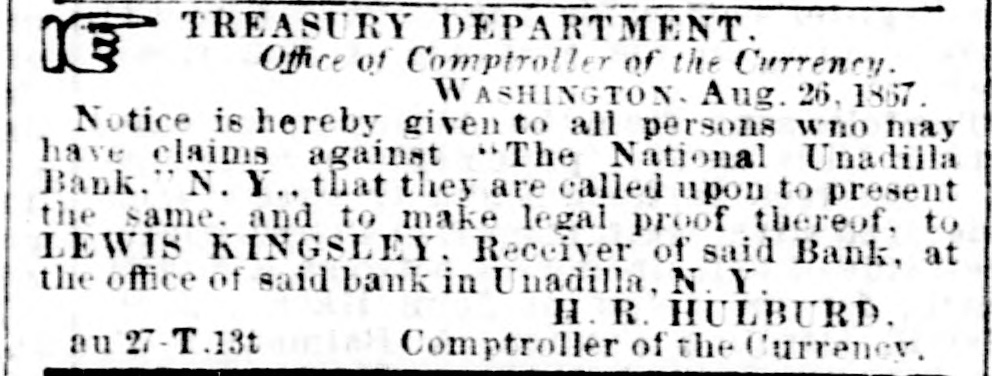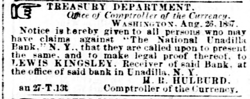 TREASURY DEPARTMENT Office of Comptroller of the Currency. WASHINGTON Aug 26,1867 Notice is hereby given to all persons who may have claims against "The National Unadilla Bank. N. Y that they are called upon to present the same. and to make legal proof thereof. to LEWIS KINGSLEY. Receiver of said Bank, at the office of said bank in Unadilla, N Y. H R. HULBURD. au 27 T .13t Comptroller of the Currency,