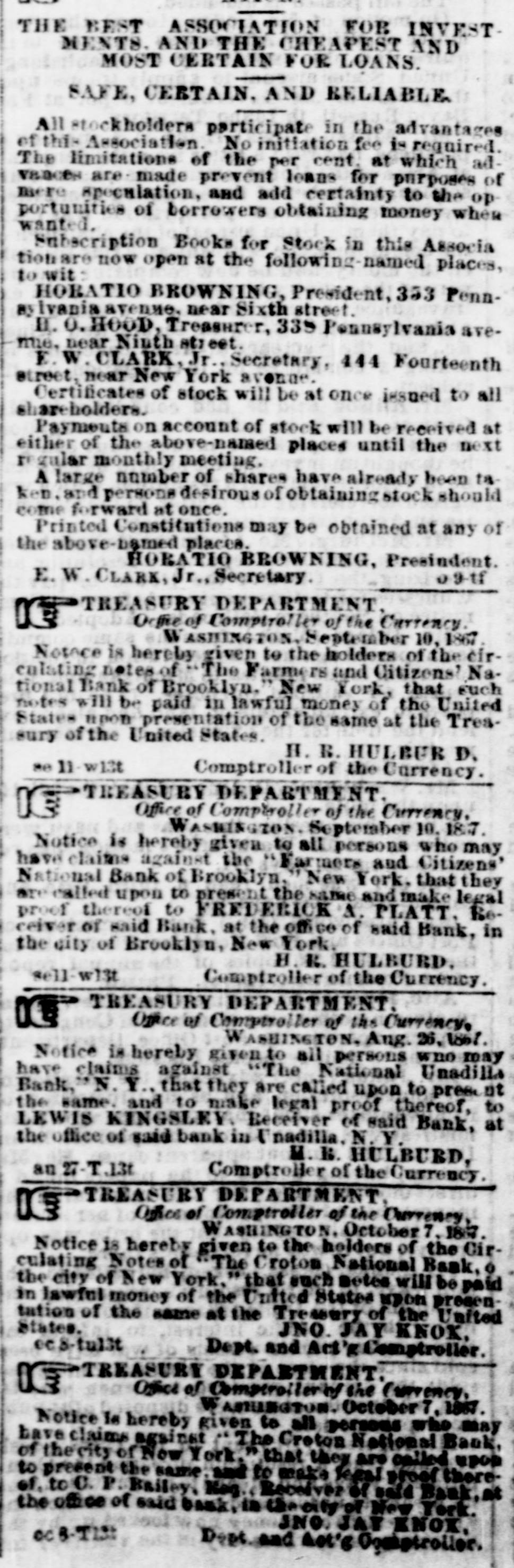THE BEST ASSOCIATION FOR INVESTMENTS. AND THE CHEAPEST AND MOST CERTAIN FOR LOANS. SAFE, CERTAIN, AND RELIABLE. All stockholders participate in the advantages of this Association. No initiation fee is required. The limitations of the per cent. at which adV80068 are made prevent loans for purposes of mere speculation, and add certainty to the op portunities wanted. of borrowers obtaining money when Subscription Books for Stock in this Associa tionare now open st the following-named places, to wit: HORATIO BROWNING, President, 353 PennBy lvania avenue. near Sixth street. II. 0. HOOD, Treasurer, 335 Pennsylvania aveme, near Ninth street. E. W. CLARK, Jr. Secretary, 444 Fourteenth street, near New York avenue. Certificates of stock will be at once issued to all shareholders. Payments on account of stock will be received at either of the above-named places until the next I' gular monthly meeting, A large number of shares have already been ta. ken. and persons desirous of obtaining stock should come forward at once. Printed Constitutions may be obtained at any of the above-bamed places. HORATIO BROWNING, Presindent. 09-tf E. W. CLARK, Jr., Secretary. TREASURY DEPARTMENT. Octive of Comptroller of the Currency, WASHINGTON, September 10, 1867. Notoce is hereby given to the holders of the circulating notes of The Farmer and Citizens! National Bank of Brooklyn, New York, that such notes will be paid in lawful money of the United States upon presentation of the same at the Treasury of the United States. H.B.HULBUR D. sell-w13t Comptroller of the Currency. TREASURY DEPARTMENT. IF Office of Comptroller of the Currency, WASHINGTON, September 10, 187. Notice is hereby given to all persons who may have claims against the "Farmers and Citizens' National Bank of Brooklyn, New York, that they are called upon to present the same and make legal proof thereof to FREDERICK &, PLATT. Receiver of said Bank, at the office of said Bank, in the city of Brooklyn, New York. H. R. HULBURD. sell-w13t Comptroller of the Currency. TREASURY DEPARTMENT. Office of Comptroller of the Currency, WASHINGTON, Aug. 26, 1801. Notice is hereby given to all persons who may have claims against "The National Unadilla Bank, N. Y., that they are called upon to pres. at the same. and to make legal proof thereof, to LEWIS KINGSLEY. Receiver of said Bank, at the office of said bank in Unadilla. N.Y. M. B. HULBURD, an 27-T .13t Comptroller of the Currency. TREASURY DEPARTMENT. 13 Office of Comptroller of the Ourrency, WASHINGTON, October 7. 187. Notice is hereby given to the holders of the Circulating Notes of The Crotom National Bank, o the city of New York, that such Betes will be paid in lawful money of the United States upon presen tation States. of the same at the Tressury of the United JNO. jay KNOK, c8-tul3t Dept. and Act'g Comptroller. TREASURY DEPARTMENT. IF Office of Comptrailerly the Currency, ASHINGTON. October?, 1867. Notice la hereby given to all persons who may have claims against The Creton National Bank, of the city of New York, that they are called upon to present the same: and to make fegal thereof, to C. P. Bailey, Keg. Receiver ofseld Bank, at the office of said bank, throity of New York. JNO. JAY KNOK, OC 8-T131 Dept and dot's Comptroller.