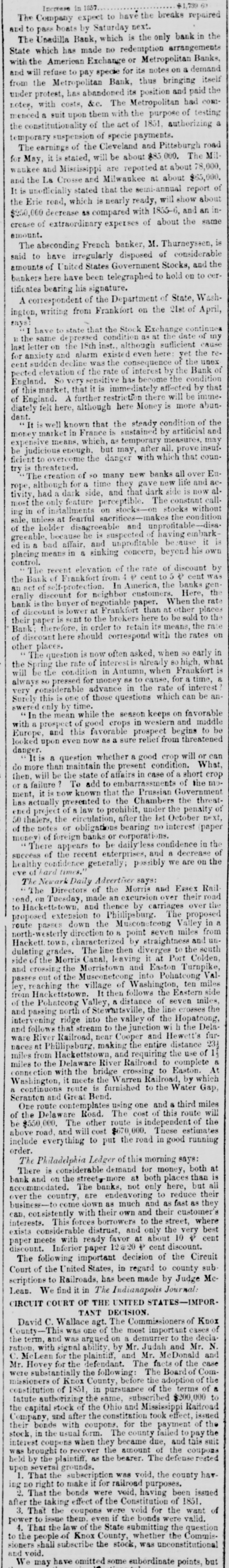 Increase in 1857 $1,739 60 The Company expect to have the breaks repaired and to pass boats by Saturday next. The Unadilla Bank, which is the only bank in the State which has made no redemption arrangements with the American Exchange or Metropolitan Banks, and will refuse to pay specie for its notes on a demand from the Metropolitan Bank, thus bringing itself under protest, has abandoned its position and paid the notes, with costs, &c. The Metropolitan had commenced a suit upon them with the purpose of testing the constitutionality of the act of 1851, authorizing a temporary suspension of specie payments. The earnings of the Cleveland and Pittsburgh road for May, it is stated, will be about $85,000. The Milwaukee and Mississippi are reported at about 78,000, and the La Crosse and Milwaukee at about $65,000. It is unofficially stated that the semi-annual report of the Erie road, which is nearly ready, will show about $250,000 decrease as compared with 1855-6, and an increase of extraordinary experses of about the same amount. The absconding French banker, M. Thurneyssen, is said to have irregularly disposed of considerable amounts of United States Government Stocks, and the bankers here have been telegraphed to hold on to certificates bearing his signature. A correspondent of the Department of State, Washington, writing from Frankfort on the 21st of April, enys! I have to state that the Stock Exchange continues in the same depressed condition as at the date of my last letter on the 18th inst., although sufficient cause for anxiety and alarm existed even here: yet the recent sudden decline was the consequence of the unexpected elevation of the rate of interest by the Bank of England. So very sensitive has become the condition of this market, that it is immediately affected by that of England. A further restriction there will be immediately felt here, although here Money is more abundant. "It is well known that the steady condition of the money market in France is sustained by artificial and expensive means, which, as temporary measures, may be judicious enough, but may, after all, prove insufficient to overcome the danger with which that country is threatened. "The creation of so many new banks all over Europe, although for a time they gave new life and activity, had a dark side, and that dark side is now almost the only feature perceptible. The constant calling in of installments on stocks-on stocks without sale, unless at fearful sacrifices-makes the condition of the holder disagreeable and unprofitable-disagreeable, because he is suspected of having embarked in a bad affair, and unprofitable because it is placing means in a sinking concern, beyond his own control. "The recent elevation of the rate of discount by the Bank of Frankfort from 4 cent to 5 cent was an act of self-protection. In America, the banks generally discount for neighbor customers. Here, the bank is the buyer of negotiable paper. When the rate of discount is lower at Frankfort than at other places their paper is sent to the brokers here to be sold to the Bank; therefore, in order to retain its means, the rate of discount here should correspond with the rates on other places. "The question is now often asked, when so early in the Spring the rate of interest is already so high, what will be the condition in Autumn, when Frankfort is always so pressed for money as to cause, for a time, a very considerable advance in the rate of interest? Surely this is one of those questions which can be answered only by time. "In the mean while the season keeps on favorable with a prospect of good crops in western and middle Europe, and this favorable prospect begins to be looked upon even now as a sure relief from threatened danger. "It is a question whether a good crop will or can do more than maintain the present condition, What, then, will be the state of affairs in case of a short crop or a failure? To add to embarrassments of the moment, it is now known that the Prussian Government has actually presented to the Chambers the threatened project of a law to prohibit, under the penalty of 50 thalers, the circulation, after the 1st October next, of the notes or obligations bearing no interest (paper money) of foreign banks or corporations. "There appears to be daily less confidence in the success of the recent enterprises, and a decrease of healthy confidence generally; possibly we are on the eve of hard times." The Newark Daily Advertiser says: "The Directors of the Morris and Essex Railroad, on Tuesday, made an excursion over their road to Hackettstown, and thence by carriages over the proposed extension to Phillipsburg. The proposed route passes down the Musconetcong Valley in a north-westerly direction to a point seven miles from Hackett, town, characterized by straightness and undulating grades. The line then diverges to the south side of the Morris Canal, leaving it at Port Colden, and crossing the Morristown and Easton Turnpike, passes out of the Musconetcong into Pohatcong Valley, reaching the village of Washington, ten miles from Hackettstown. It then follows the Eastern side of the Pohatcong Valley, a distance of seven miles, and passing north of Stewartsville, the line crosses the intervening ridge into the valley of the Hopatcong, and follows that stream to the junction with the Delaware River Railroad, near Cooper and Hewett's furnaces at Phillipsburg, making the entire distance 231 miles from Hackettstown, and requiring the use of 15 miles to the Delaware River Railroad to complete a connection with the bridge crossing to Easton. At Washington, it meets the Warren Railroad, by which a continuons route is furnished to the Water Gap, Scranton and Great Bend. One route contemplates using one and a third miles of the Delaware Road. The cost of this route will be $550,000, The other route is independent of the above road, and will cost $670,000. These estimates include everything to put the road in good running order. The Phila