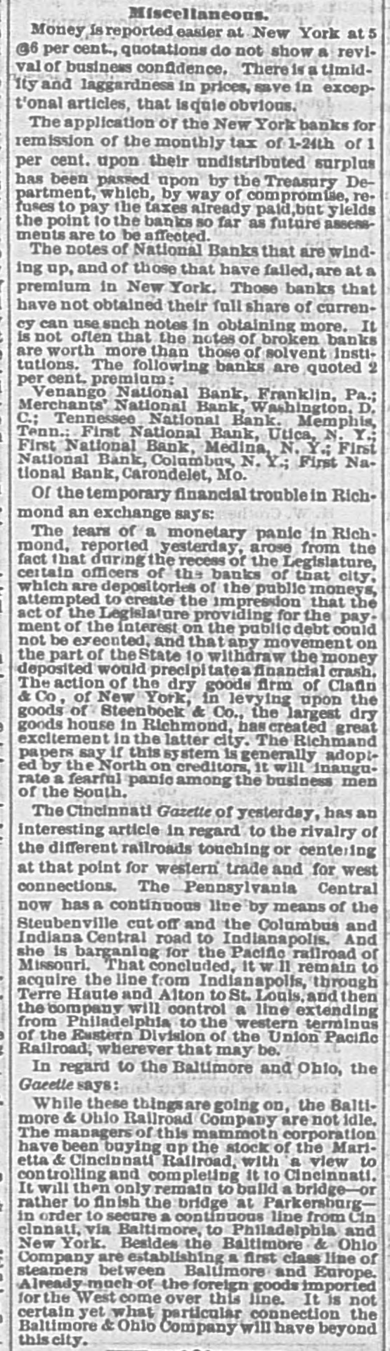 Miscellaneous. Money is reported easier at New York at 5 @6 per cent., quotations do not show a revival of business confidence. There is a timidity and laggardness in prices, save in exceptional articles, that is quie obvious. The application of the New York banks for remission of the monthly tax of 1-24th of 1 per cent. upon their undistributed surplus has been passed upon by the Treasury Department, which, by way of compromise, refuses to pay the taxes already paid, but yields the point to the banks so far as future assessments are to be affected. The notes of National Banks that are winding up, and of those that have failed, are at a premium in New York. Those banks that have not obtained their full share of currency can use such notes in obtaining more. It is not often that the notes of broken banks are worth more than those of solvent institutions. The following banks are quoted 2 per cent, premium: Venango National Bank, Franklin, Pa.; Merchants' National Bank, Washington, D. C.; Tennessee National Bank. Memphis, Tenn.; First National Bank, Utica, N. Y.; First National Bank, Medina, N. Y.; First National Bank, Columbus, N. Y.; First National Bank, Carondelet, Mo. Of the temporary financial trouble in Richmond an exchange says: The tears of a monetary panic in Richmond, reported yesterday, arose from the fact that during the recess of the Legislature, certain officers of the banks of that city, which are depositories of the public moneys, attempted to create the impression that the act of the Legislature providing for the payment of the interest on the public debt could not be executed, and that any movement on the part of the State to withdraw the money deposited would precipitate a financial crash. The action of the dry goods firm of Clafin & Co, o, of New York, in levying upon the goods of Steenbock & Co., the largest dry goods house in Richmond, has created great excitement in the latter city. The Richmand papers say if this system is generally adopted by the North on creditors, it will inaugu-rate a fearful panic among the business men of the South. The Cincinnati Gazette of yesterday, has an interesting article in regard to the rivalry of the different railroads touching or centering at that point for western trade and for west connections. The Pennsylvania Central now has a continuous line by means of the Steubenville cut off and the Columbus and Indiana Central road to Indianapolis. And she is barganing for the Pacific railroad of Missouri. That concluded, it will remain to acquire the line from Indianapolis, through Terre Haute and Alton to St. Louis, and then the company will control a line extending from Philadelphia to the western terminus of the Eastern Division of the Union Pacific Railroad, wherever that may be. In regard to the Baltimore and Ohio, the Gacette says: While these things are going on, the Baltimore & Ohio Railroad Company are not idle. The managers of this mammoth corporation have been buying up the stock of the Marietta & Cincinnati Railroad, with a view to controlling and completing it to Cincinnati. It will then only remain to build a bridge-or rather to finish the bridge at Parkersburg-in order to secure a continuous line from Cincinnati, via Baltimore, to Philadelphia and New York. Besides the Baltimore & Ohio Company are establishing a first class line of steamers between Baltimore and Europe. Already much of the foreign goods imported for the West come over this line. It is not certain yet what particular connection the Baltimore & Ohio Company will have beyond this city.