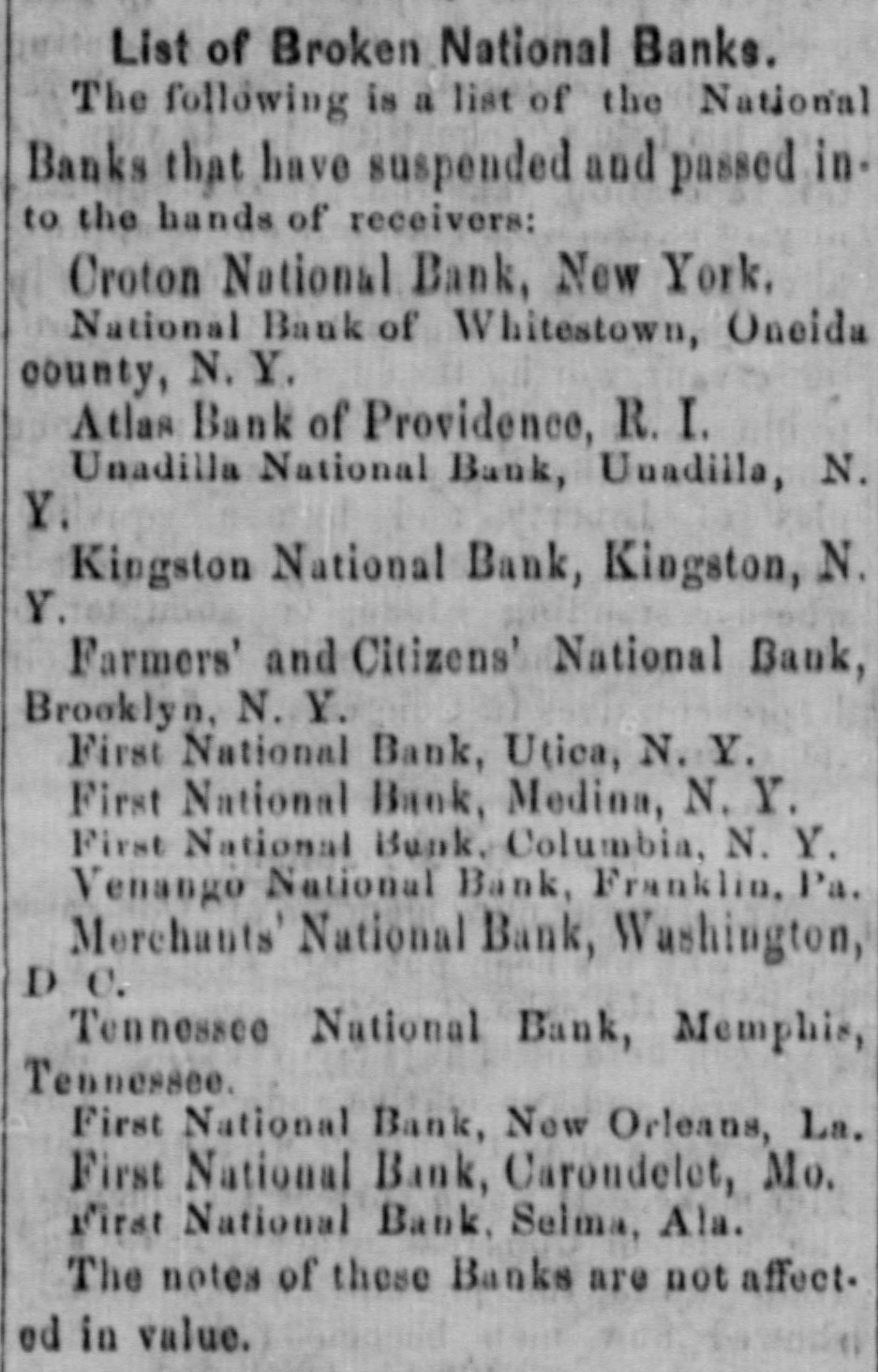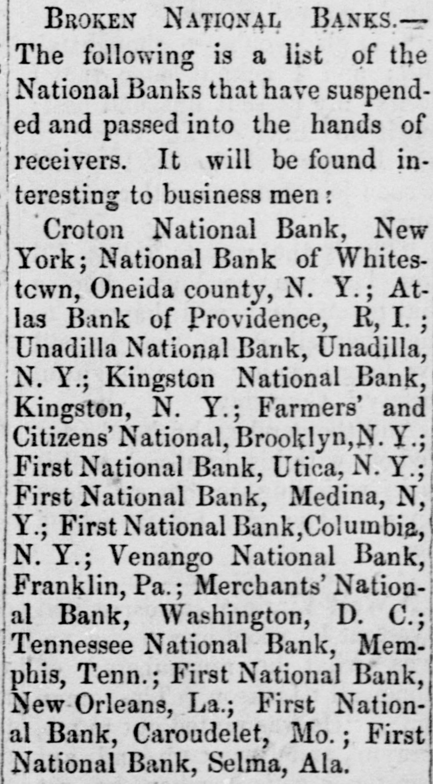 NATIONAL BANKS SUSPENDED.-The following National Banks have passed into the hands of Receivers: Croton National Bank, N. Y. National Bank of W bitestown, Oneida county, N. Y. Atlas Bank, of Providence, R. I. Unadilla National Bank, Unadilla, New York. Kingston National Bank, Kingston, New York. Farmers' and Citizens' National Bank, Brooklyn, N. Y. First National Bank, Utica, N. Y. First National Bank, Medina, N.Y. First National Bank, Columbia, N.Y. Venango National Bank, Franklin, Pennsylvania. Merchants' National Bank, Washington, D. C. Tennessee National Bank, Memphis, Tennessee. First National Bank, New Orleans, Louisiana. First National Bank, Carondelet, Missouri. First National Bank, Selma, Alabama.