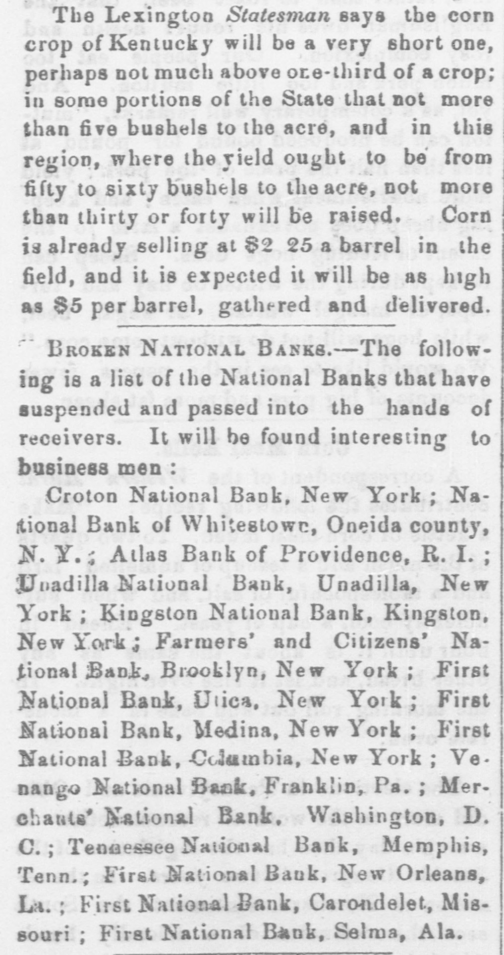 The Lexington Statesman says the corn crop of Kentucky will be a very short one, perhaps not much above one-third of a crop; in some portions of the State that not more than five bushels to the acre, and in this region, where the yield ought to be from fifty to sixty bushels to the acre, not more than thirty or forty will be raised. Corn is already selling at $2 25 a barrel in the field, and it is expected it will be as high as $5 per barrel, gathered and delivered. BROKEN NATIONAL Banks.--The following is a list of the National Banks that have suspended and passed into the hands of receivers. It will be found interesting to business men : Croton National Bank, New York ; National Bank of Whitestowc, Oneida county, N. Y. : Atlas Bank of Providence, R.I.; Unadilla National Bank, Unadilla, New York ; Kingston National Bank, Kingston, New York; Farmers' and Citizens' National Bank, Brooklyn, New York ; First National Bank, Urica, New York; First National Bank, Medina, New York ; First National Bank, Columbia, New York ; Ve. nango National Bank, Franklin, Pa.; Merchants' National Bank. Washington, D. C. ; Tennessee National Bank, Memphis, Tenn.; First National Bank, New Orleans, La. First National Bank, Carondelet, Missouri; First National Bank, Selma, Ala.