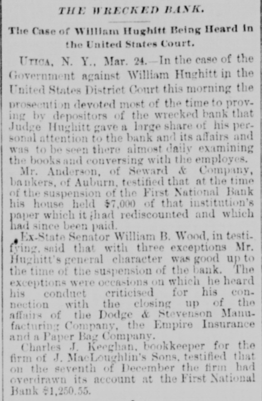 THE WRECKED BANK. The Case of William Hughitt Being Heard in the United States Court. UTICA, N. Y., Mar. 24. In the case of the Government against William Hughitt in the United States District Court this morning the prosecution devoted most of the time to proving by depositors of the wrecked bank that Judge Hughitt gave a large share of his personal attention to the bank and its affairs and was to be seen there almost daily examining the books and conversing with the employes. Mr. Anderson, of Seward & Company, bankers. of Auburn, testified that at the time of the suspension of the First National Bank his house held $7,000 of that institution's paper which it ;had rediscounted and which had since been paid. Ex- -State Senator William B. Wood, in testifying. said that with three exceptions Mr. Hughitt's general character was good up to the time of the suspension of the bank. The exceptions were occasions on which he heard his conduct criticised for his connection with the closing up of the affairs of the Dodge & Stevenson Manufacturing Company, the Empire Insurance and a Paper Bag Company. Charles J. Keeghan, bookkeeper for the firm of J. MaeLoughlin's Sons, testified that on the seventh of December the firm had overdrawn its account at the First National Bank $1,250.55.