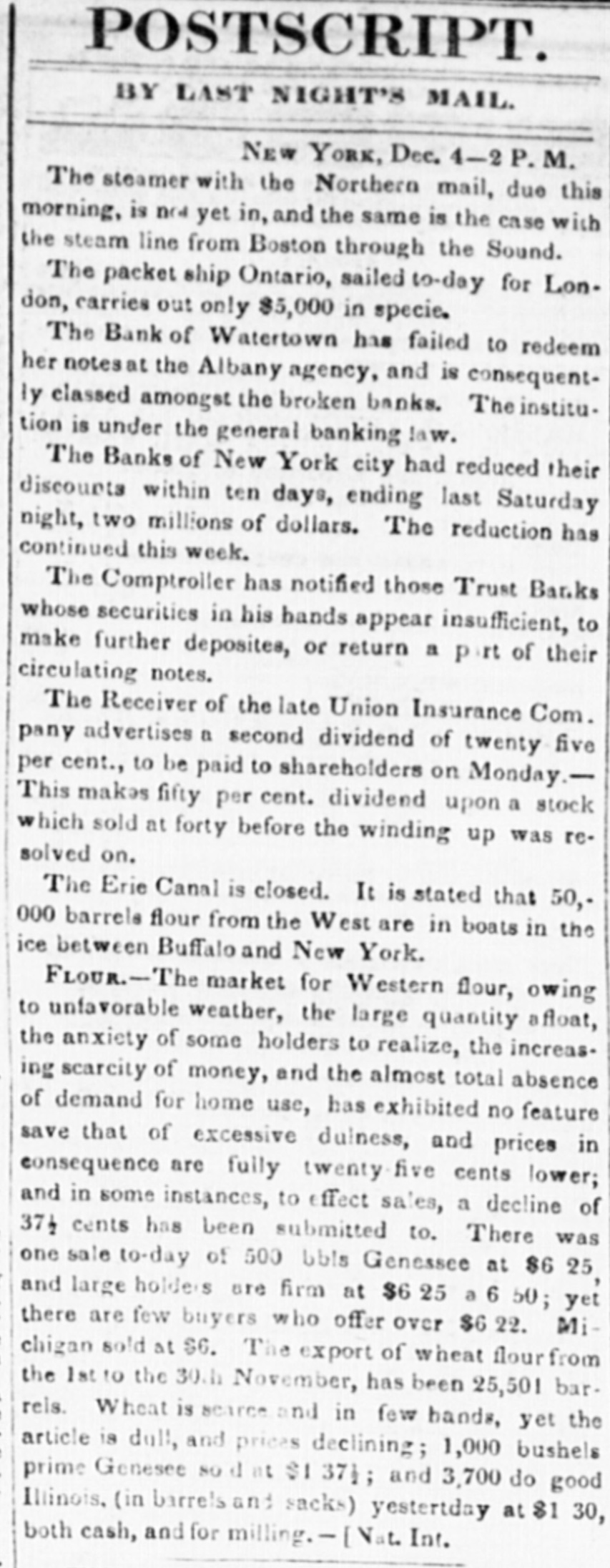 POSTSCRIPT. BY LAST NIGHT'S MAIL. NEW YORK, Dec. 4-2 P.M. The steamer with the Northern mail, due this morning, is nct yet in, and the same is the case with the steam line from Boston through the Sound. The packet ship Ontario, sailed to-day for London, carries out only $5,000 in specie. The Bank of Watertown has failed to redeem her notes at the Albany agency, and is consequently classed amongst the broken banks. The institu. tion is under the general banking law. The Banks of New York city had reduced their discounts within ten days, ending last Saturday night, two millions of dollars. The reduction has continued this week. The Comptroller has notified those Trust Banks whose securities in his hands appear insufficient, to make further deposites, or return a part of their circulating notes. The Receiver of the late Union Insurance Com. pany advertises a second dividend of twenty five per cent., to be paid to shareholders on Monday.This makes fifty per cent. dividend upon a stock which sold at forty before the winding up was resolved on. The Erie Canal is closed. It is stated that 50,000 barrels flour from the West are in boats in the ice between Buffalo and New York. FLOUR.-The market for Western flour, owing to unfavorable weather, the large quantity afloat, the anxiety of some holders to realize, the increas. ing scarcity of money, and the almost total absence of demand for home use, has exhibited no feature save that of excessive dulness, and prices in consequence are fully twenty-five cents lower; and in some instances, to effect sales, a decline of 371 cents has been submitted to. There was one sale to-day of 500 bbls Genessee at $6 25 and large holders are firm at $6 25 a 6 50; yet there are few buyers who offer over $6 22. Michigan sold at $6. The export of wheat flour from the 1st 10 the 30.h November, has been 25,501 bar. reis. Wheat is searce and in few hands, yet the article is dull, and prices declining; 1,000 bushels prime Genesee sad at SI 1371; and 3,700 do good Illinois, (in barrels and sacks) yestertday at $1 30, both cash, and for milling. - [ Nat. Int.